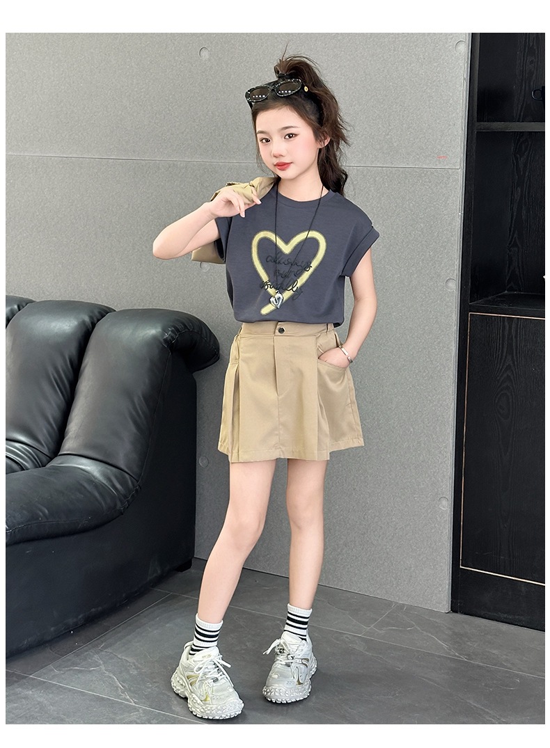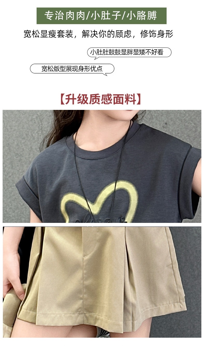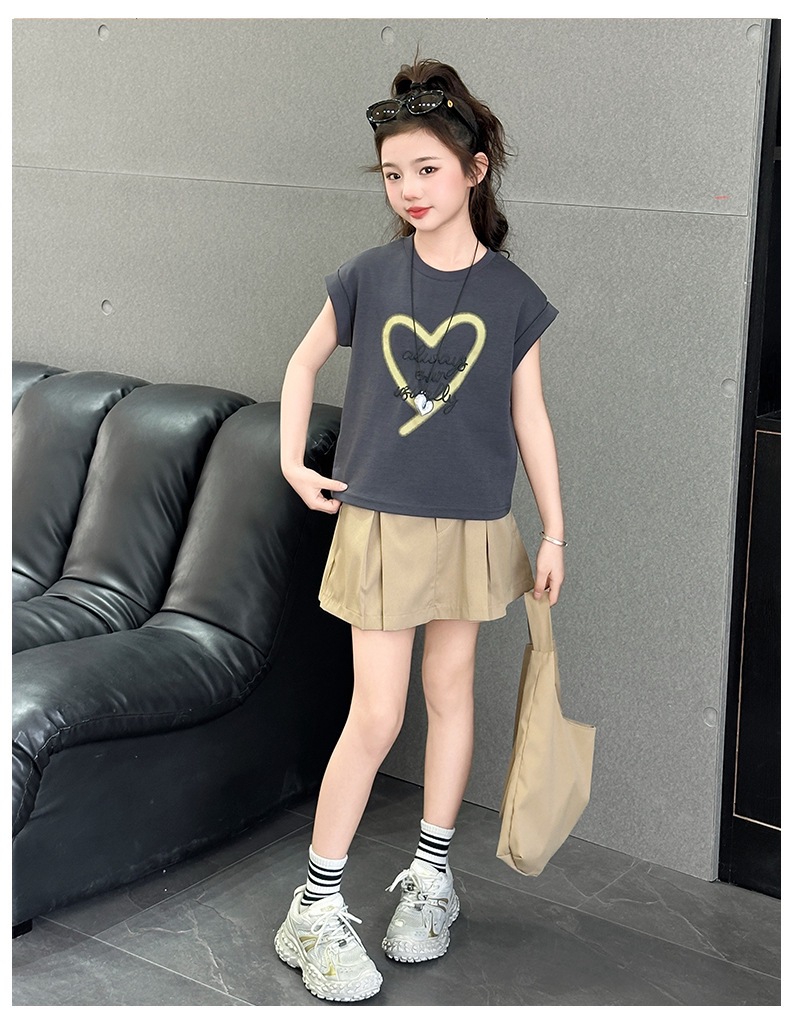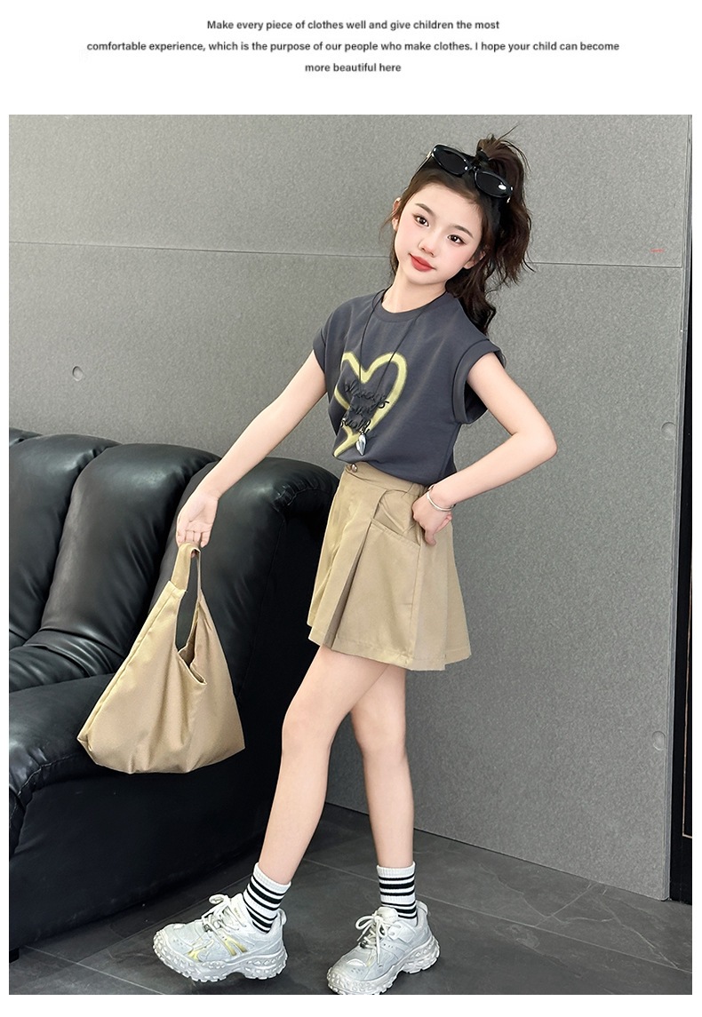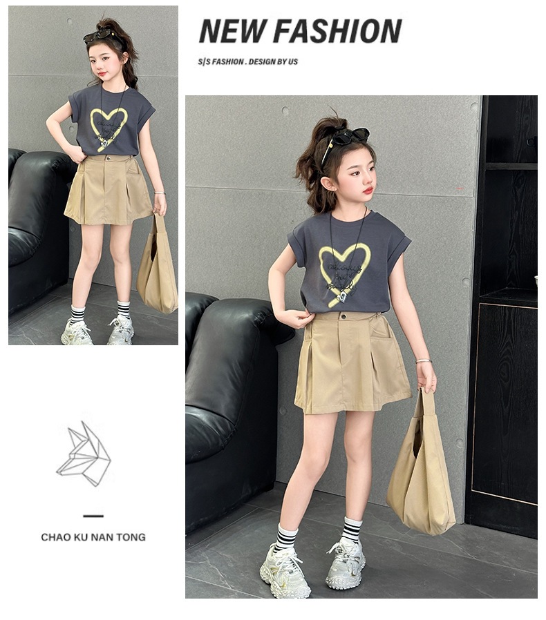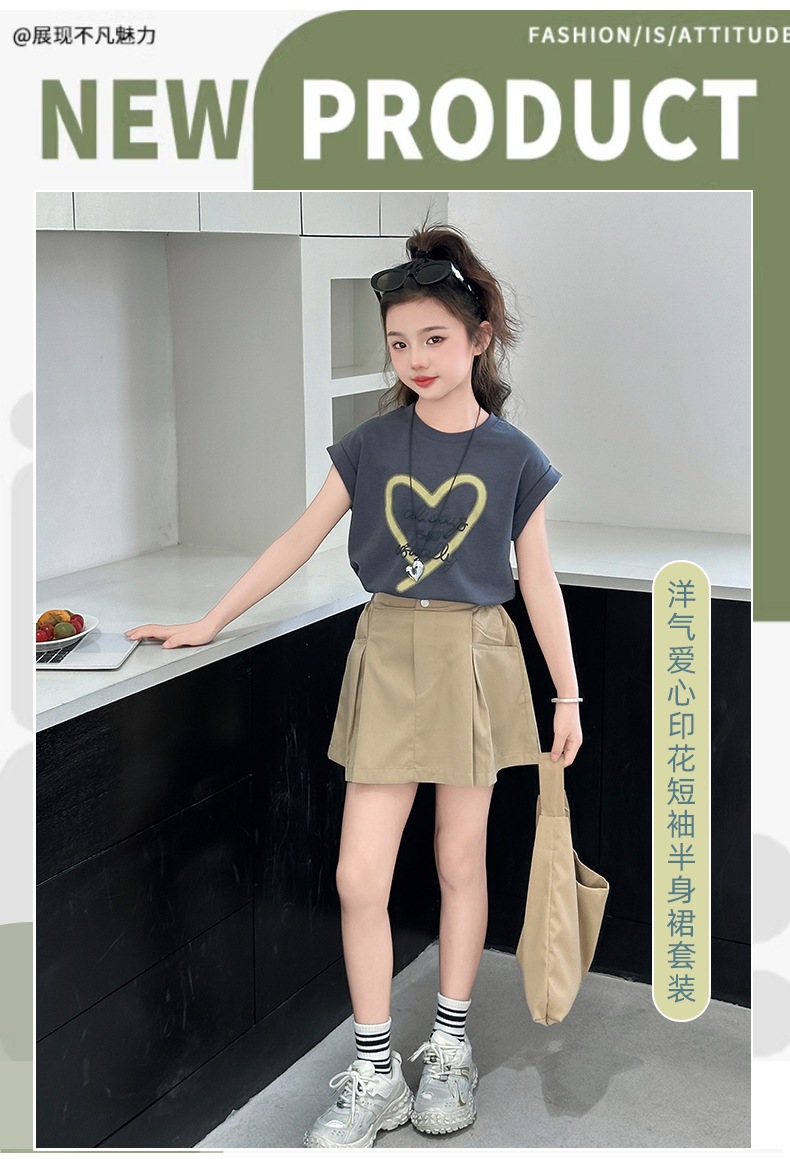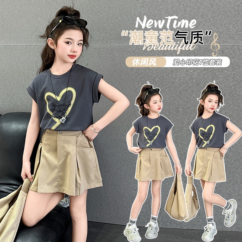 여자 반팔 양복 2025 새로운 어린이 인쇄 사랑 반팔 티셔츠 여자 스커트 투피스 세트