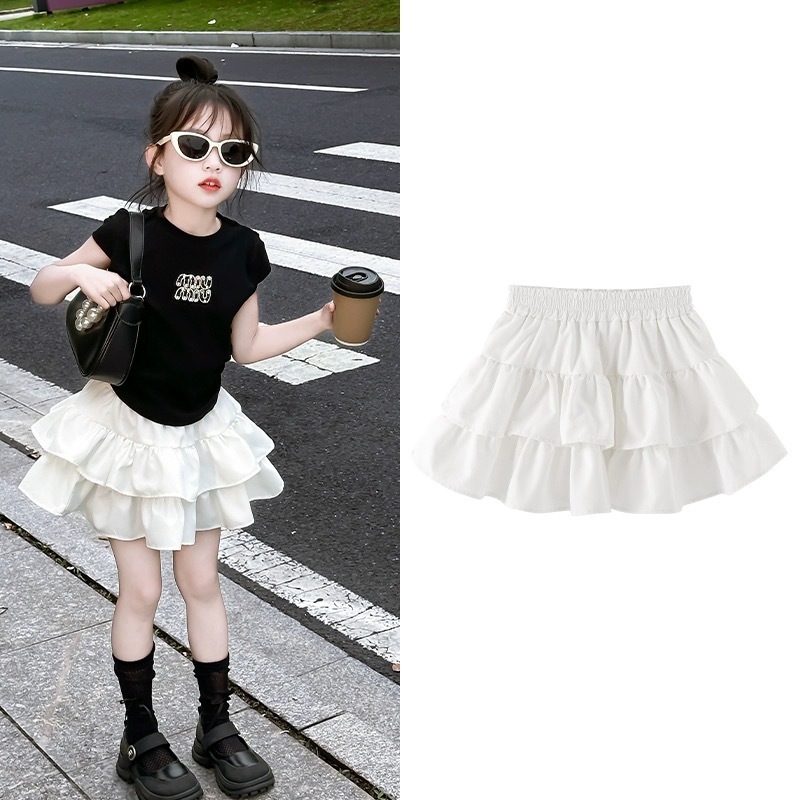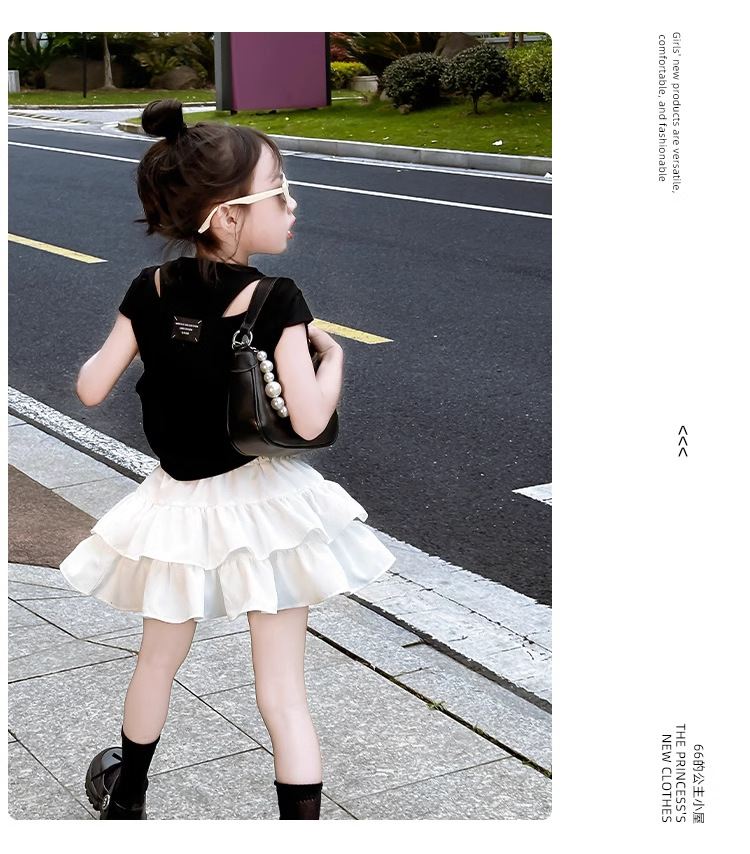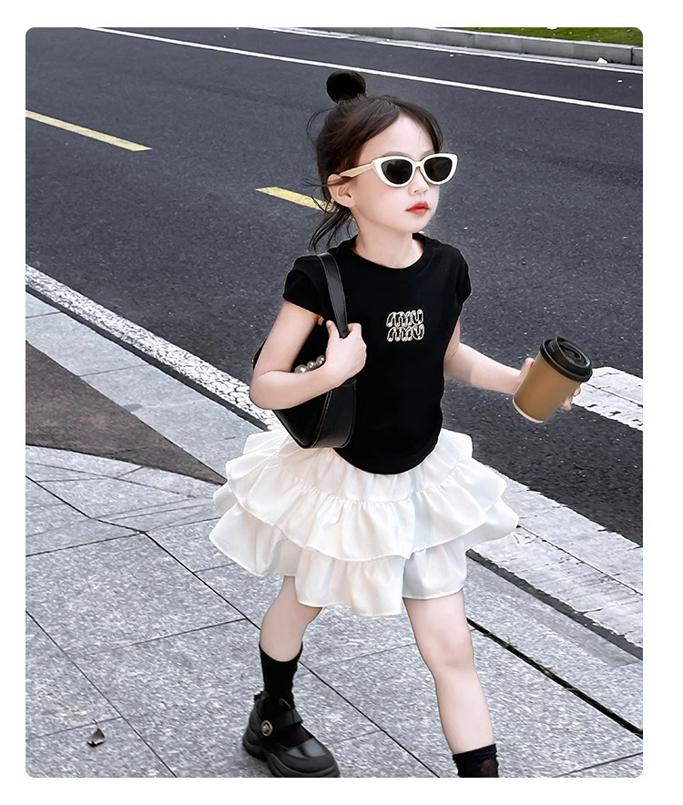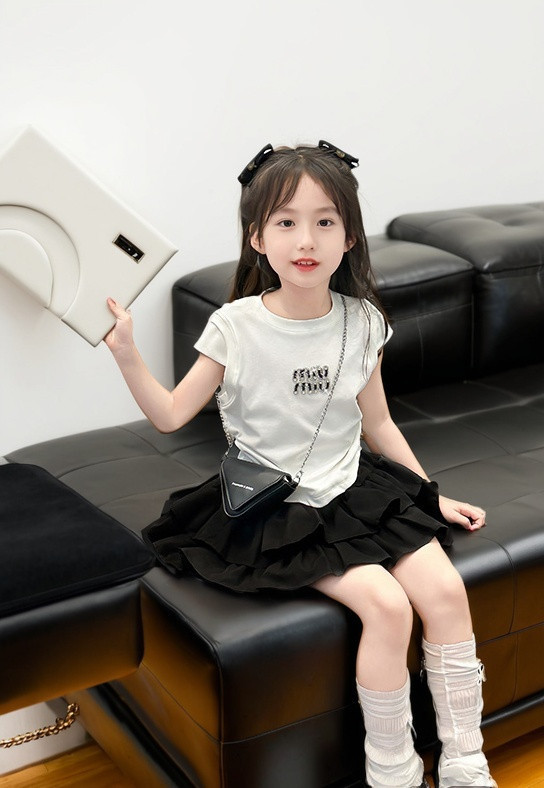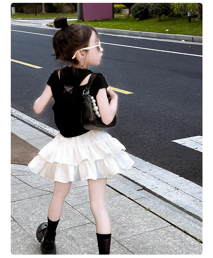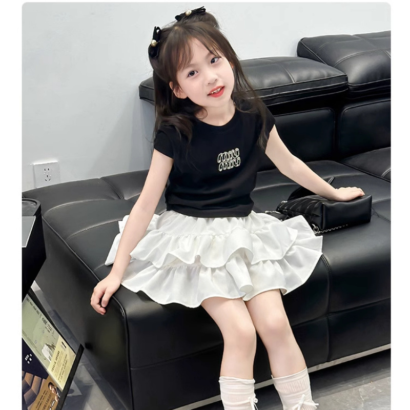 여자 여름 정장 2025 새로운 어린이 케이크 스커트 유행 반팔 티셔츠 유행 주름 스커트 투피스 세트
