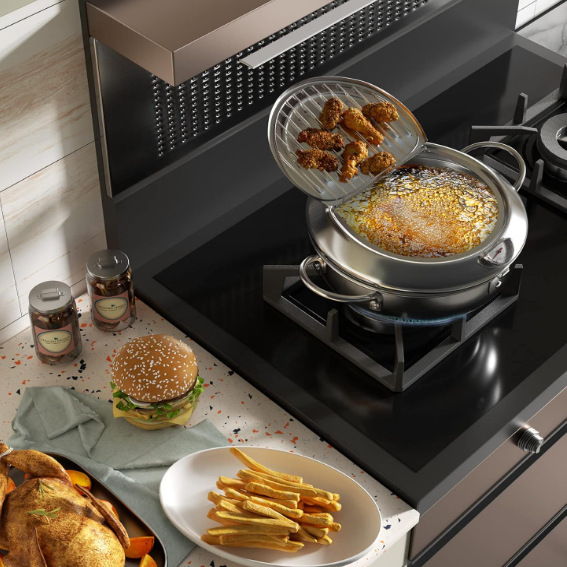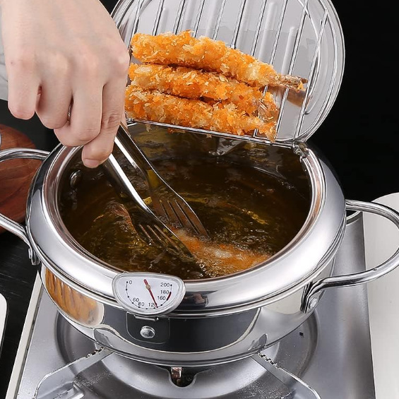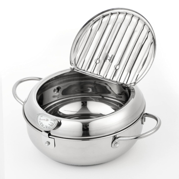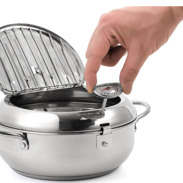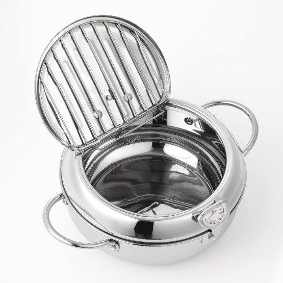 304 스테인레스 스틸 튀김 냄비 가정용 연료 절약 및 필터링 가능한 오일 일본 튀김 냄비 뚜껑 및 온도 조절기 포함