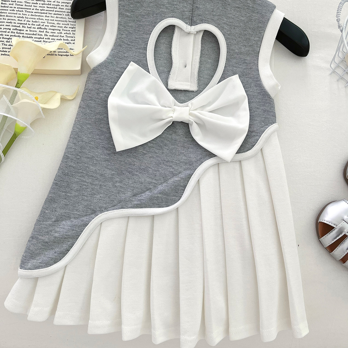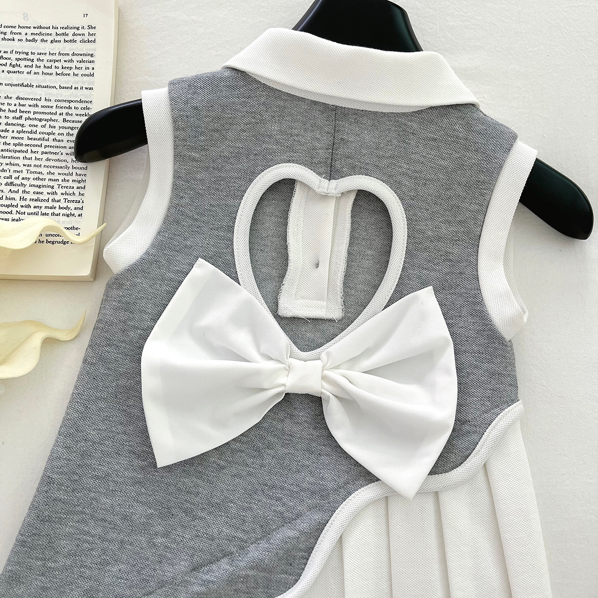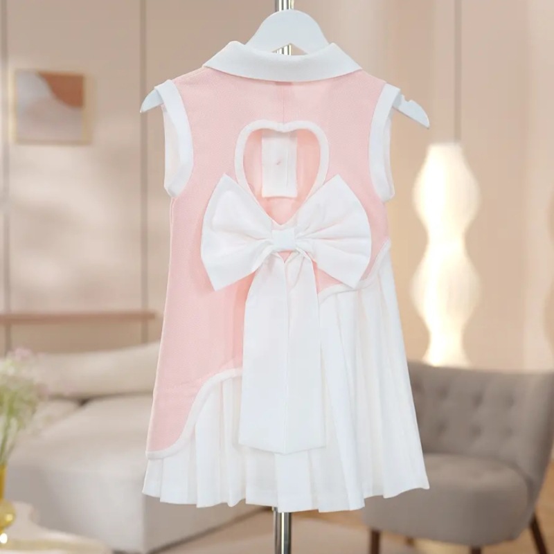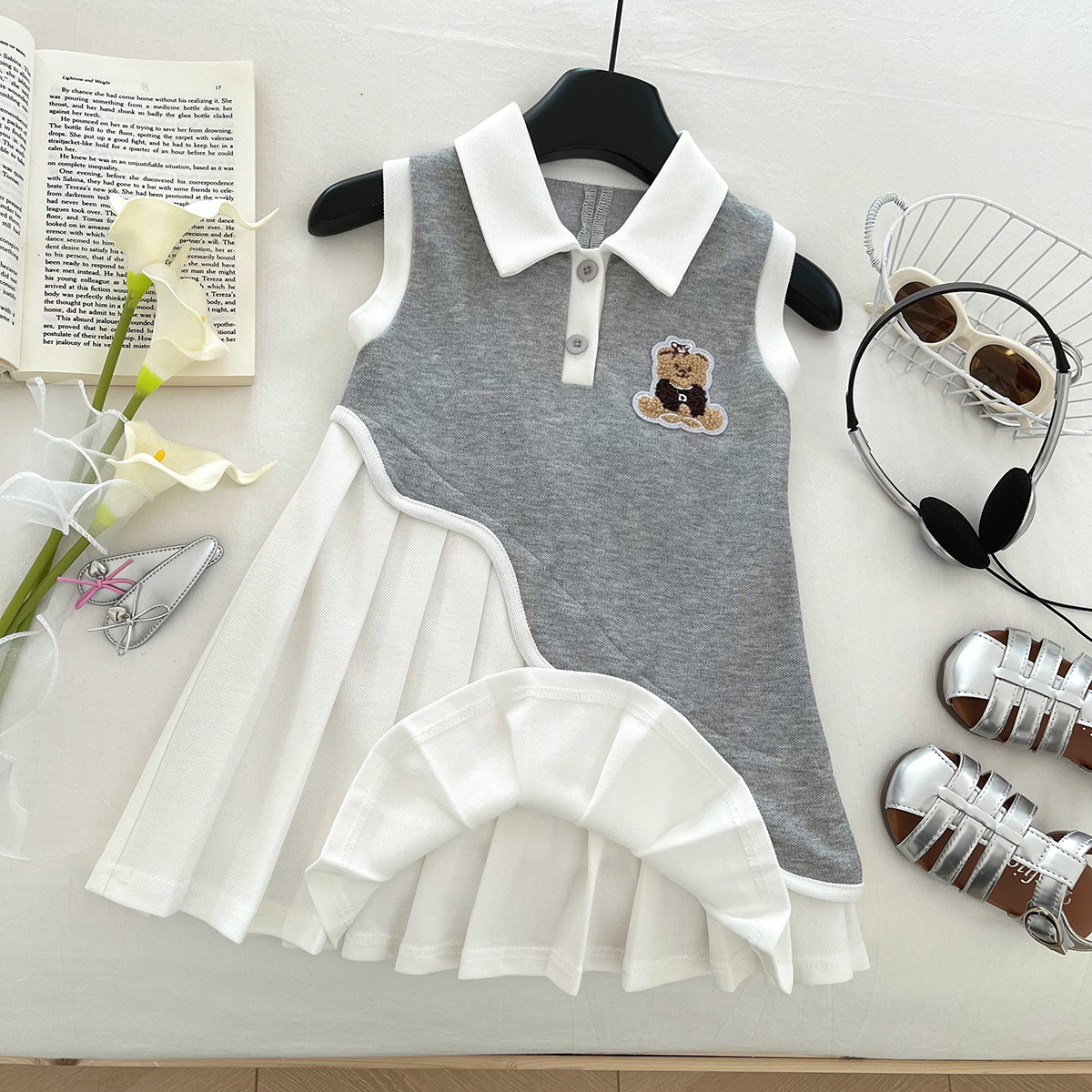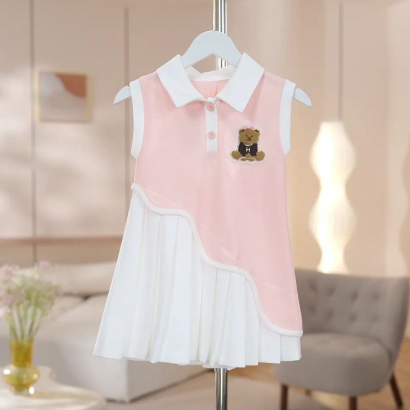 2025 새로운 여름 소녀 유행 드레스, 패셔너블한 대학 스타일 만화 곰 폴로 칼라 스플 라이스 조끼 드레스