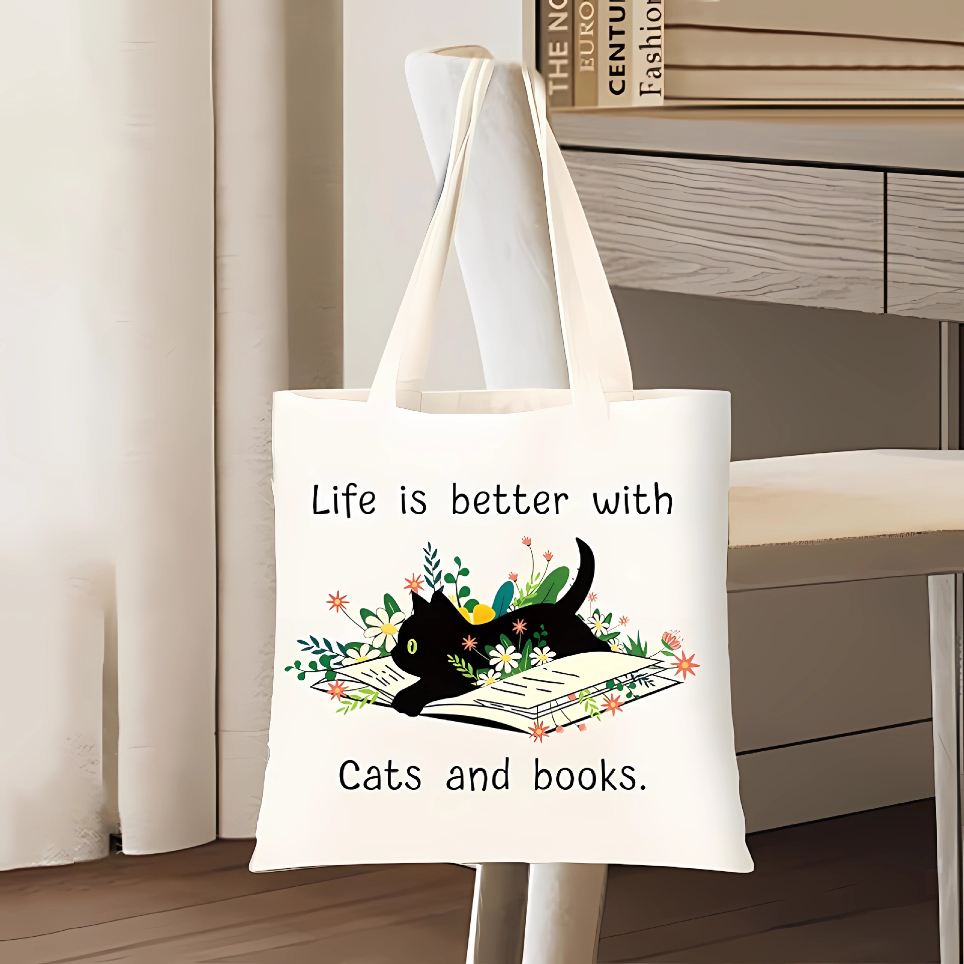 귀여운 고양이 캔버스 토트 백 검은 고양이 꽃 책 비치 가방 식료품 가방 고양이 애호가를위한 생일 선물