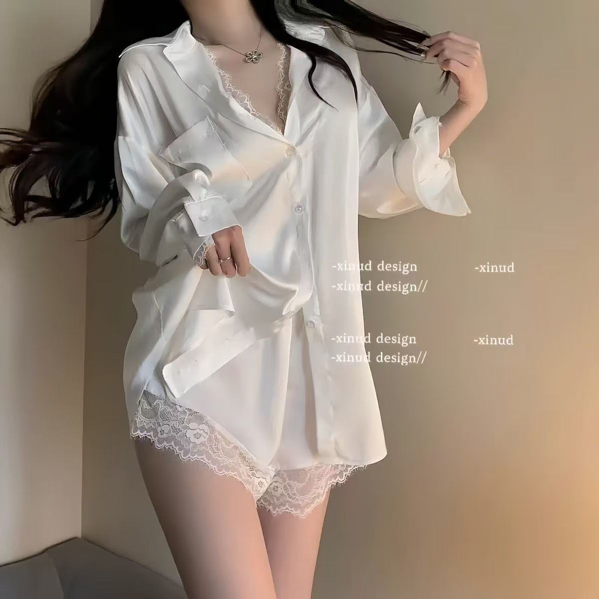 남자 친구 스타일 셔츠 얼음 실크 섹시한 대형 잠옷 순수한 욕망 여성 레이스 새틴 가짜 투피스 잠옷 홈웨어 702스토어 가기