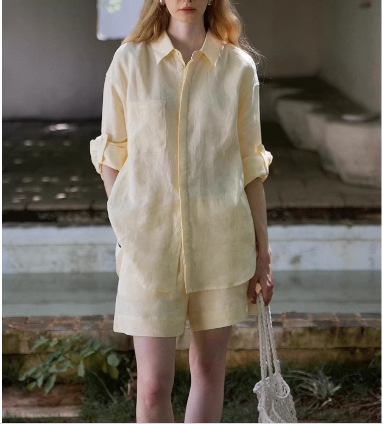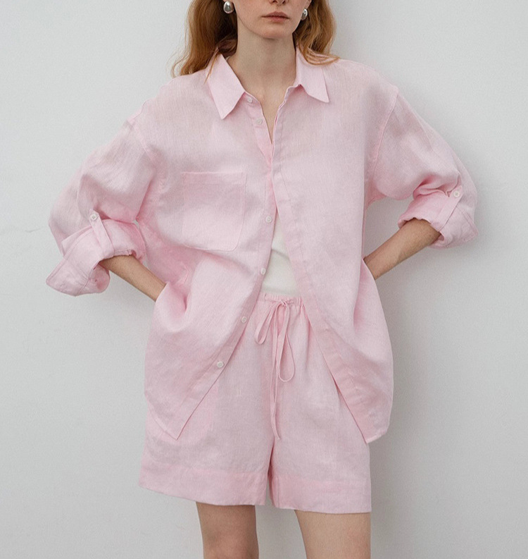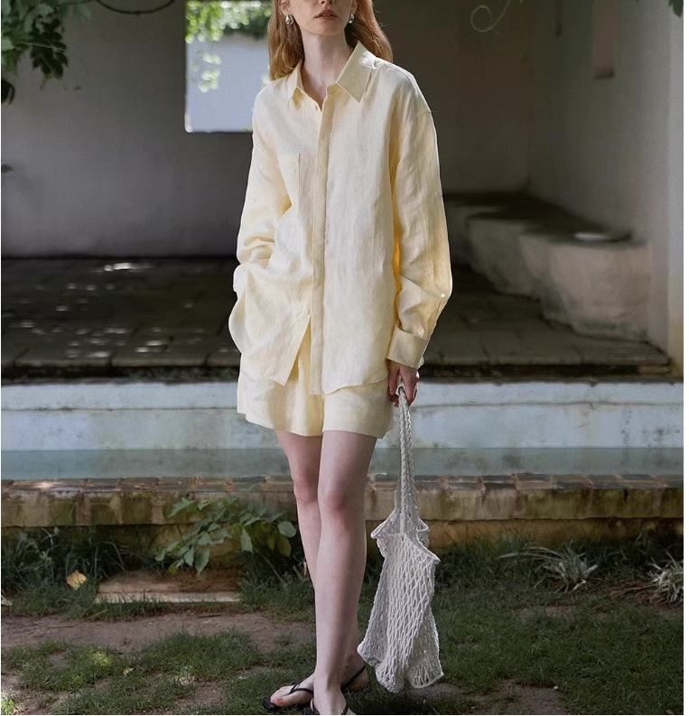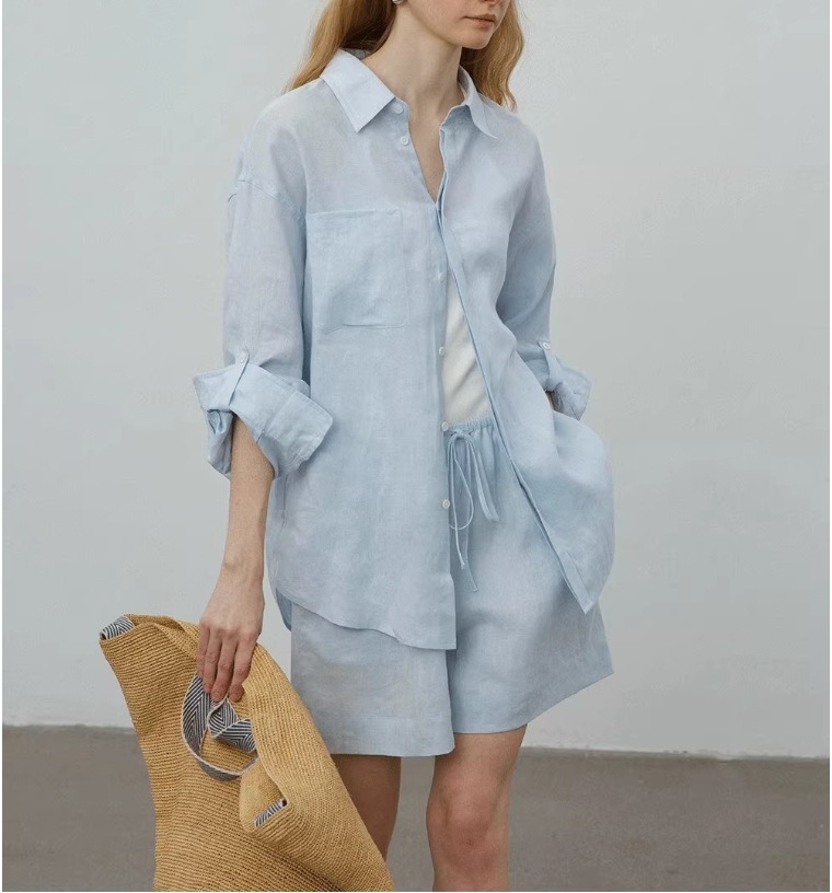 화이트 올드 머니 스타일 린넨 긴팔 셔츠 여성 여름 얇은 고급스러운 면마 셔츠 반바지 자외선 차단 세트