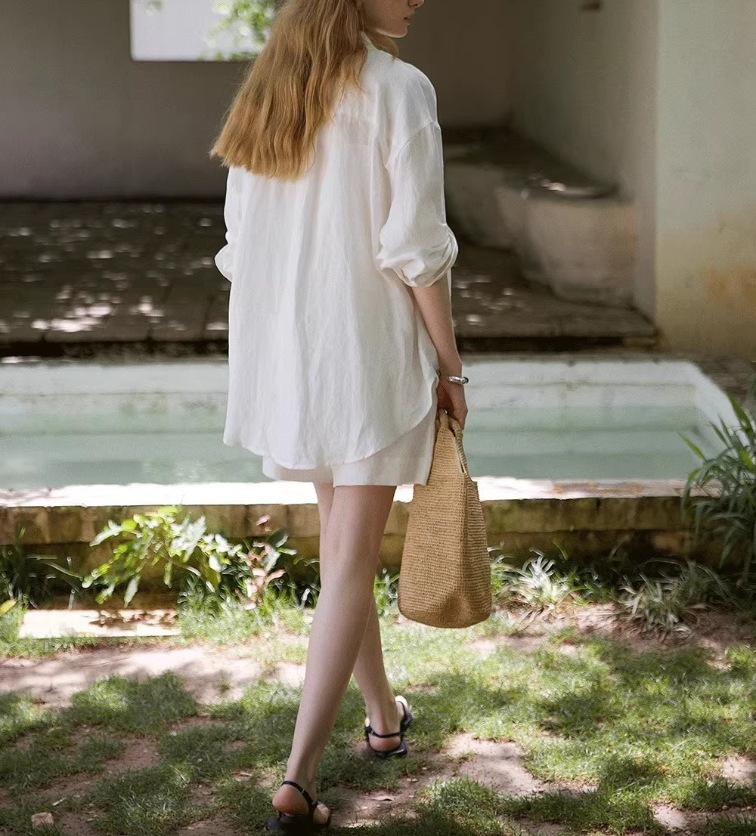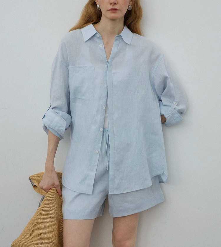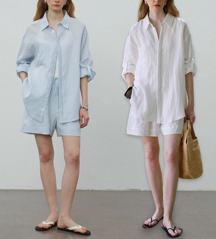 화이트 올드 머니 스타일 린넨 긴팔 셔츠 여성 여름 얇은 고급스러운 면마 셔츠 반바지 자외선 차단 세트스토어 가기