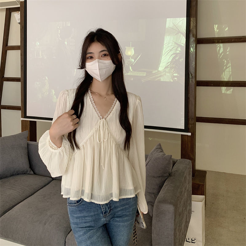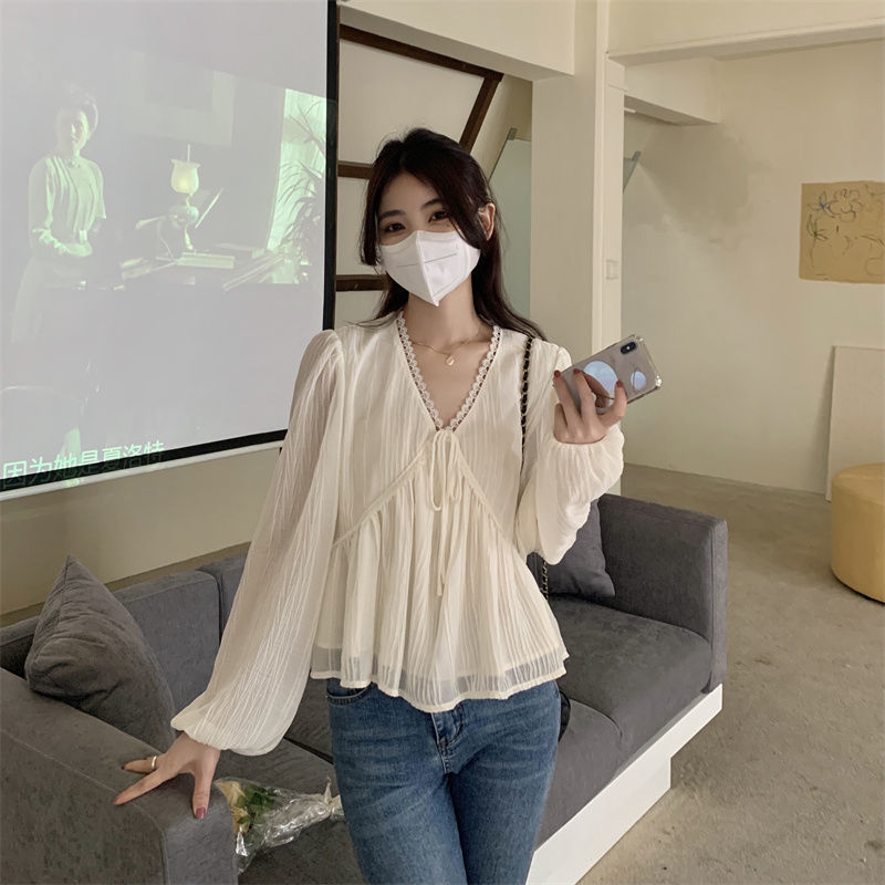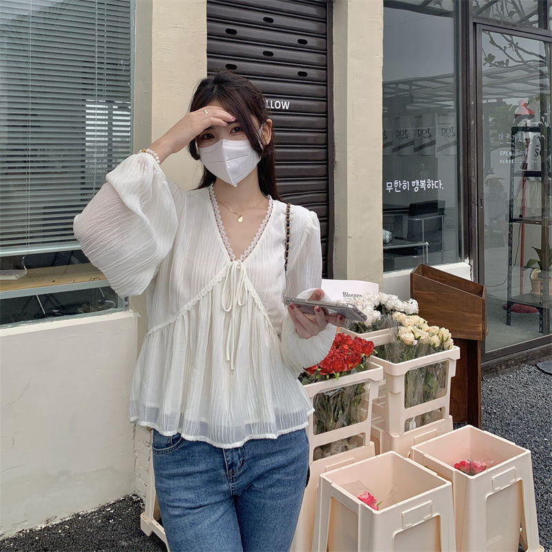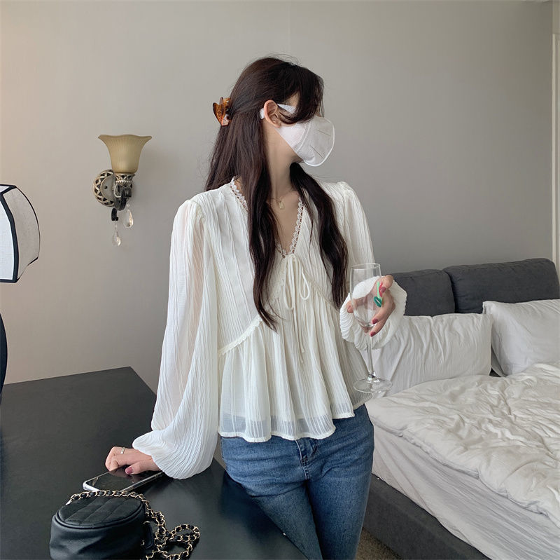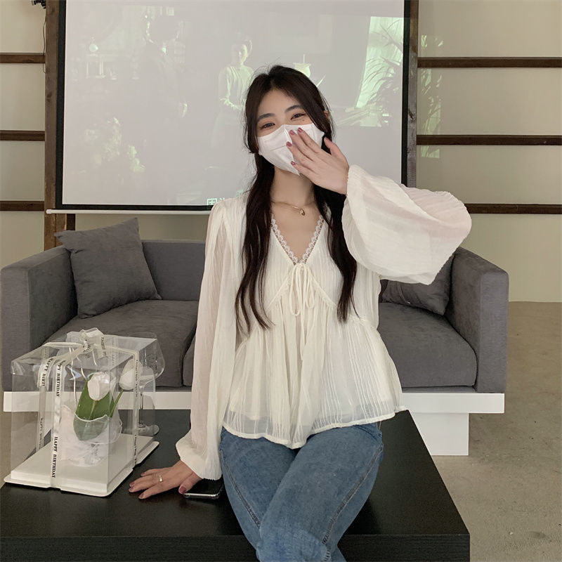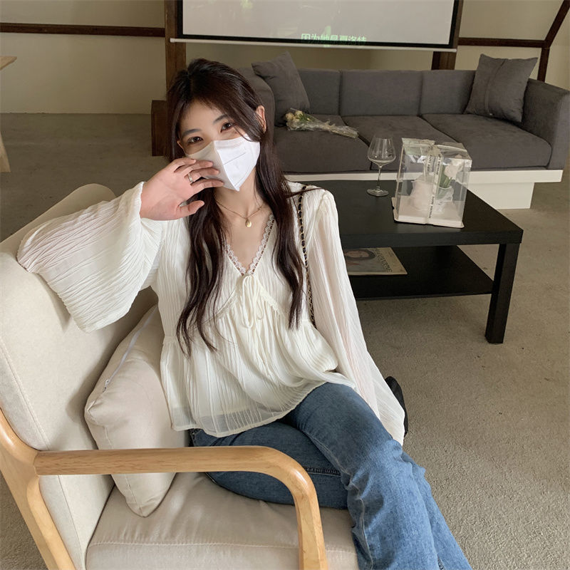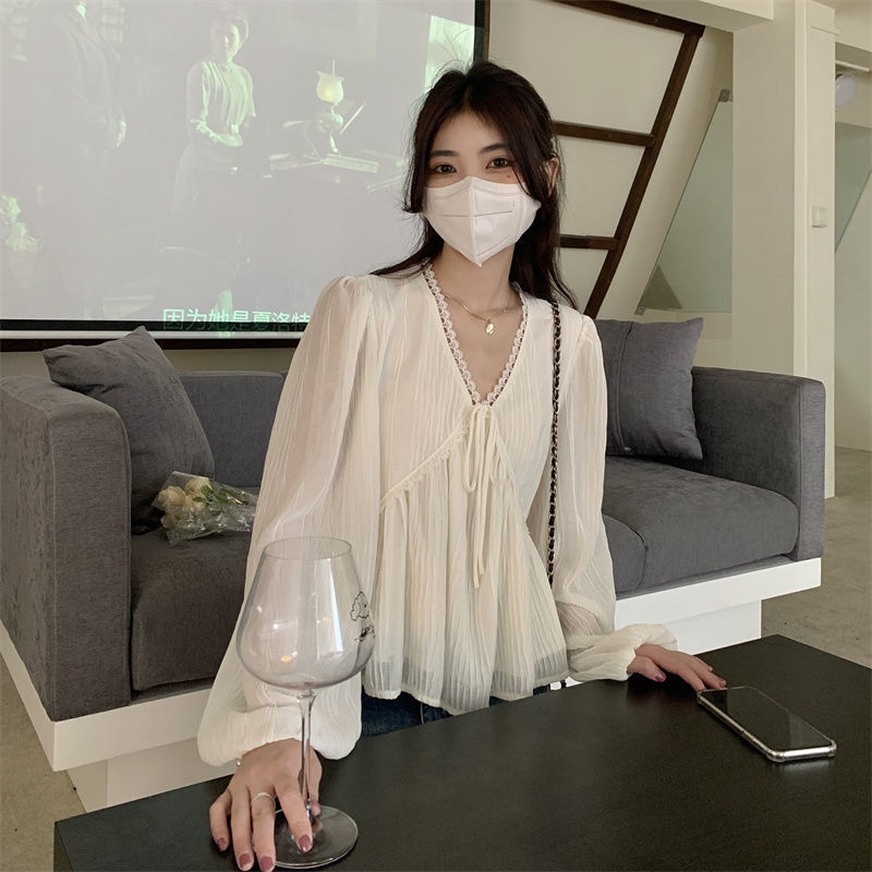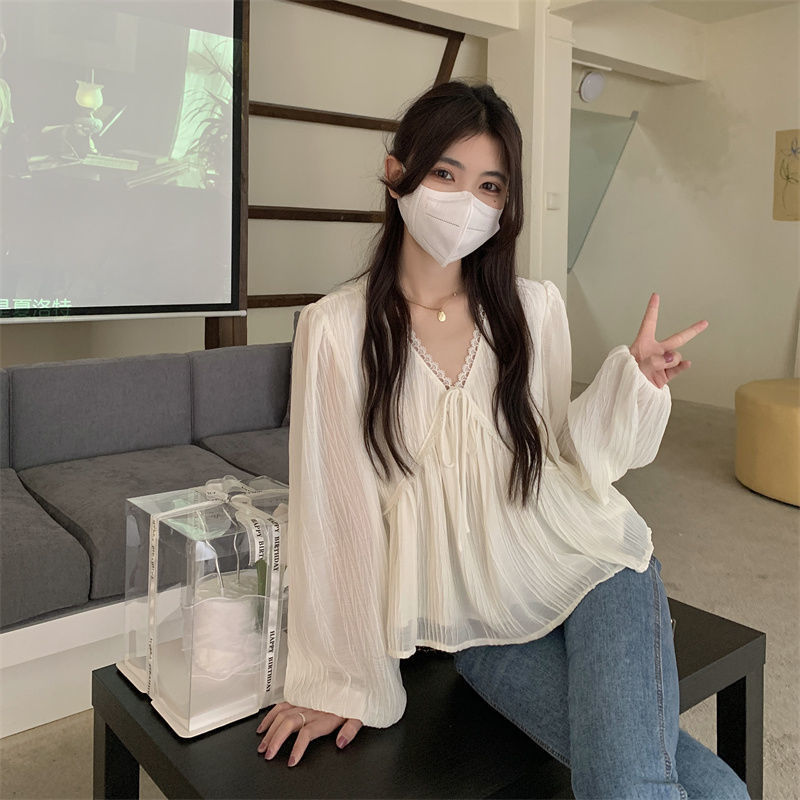 여성을위한 프렌치 v 넥 쉬폰 셔츠 2025 새로운 여름 디자인 틈새 루즈하고 시크한 셔츠 긴팔 탑스토어 가기