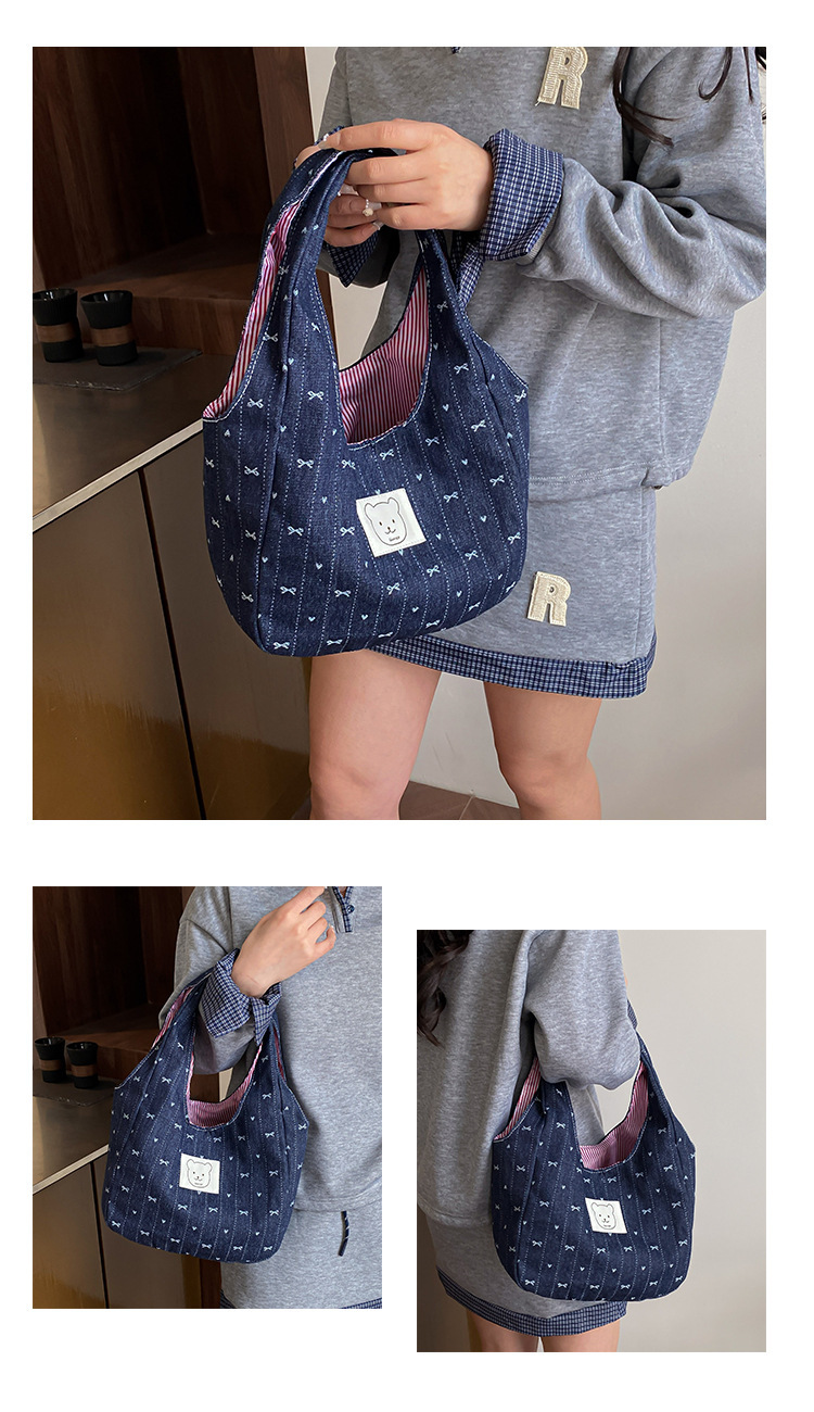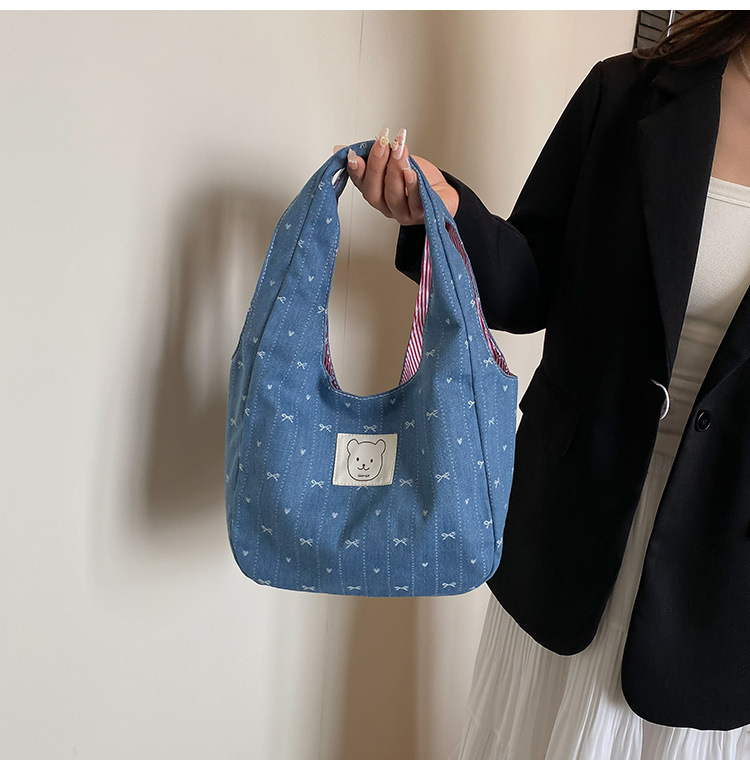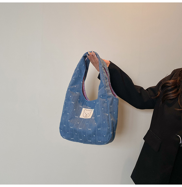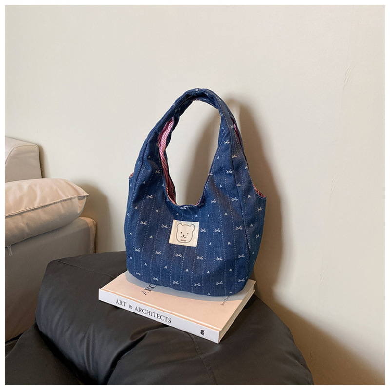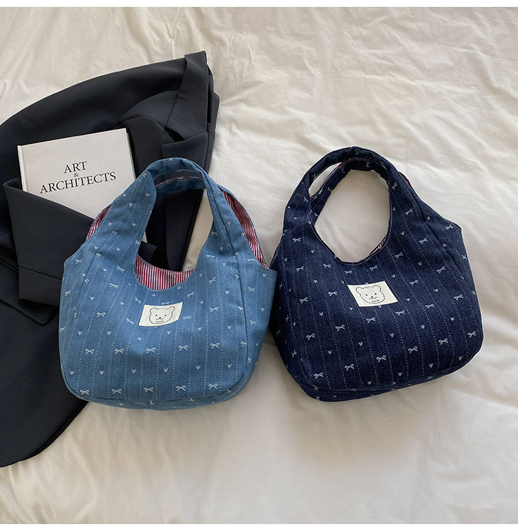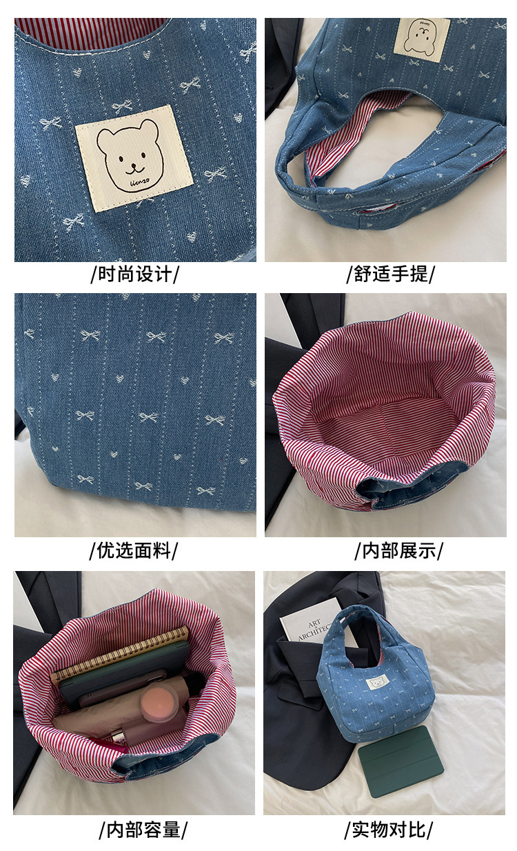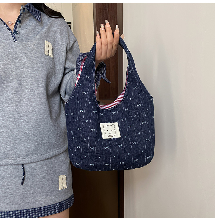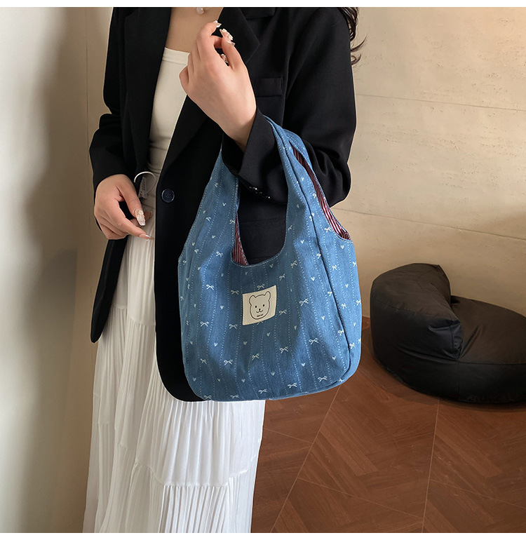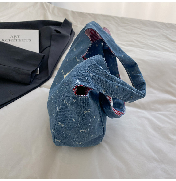 2025 프레쉬 스위트 데님 보우 스타일 대용량 심플 휴대용 통근 토트 숄더 겨드랑이 가방스토어 가기