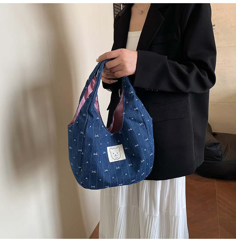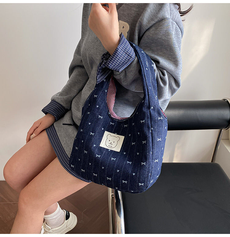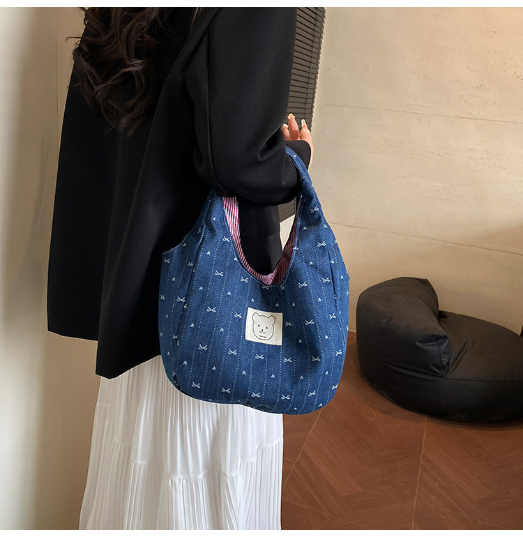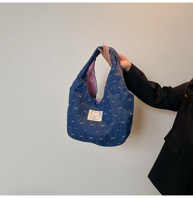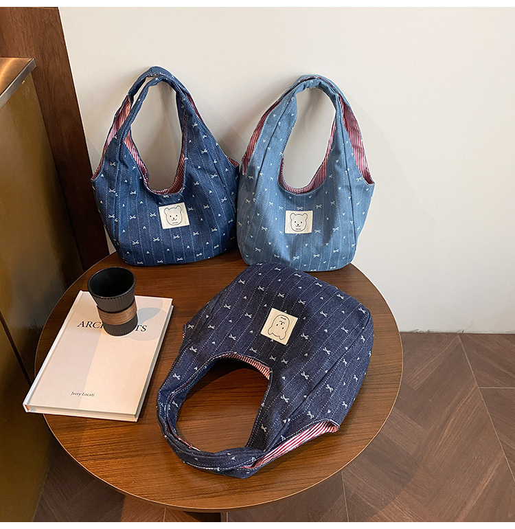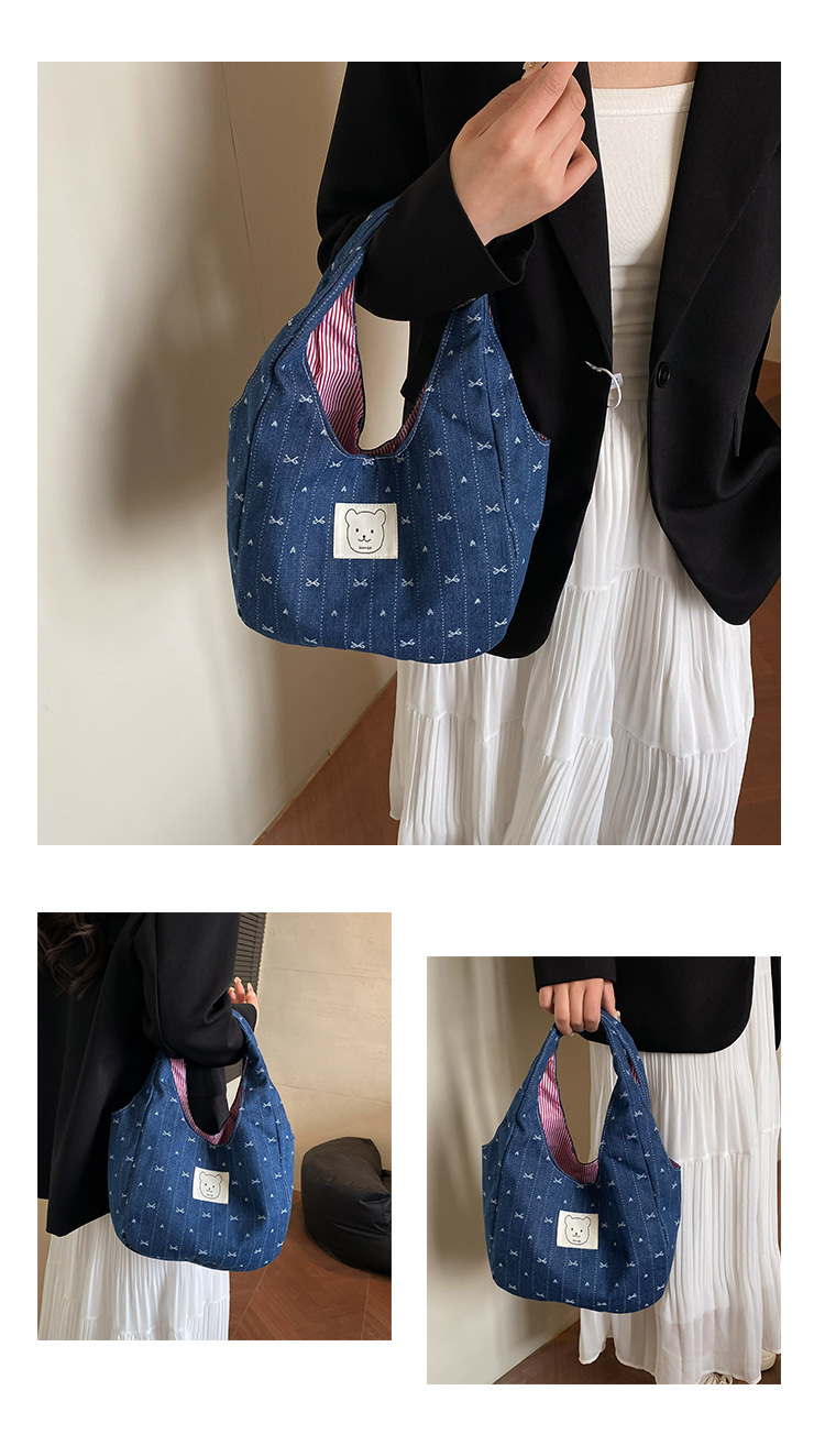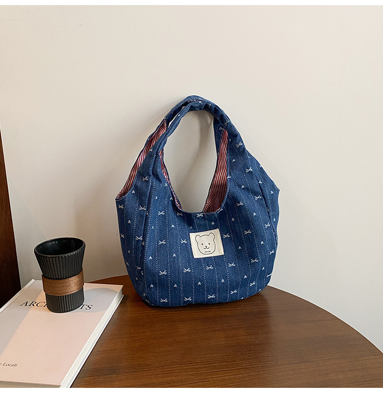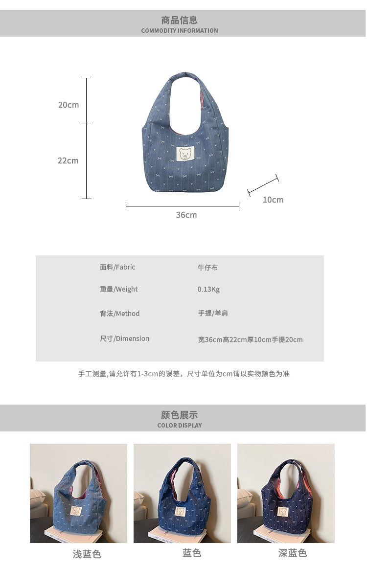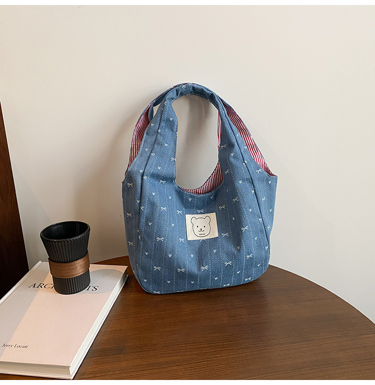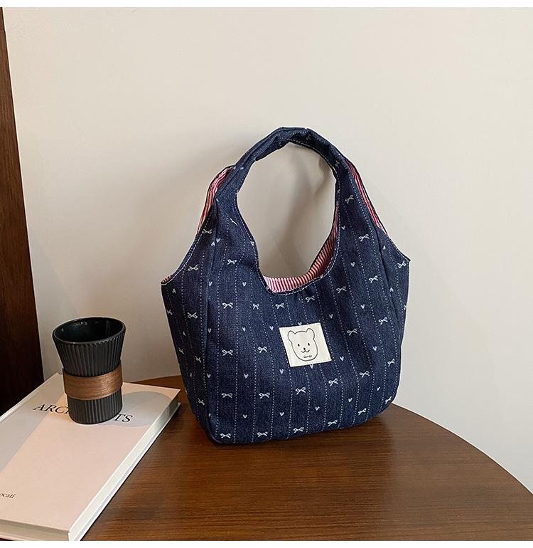2025 프레쉬 스위트 데님 보우 스타일 대용량 심플 휴대용 통근 토트 숄더 겨드랑이 가방스토어 가기