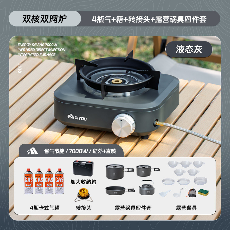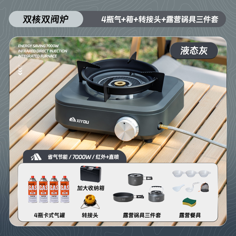 • 듀얼코어 더블밸브 스토브 [리퀴드 그레이] + 3피스 냄비세트 + 가스 4개