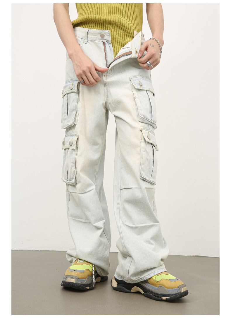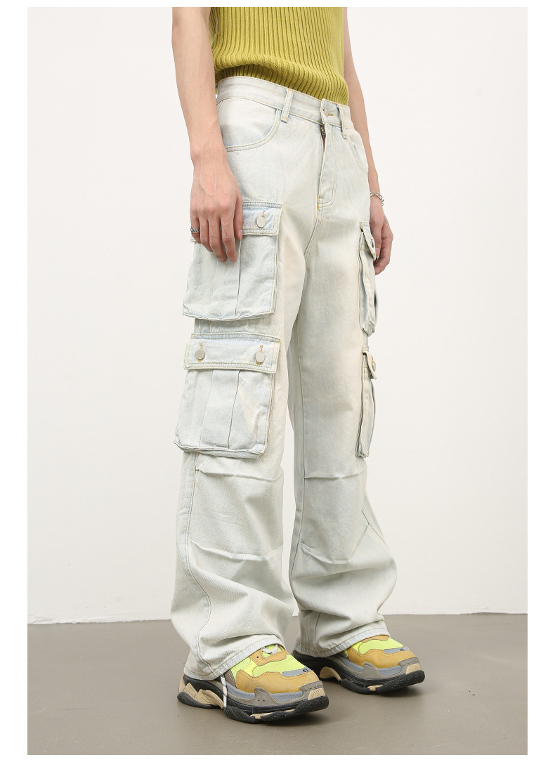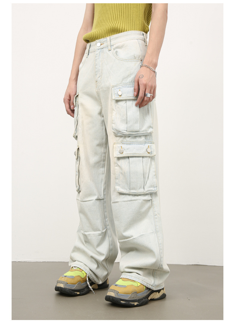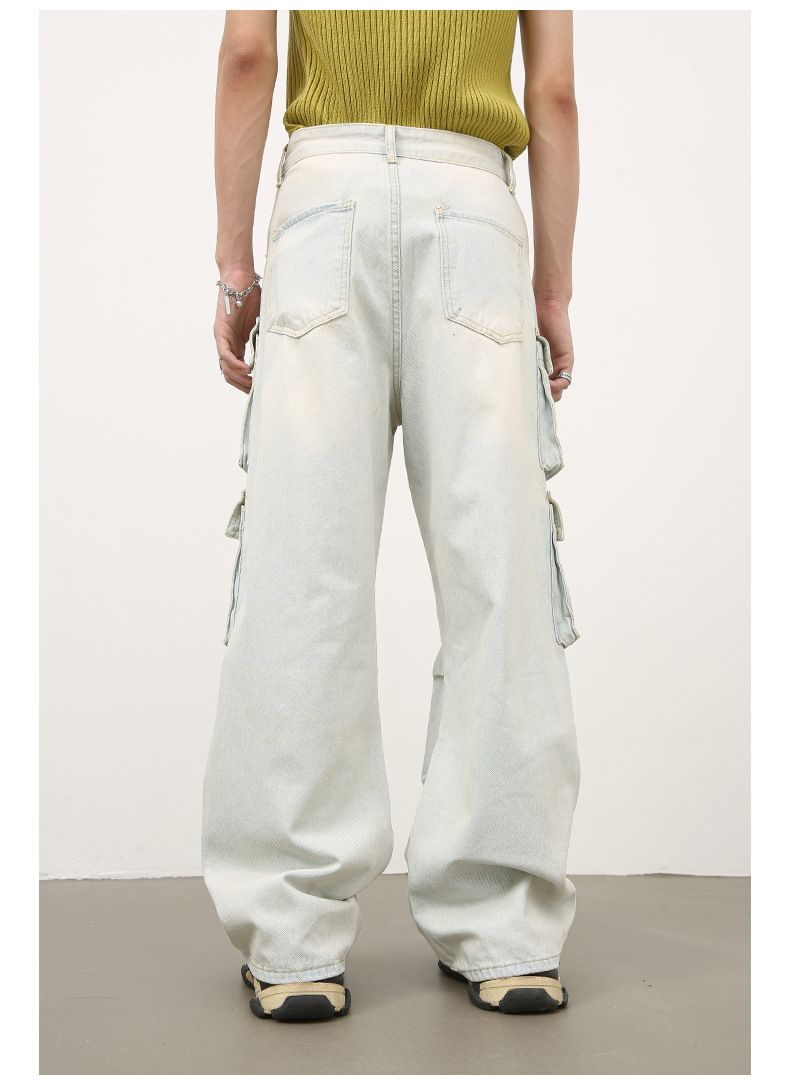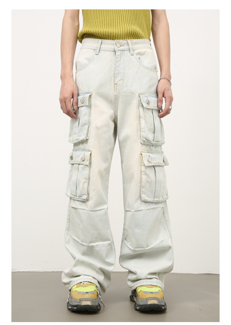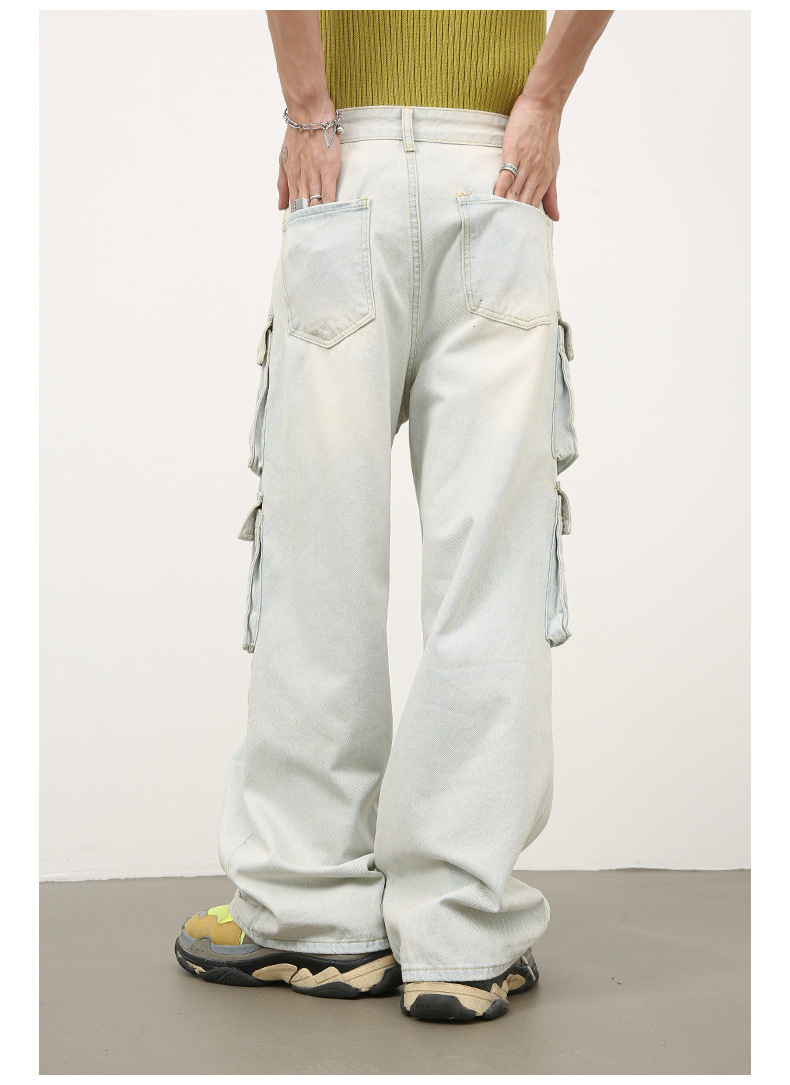 니르벤 데님 | 아메리칸 스타일 멀티 포켓 청바지 남성용 레트로 루즈 스트레이트 오버올 와이드 레그 캐주얼 바지