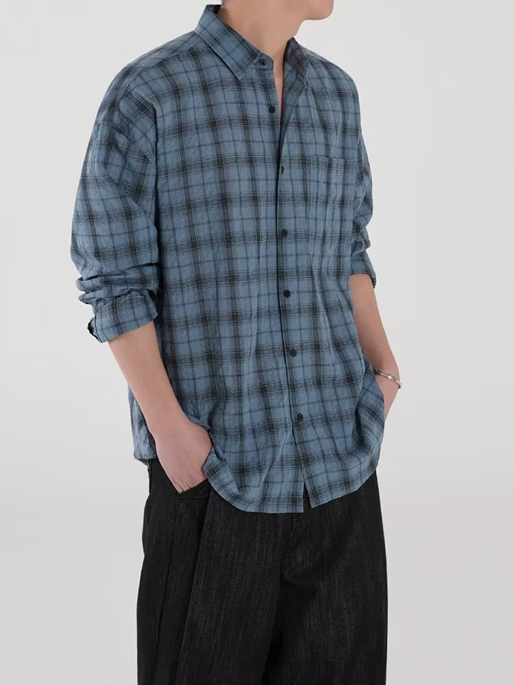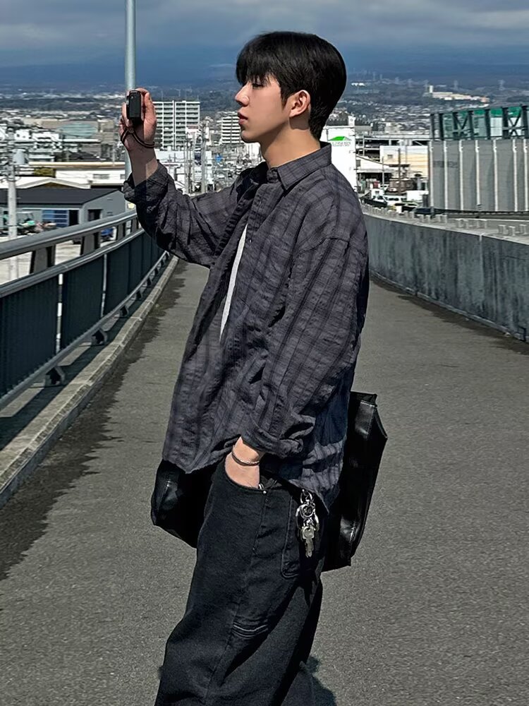 아메리칸 레트로 체크 무늬 자외선 차단 셔츠 남성용 긴팔 여름 얼음 실크 속건성 얇은 게으른 스타일 셔츠 재킷