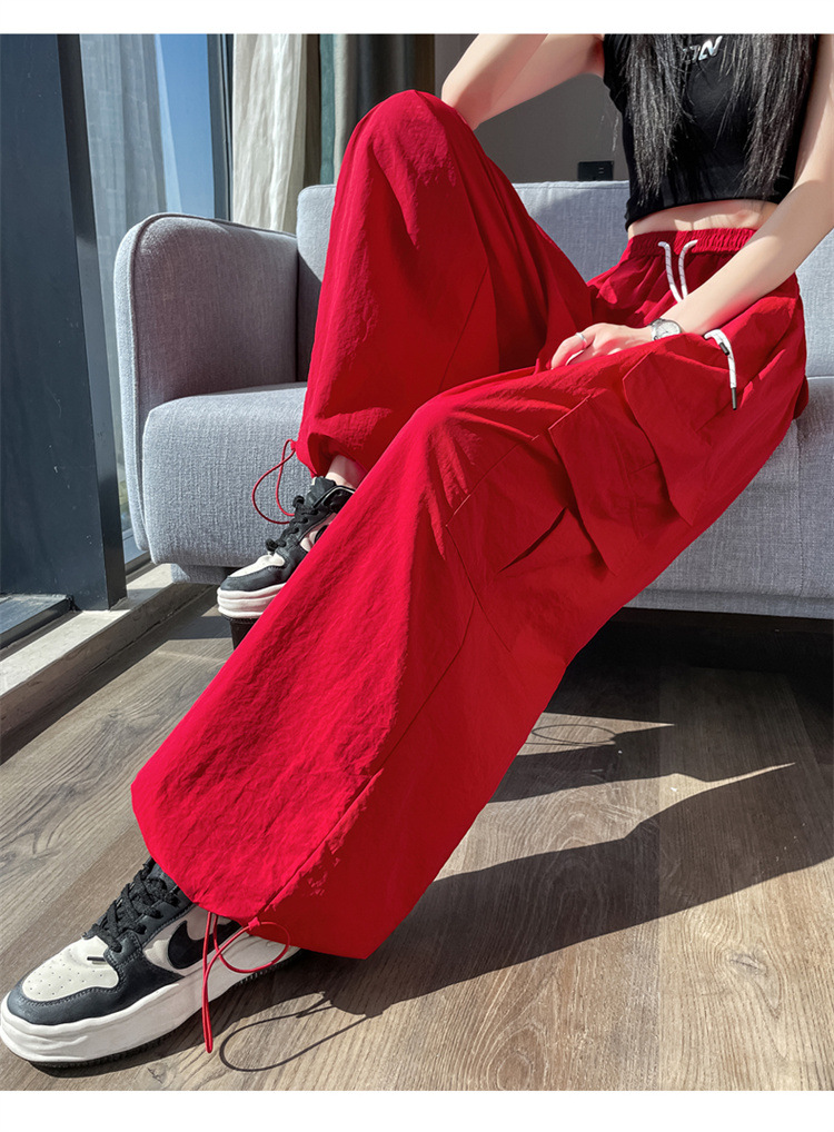 La Chapelle 아메리칸 로즈 레드 아이스 실크 속건성 여성용 작업복 여름 얇은 하이 웨이스트 하이킹 와이드 레그 파라트리저 바지