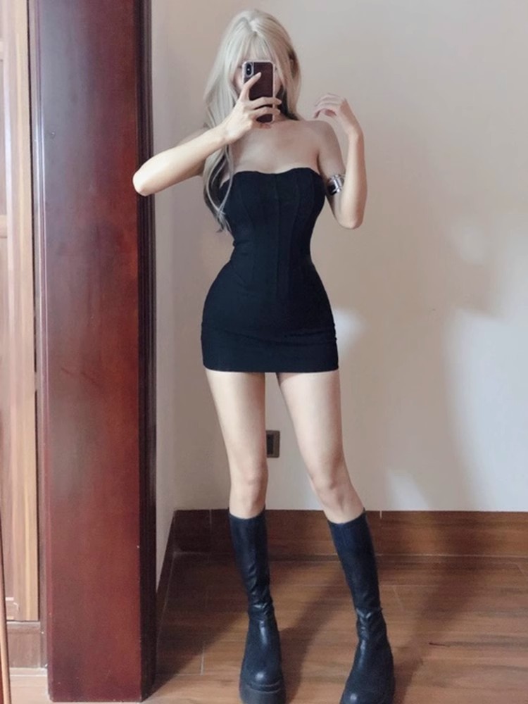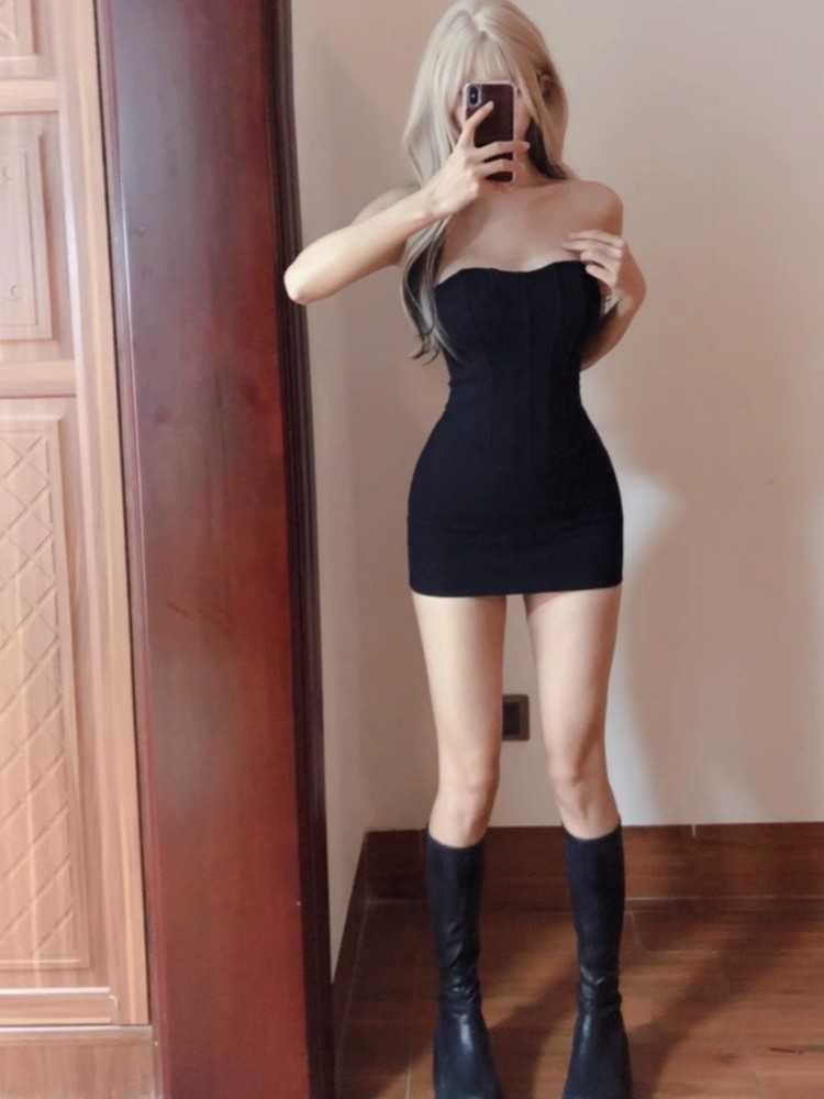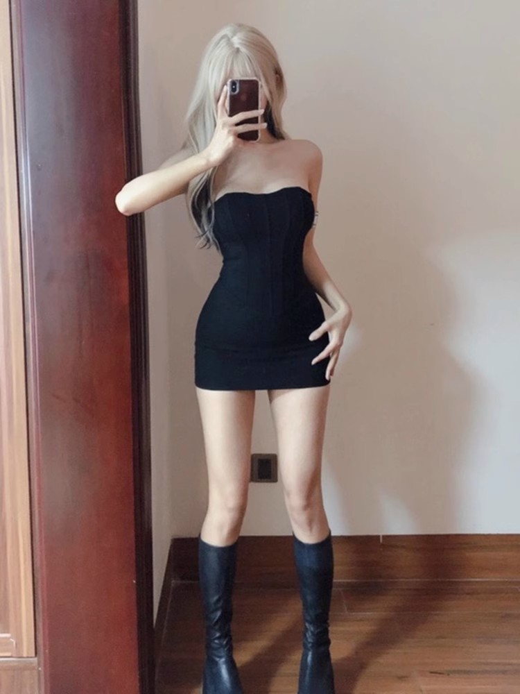 블랙 타이트 튜브 탑 드레스 여성 여름 2025 새로운 순수한 욕망 스타일 핀치 허리 슬리밍 피쉬본 힙 스커트스토어 가기