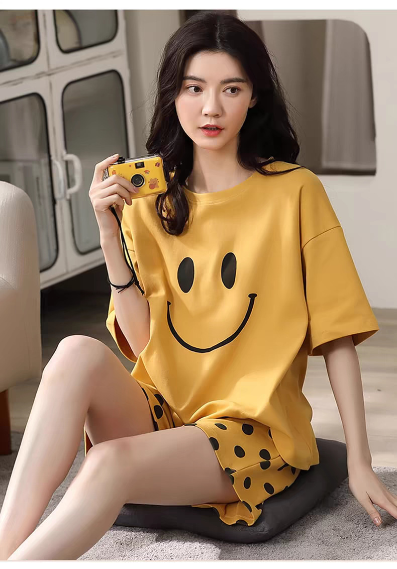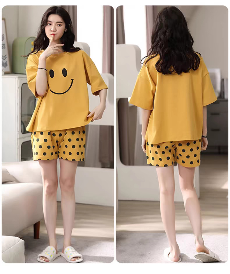 여성용 잠옷 여름 반팔 반바지 여성용 만화 캐주얼 얇은 스타일은 소녀들이 여름 홈웨어 세트 외부에 착용할 수 있습니다.스토어 가기