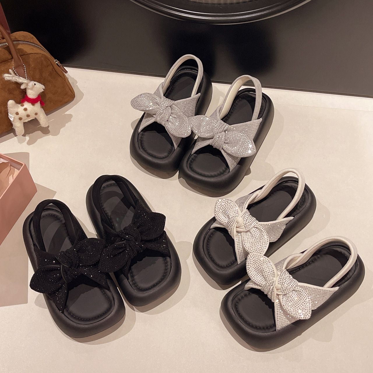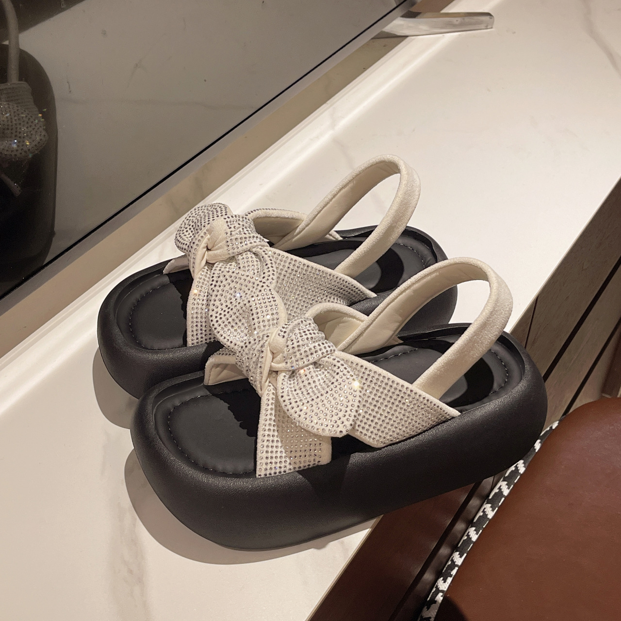 5cm 두꺼운 밑창 보우 라인스톤 샌들 여성 2025 여름 신상 부드러운 밑창 비치 슈즈 캐주얼 로마 슈즈스토어 가기