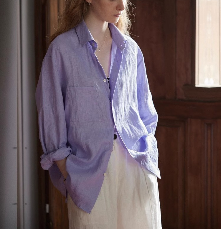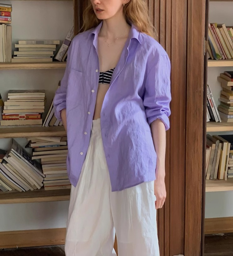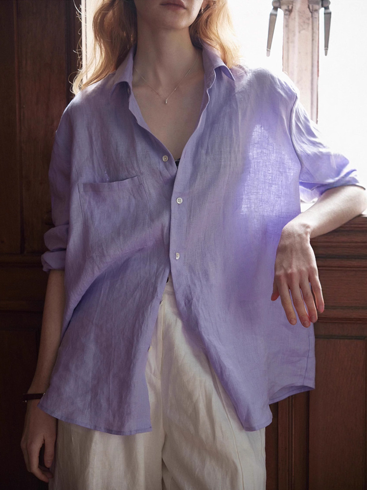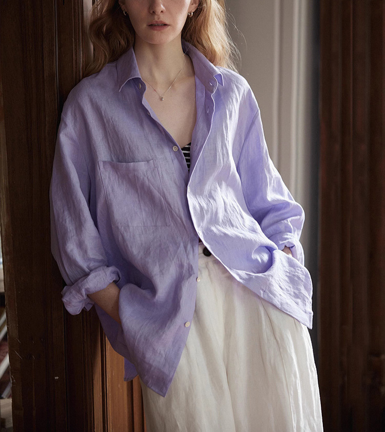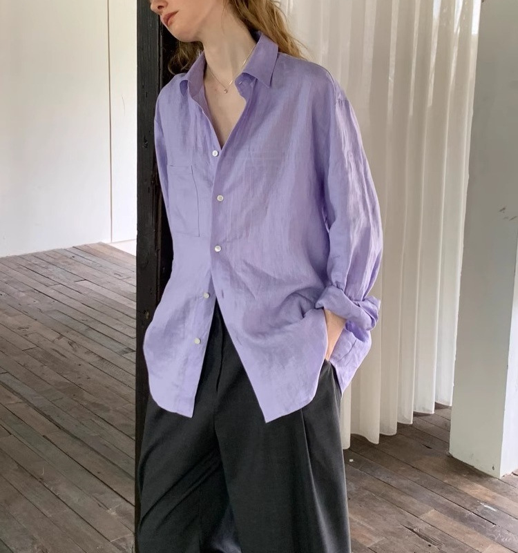 Nice peopl2025SS 하이엔드 100 천연 샌드 워시 린넨 타로 퍼플 긴팔 셔츠 블라우스