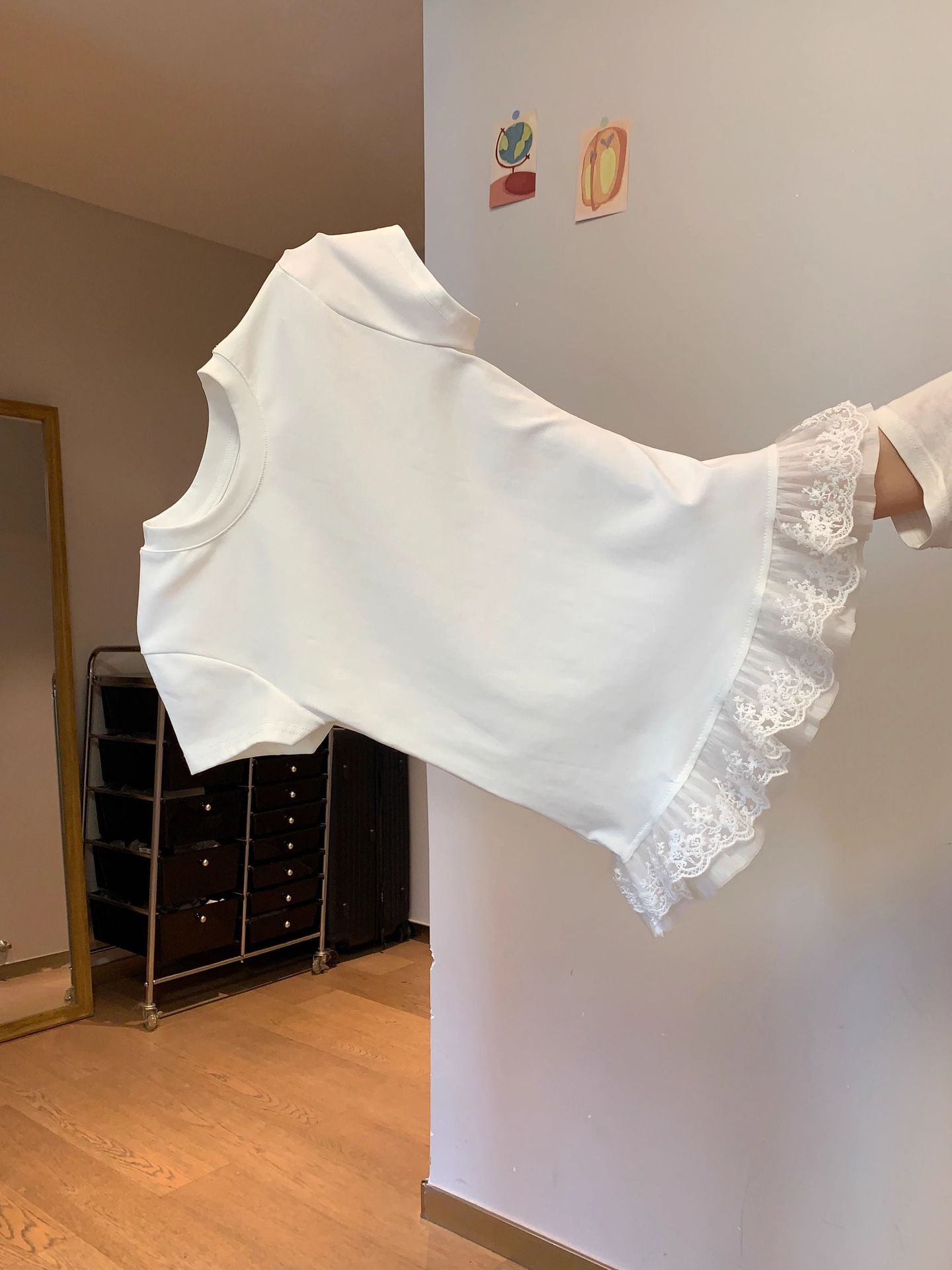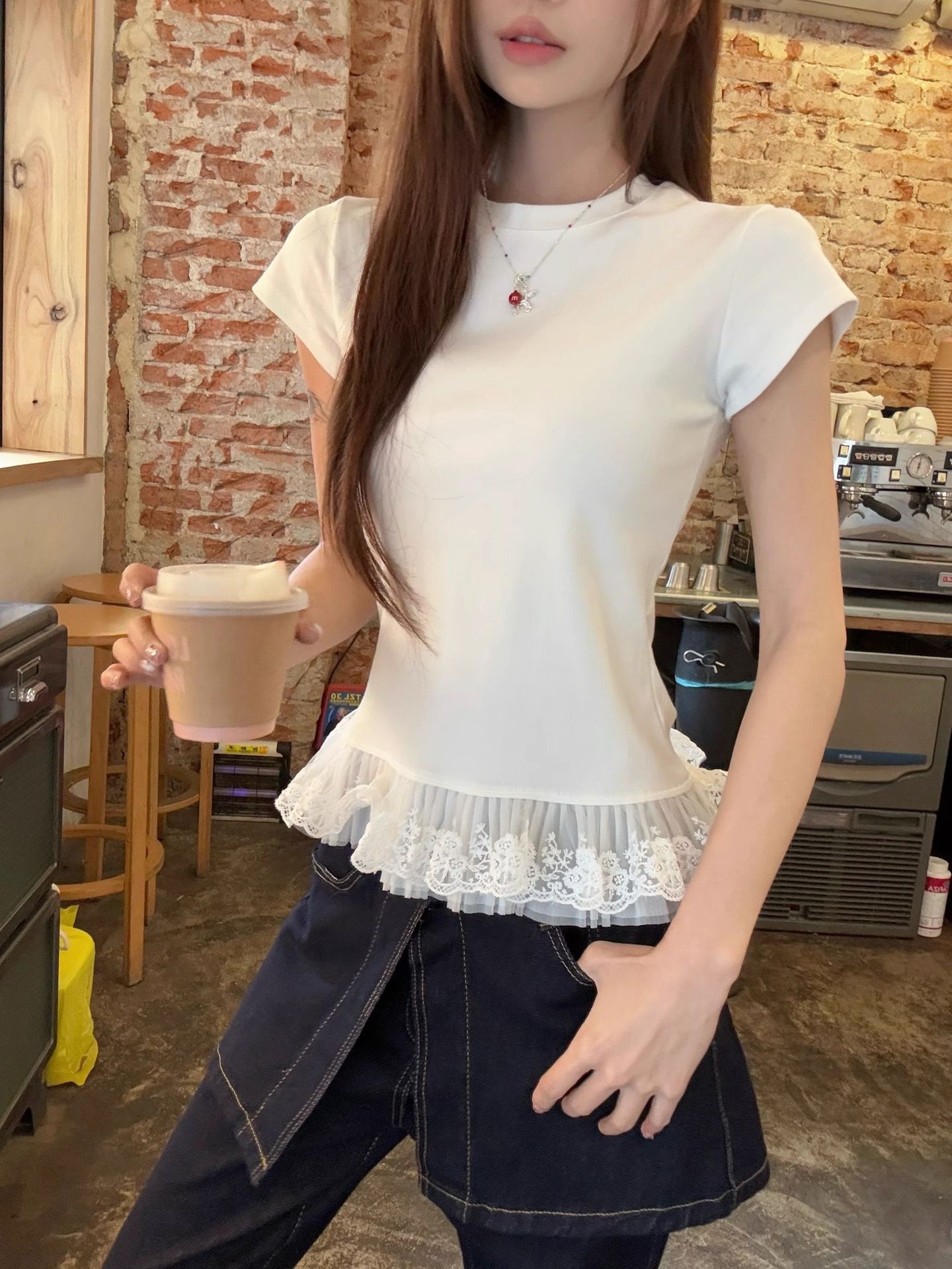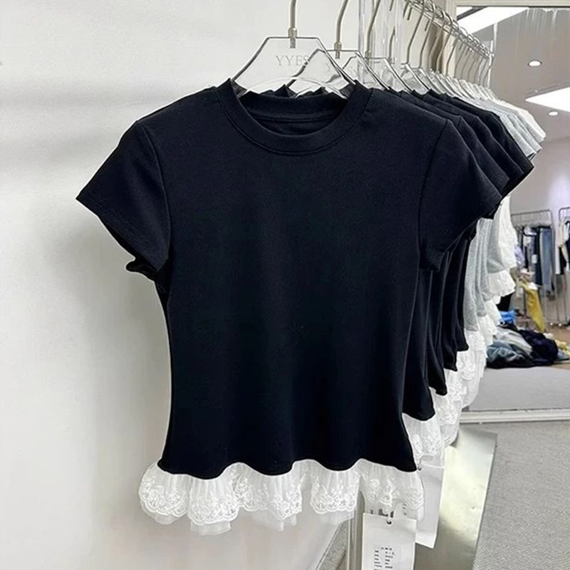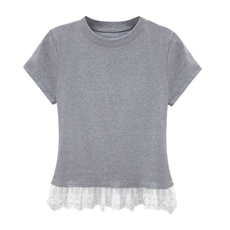 그레이 티셔츠 밑단 레이스 스플라이싱 반팔 여성 여름 차 프린트 디자인 슬림 웨이스트 탑스토어 가기
