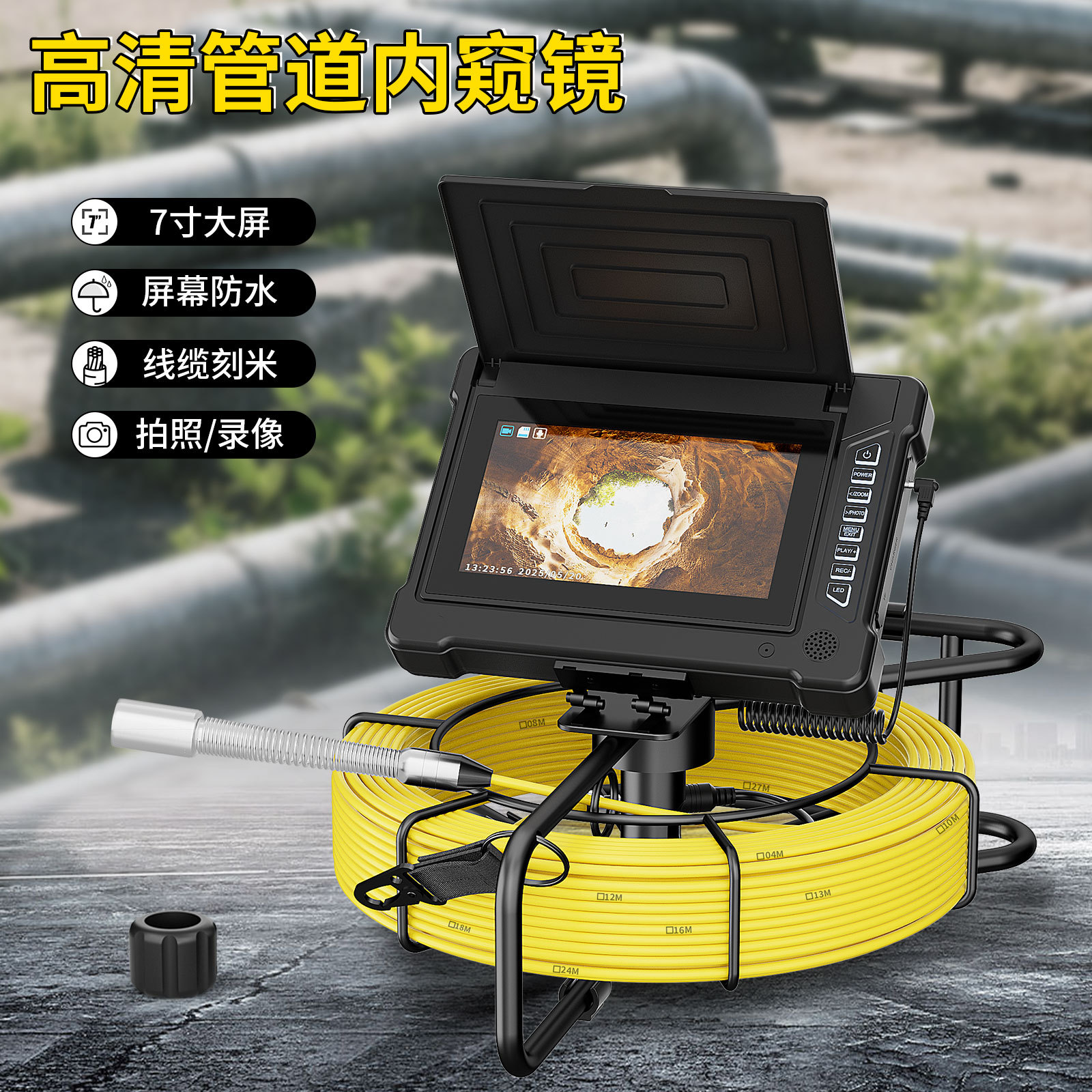 F726PDYC23:7寸AHD录像屏,带计米器,直径23mm不锈钢探头,蓝宝石镜片,高清1080P,镜头角度145度,20米-30米-50米管道内窥镜,2650MA内置电池,带电量显示,8个白光灯,带摄像头保护套1种,送16G卡。5MM黄色线缆带刻米。