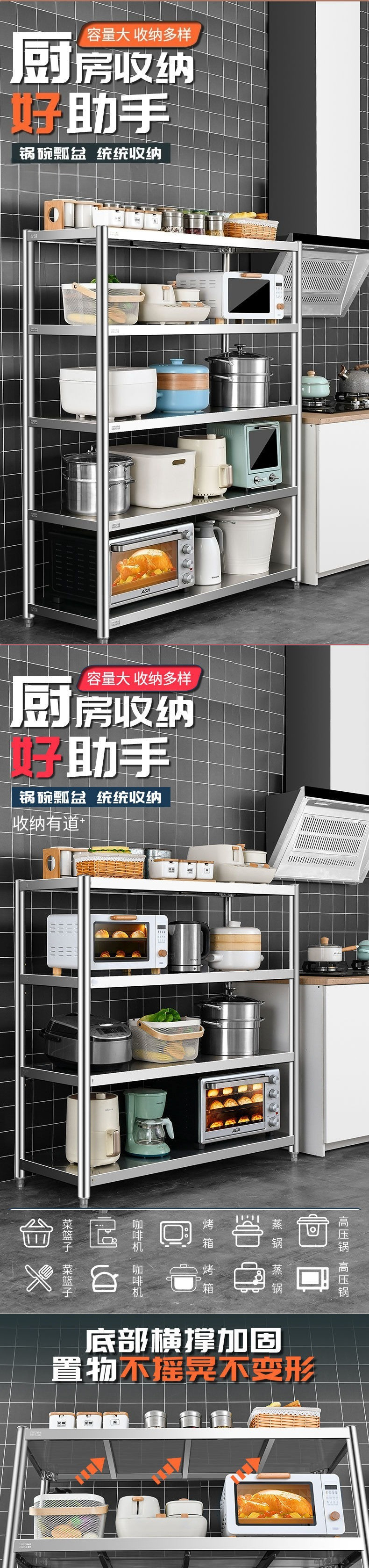 주방 바닥 스테인레스 스틸 선반 다층 가정용 5층 오븐 선반 주방 용품 보관 캐비닛스토어 가기