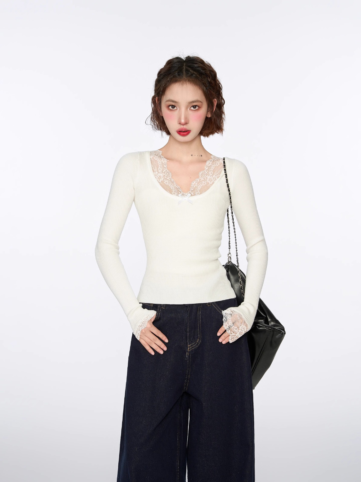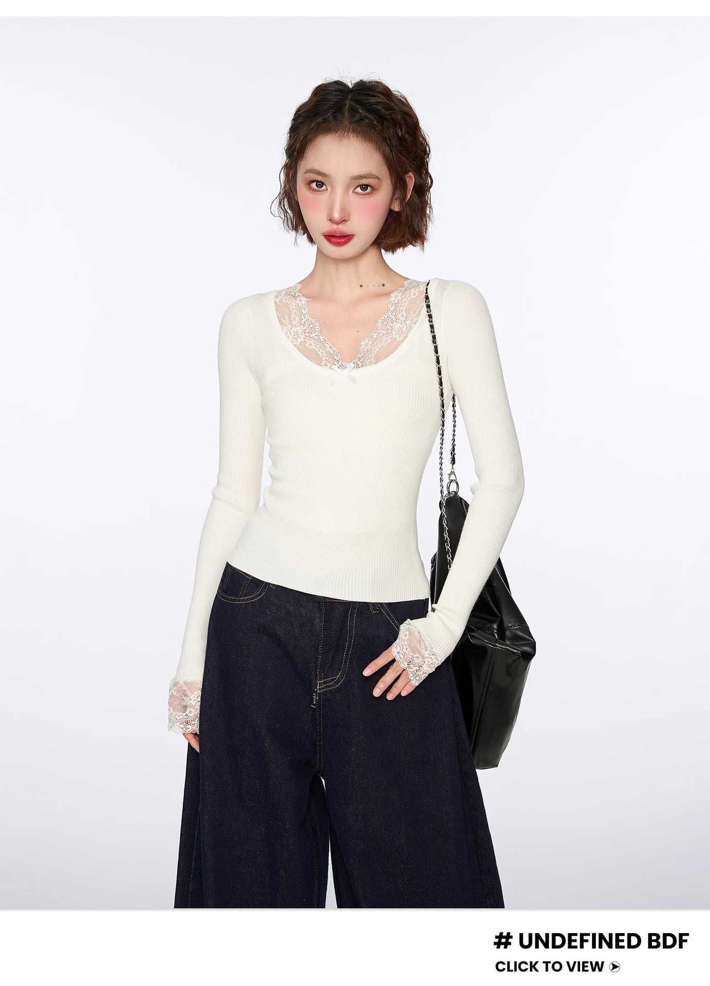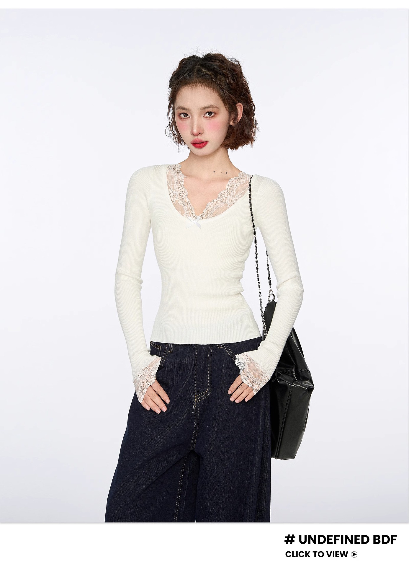 여성을 위한 화이트 레이스 브이넥 긴팔 스웨터, 초봄, 가을 슬림핏 이너 레이어드 셔츠, 코어스판 원사, 순수한 욕망스토어 가기