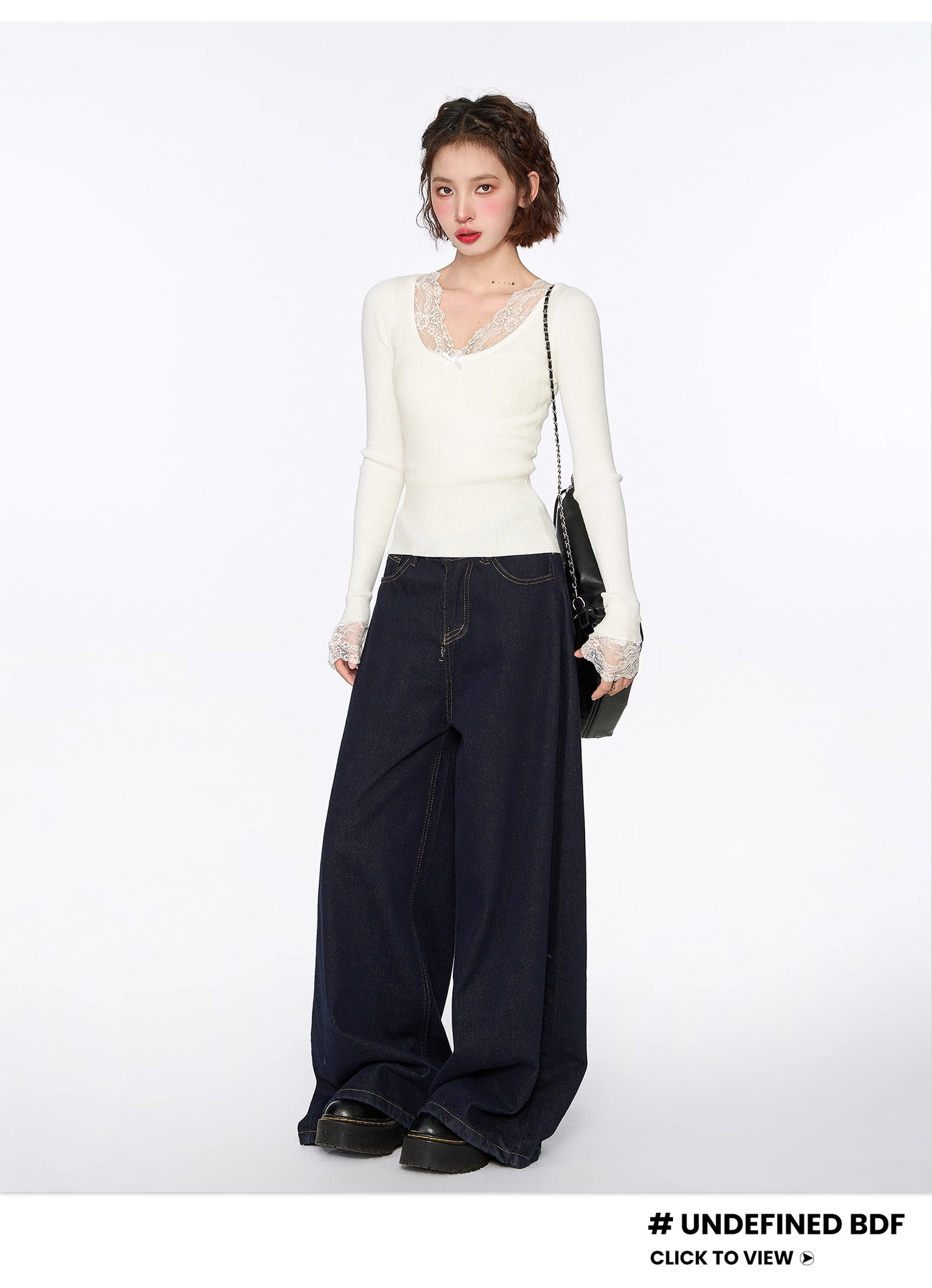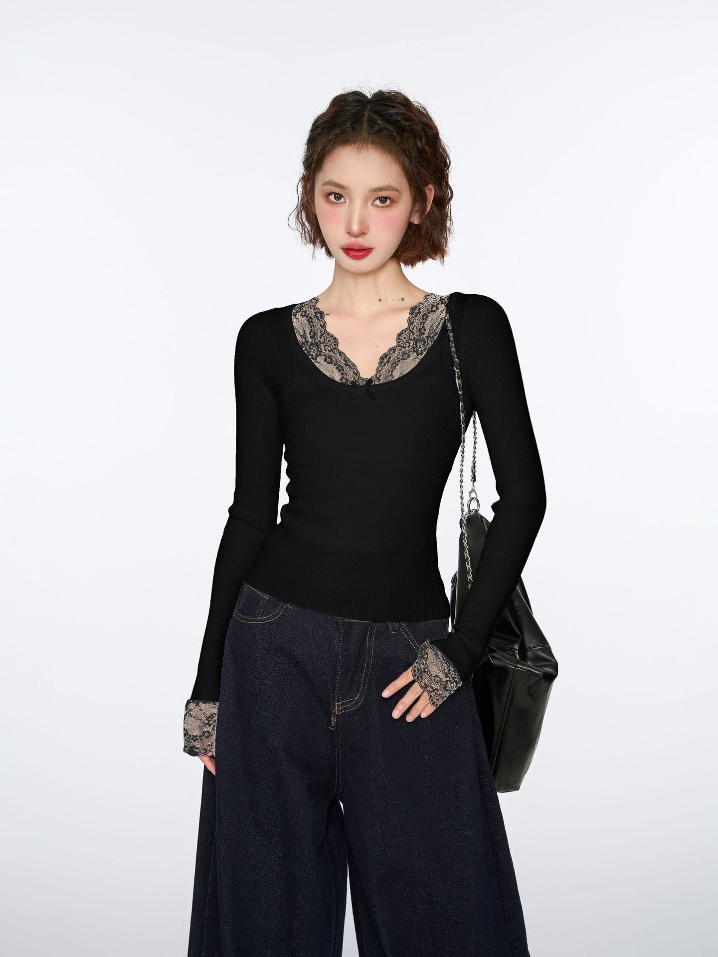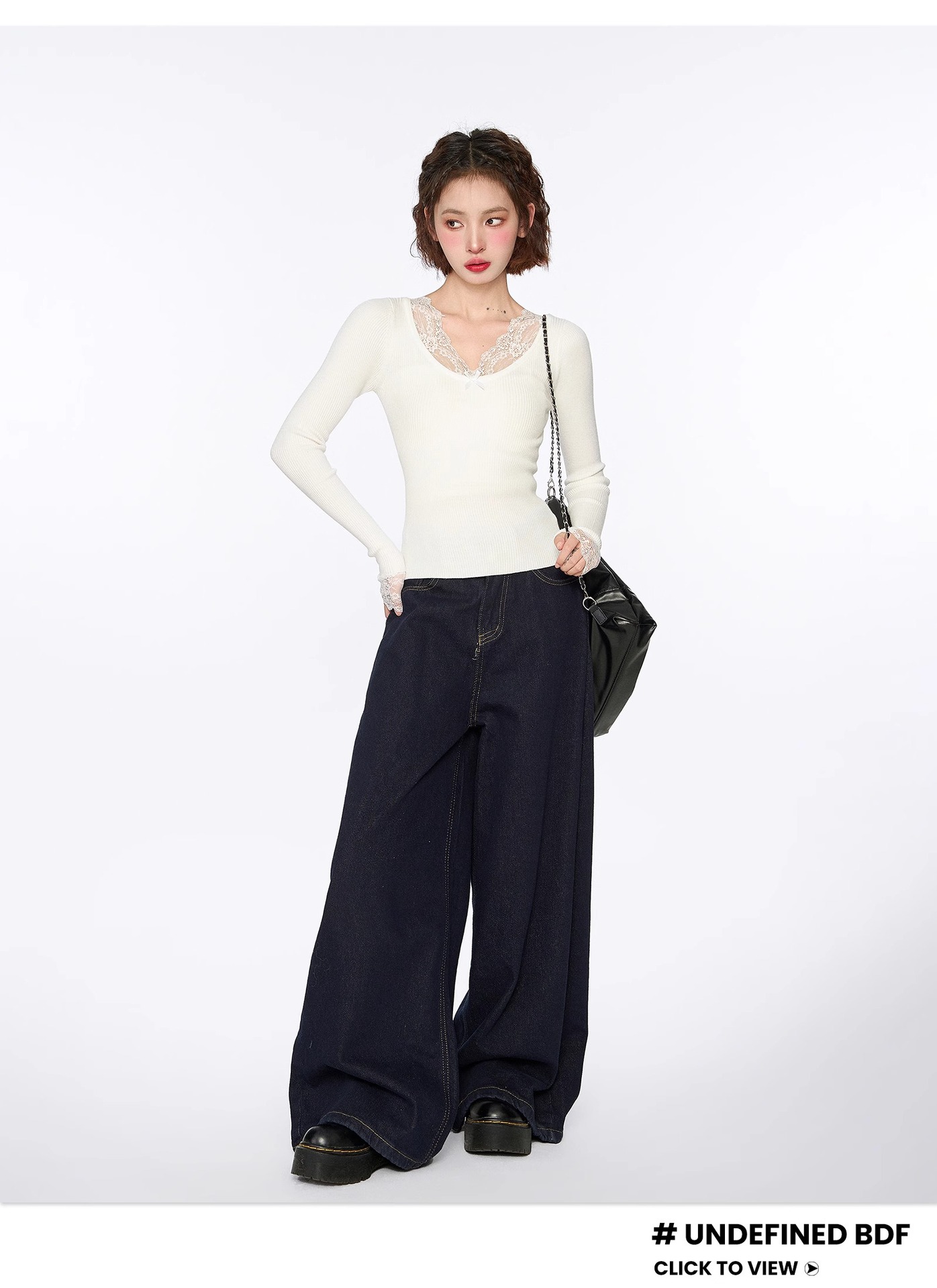여성을 위한 화이트 레이스 브이넥 긴팔 스웨터, 초봄, 가을 슬림핏 이너 레이어드 셔츠, 코어스판 원사, 순수한 욕망스토어 가기