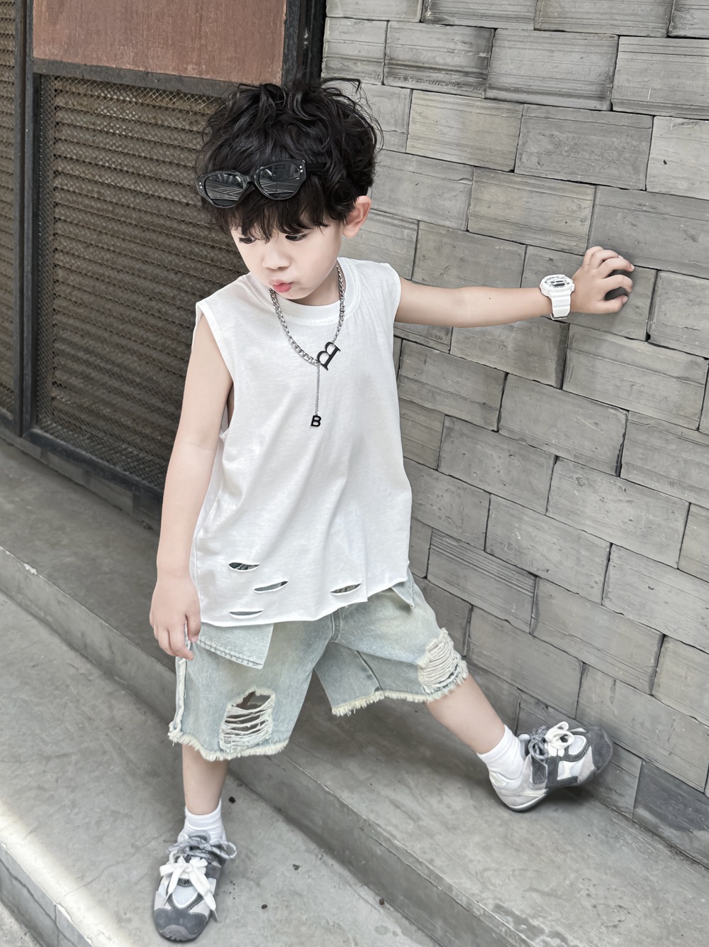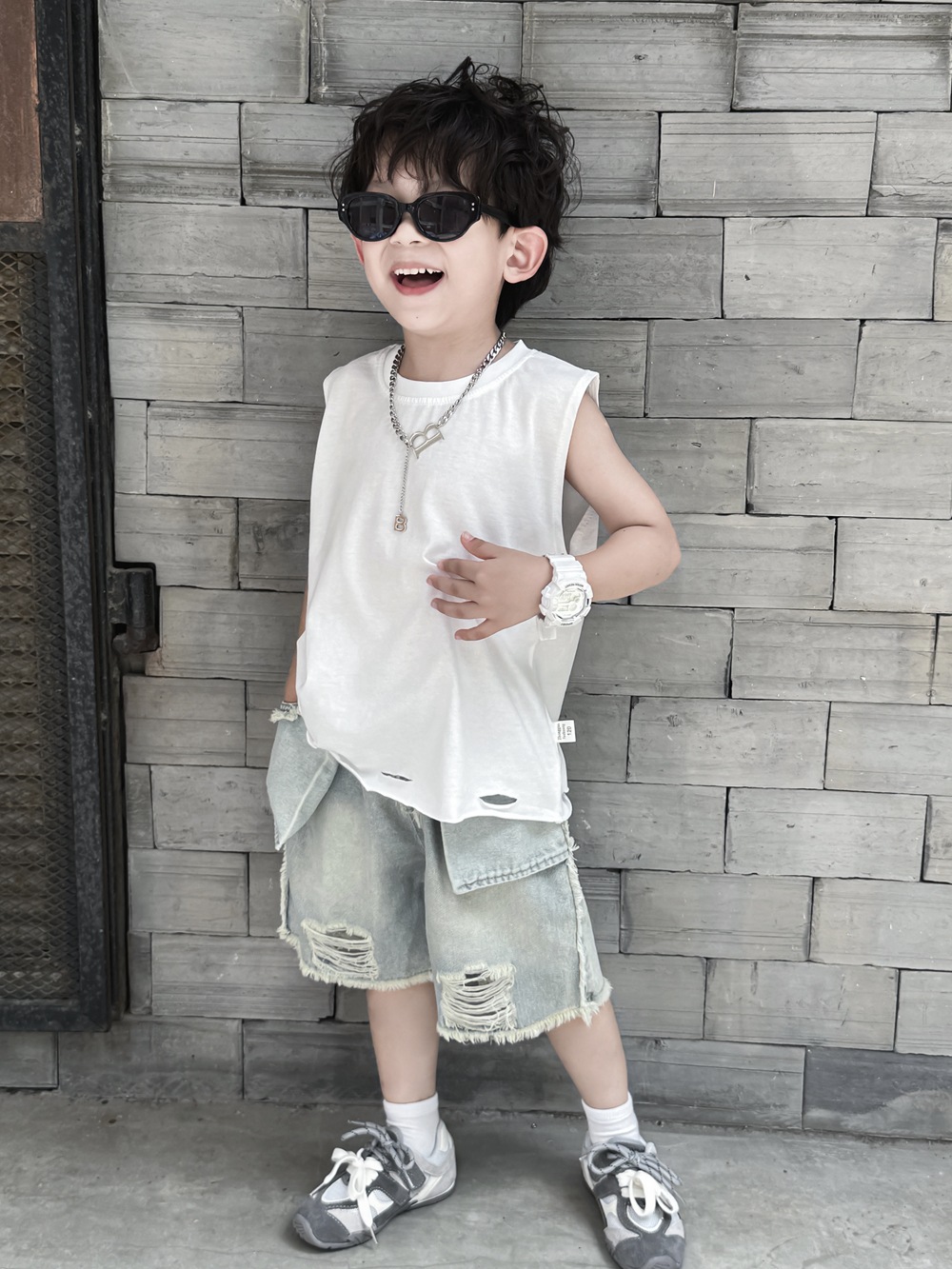 소년 여름 조끼 어린이 한국어 버전 2025 민소매 아기 얇은 순수한 흰색 여름 아동 의류 찢어진 느슨한 티셔츠스토어 가기