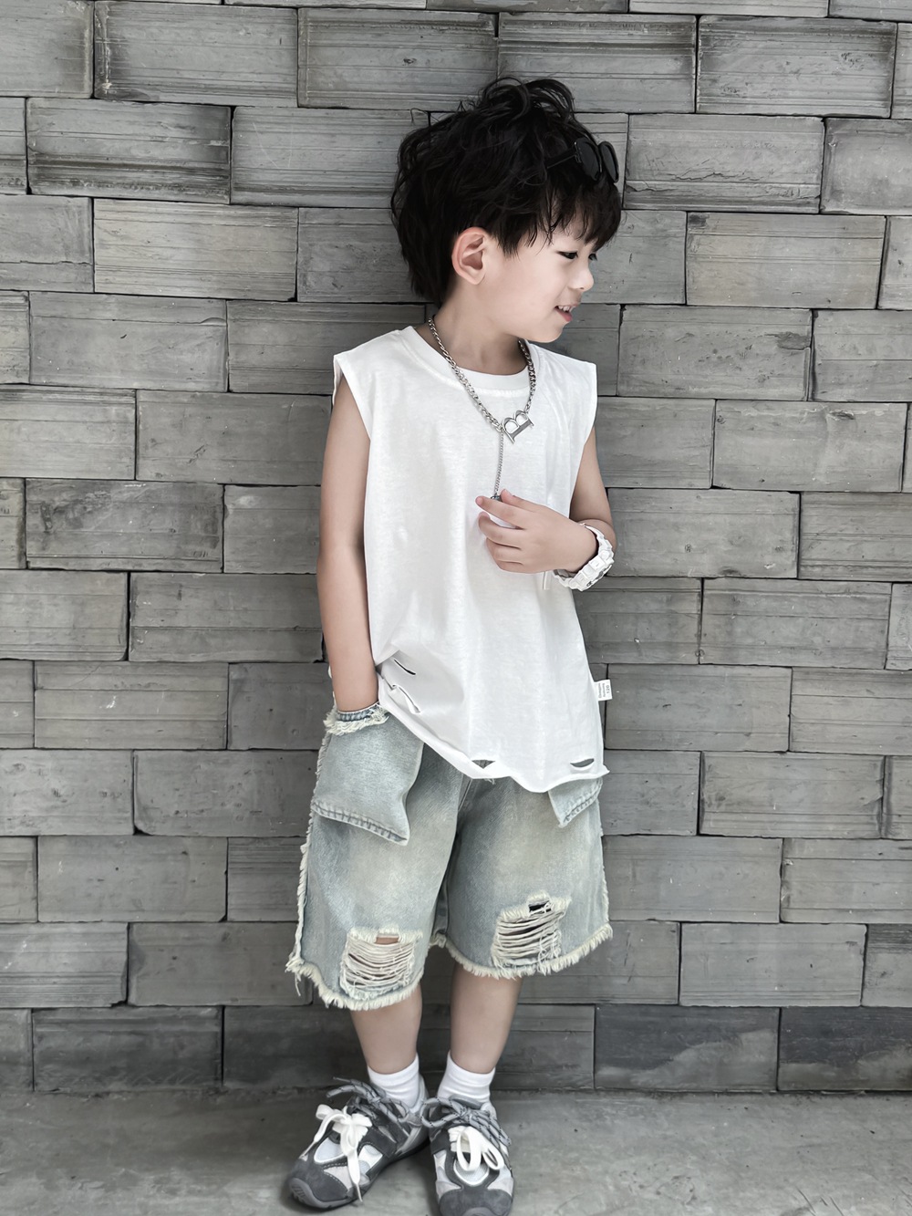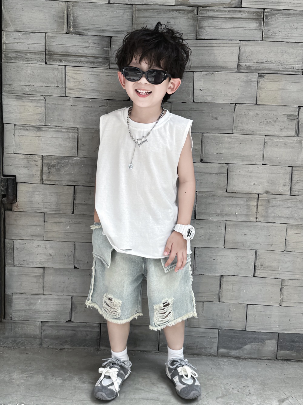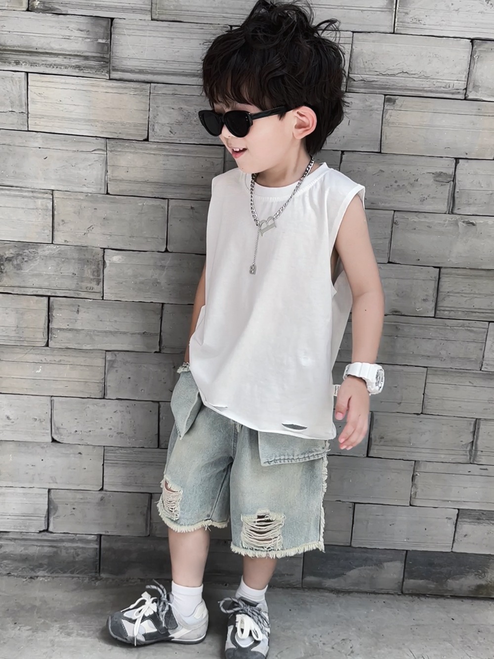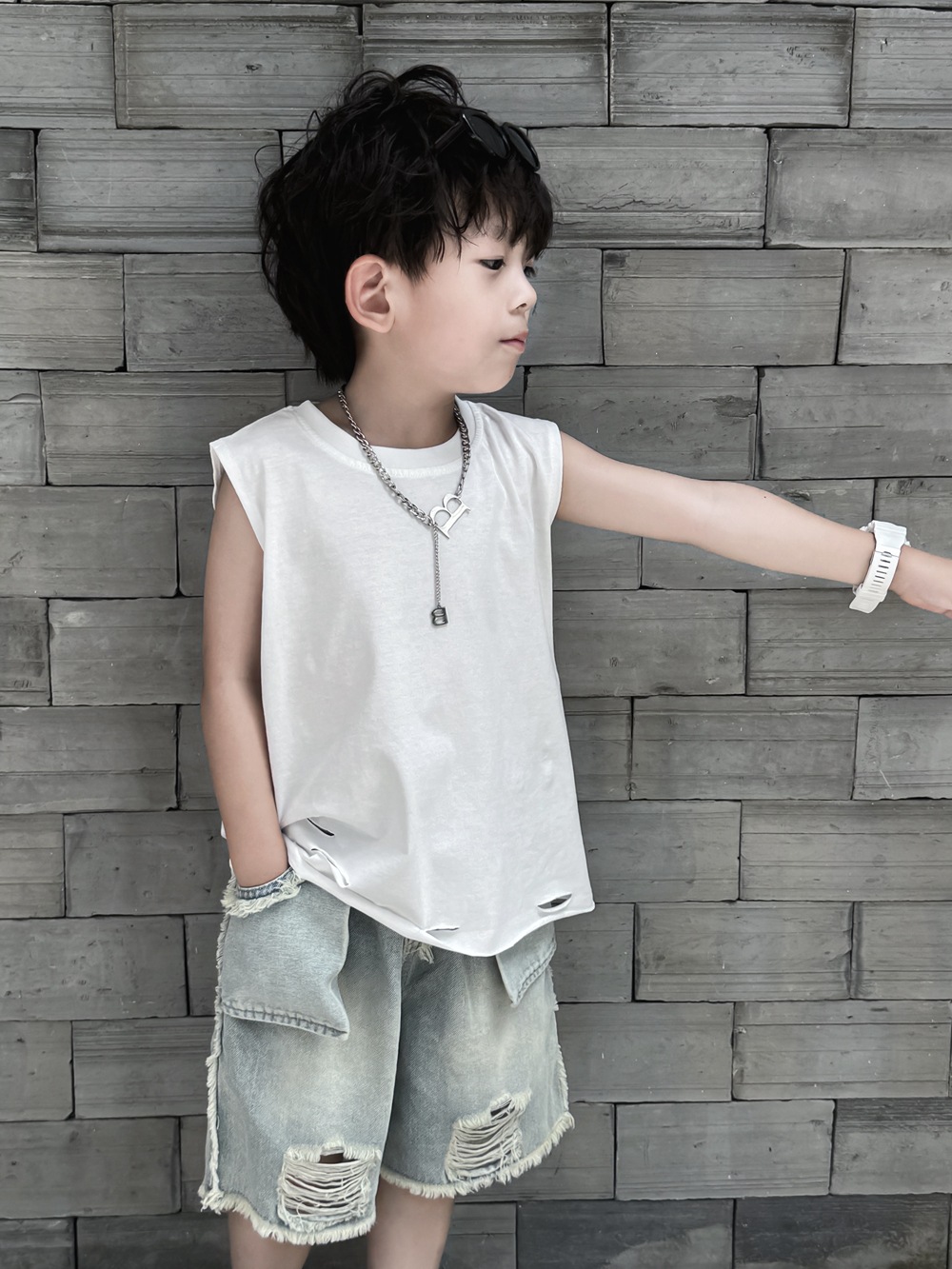 소년 여름 조끼 어린이 한국어 버전 2025 민소매 아기 얇은 순수한 흰색 여름 아동 의류 찢어진 느슨한 티셔츠