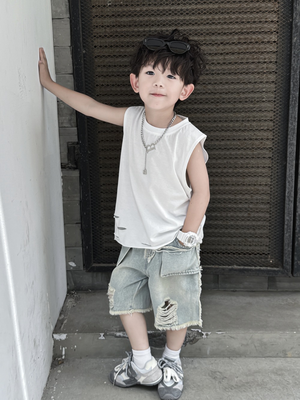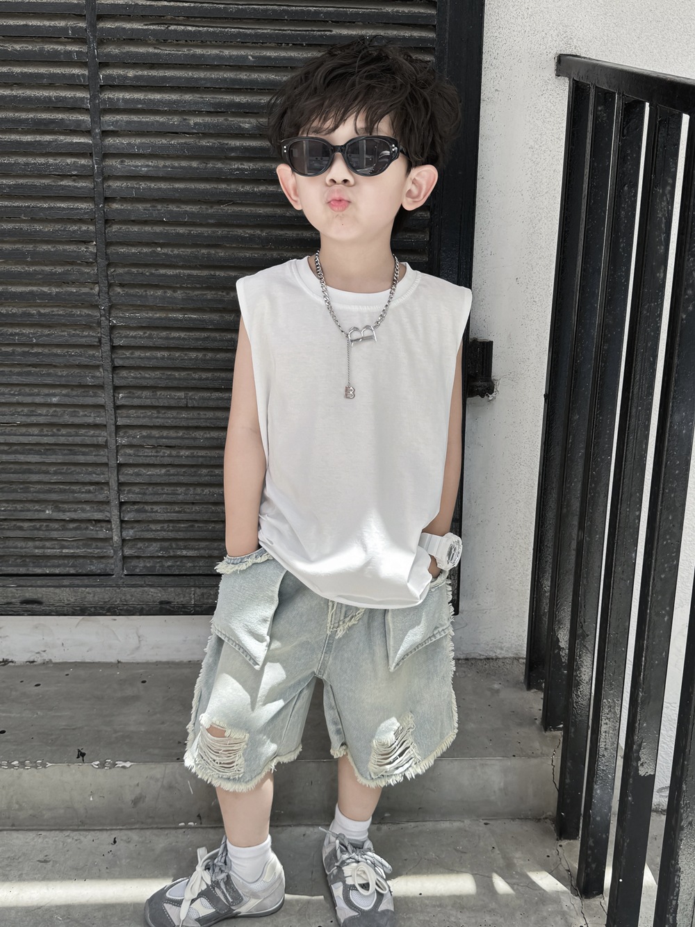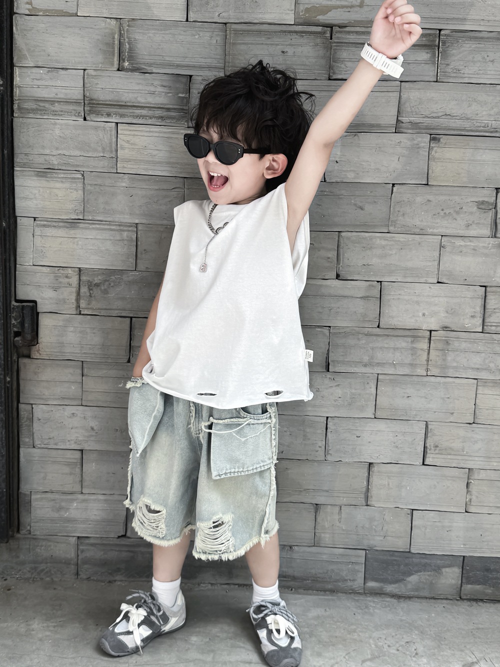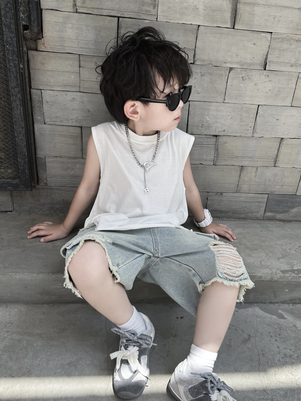 소년 여름 조끼 어린이 한국어 버전 2025 민소매 아기 얇은 순수한 흰색 여름 아동 의류 찢어진 느슨한 티셔츠