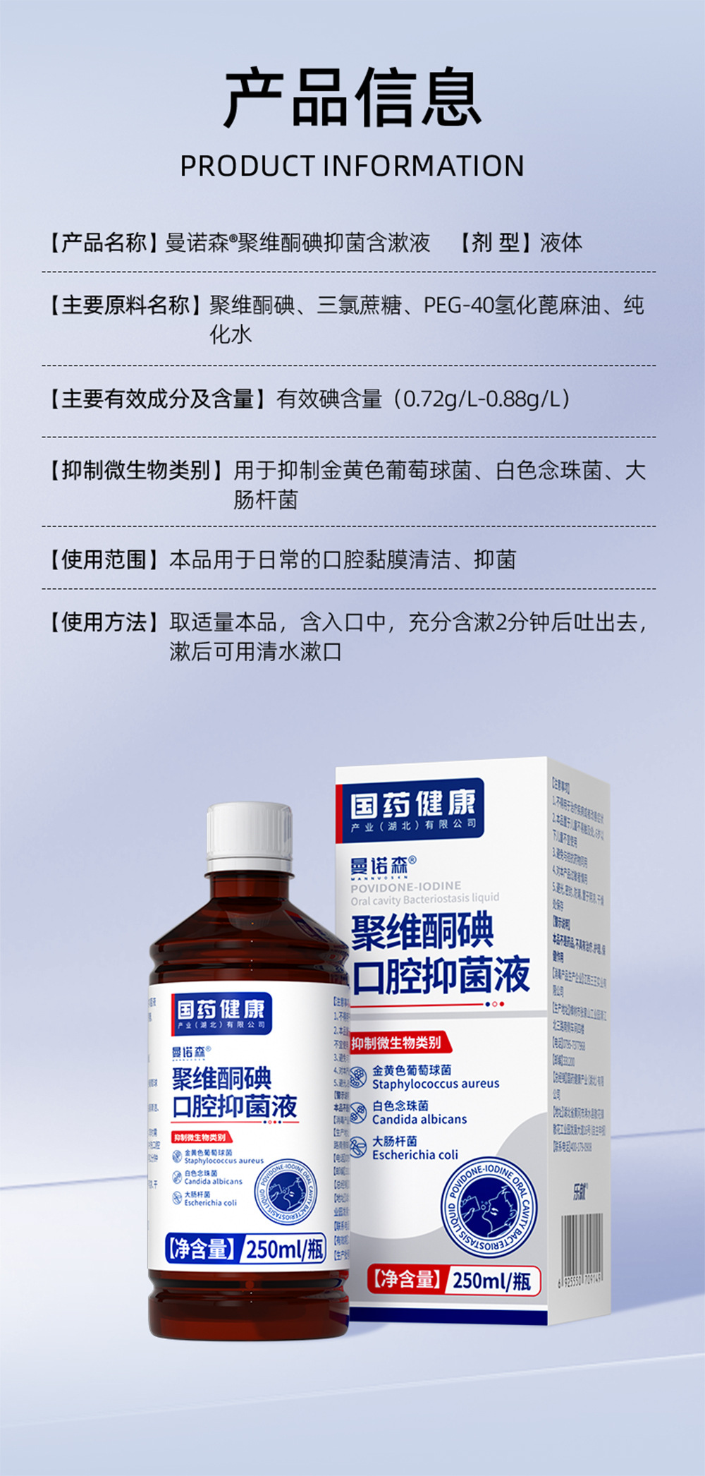 Mannoson Povidone-Iodine 구강 항균 구강청정제는 청소, 냄새 제거 및 구취 구강청정제를 포함하며 배치 배송으로 사용할 수 있습니다.스토어 가기
