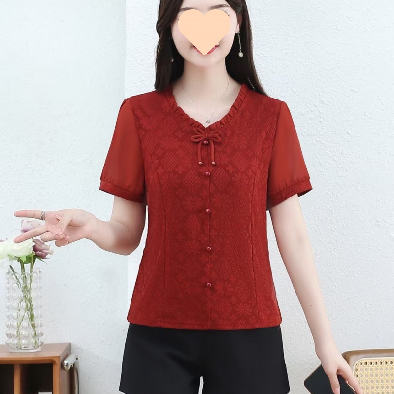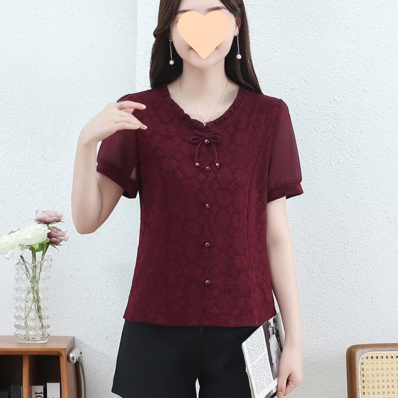 2025夏季韩版拼接提花蕾丝木耳领雪纺衫宽松气质显瘦洋气上衣减龄