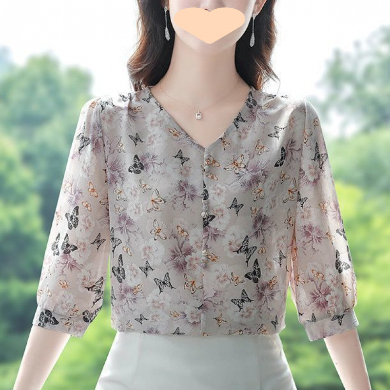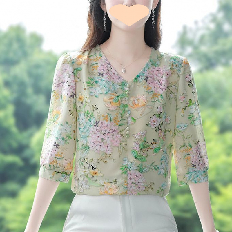 다재다능한 연령 감소 여름 패션 꽃무늬 쉬폰 셔츠 중년 엄마 패션 셔츠 2025 새로운 7부 소매 탑