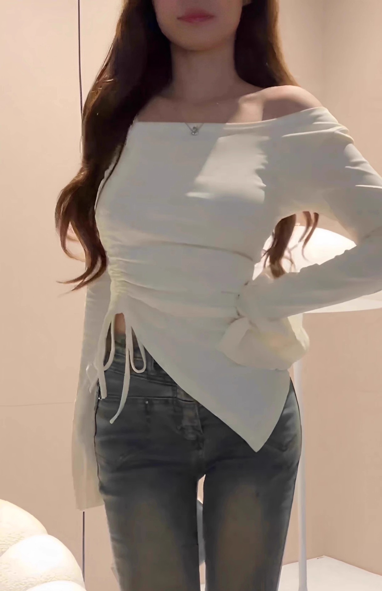 가을 디자인의 여성용 한국 핫걸 드로스트링 원숄더 탑, 니치 오프숄더 이너 레이어드 셔츠, 긴팔 티셔츠스토어 가기