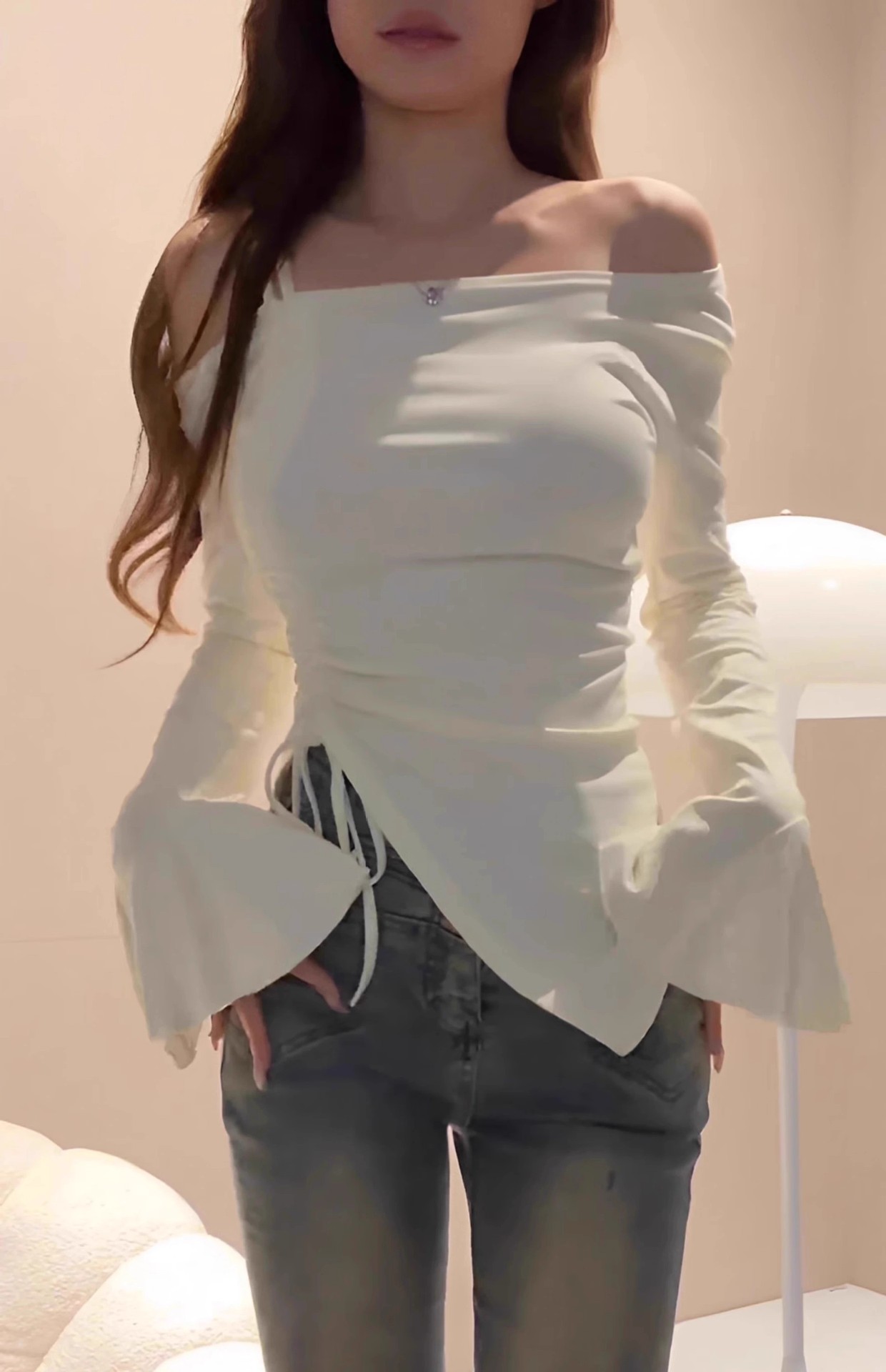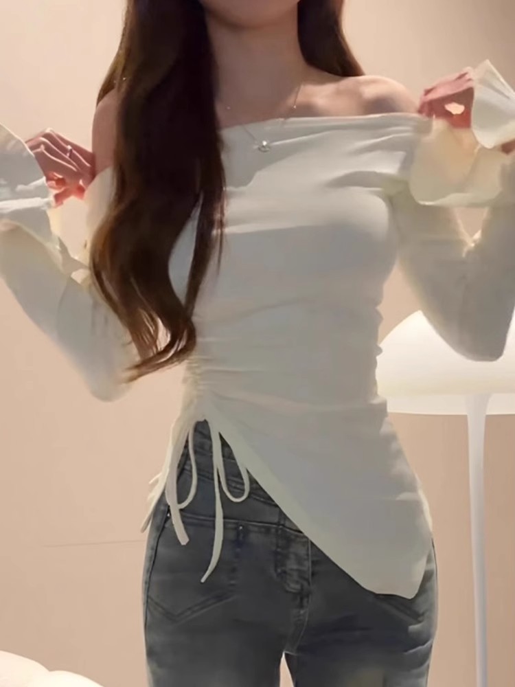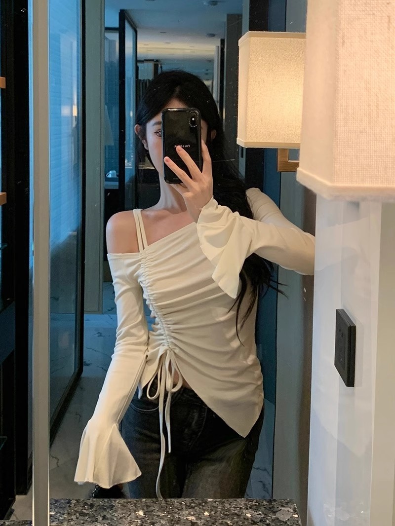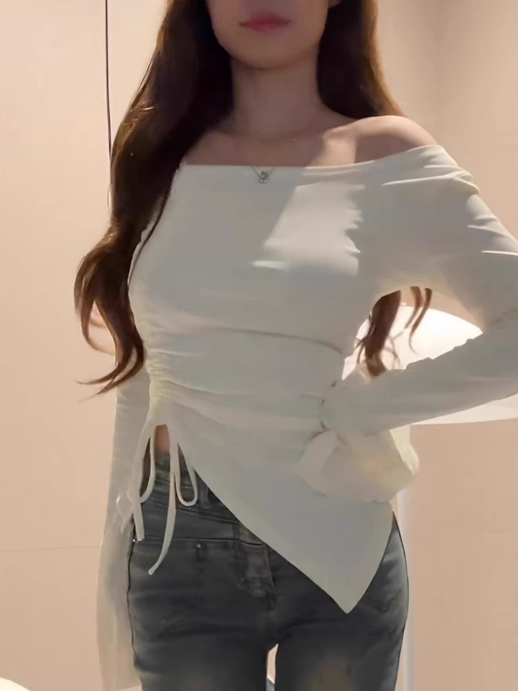 가을 디자인의 여성용 한국 핫걸 드로스트링 원숄더 탑, 니치 오프숄더 이너 레이어드 셔츠, 긴팔 티셔츠