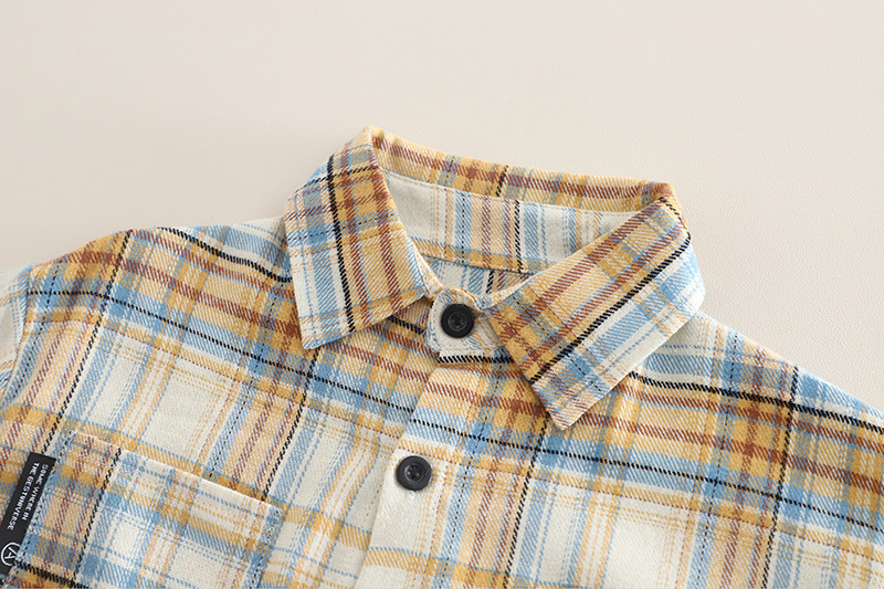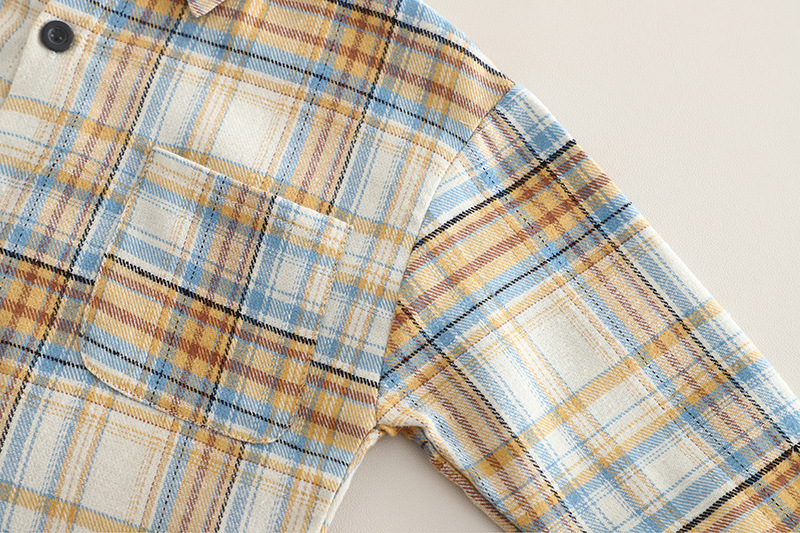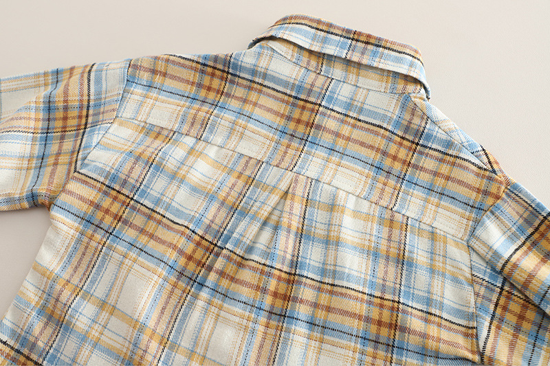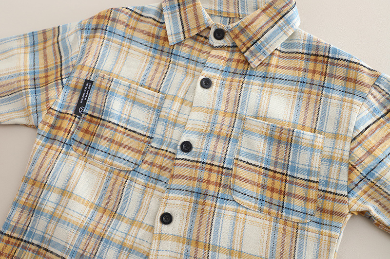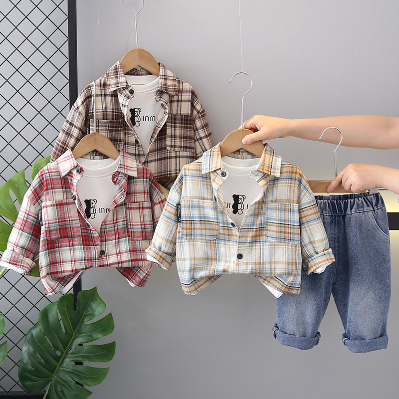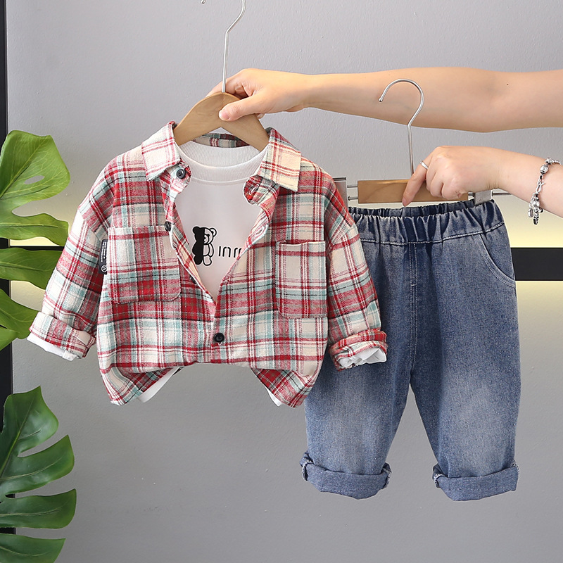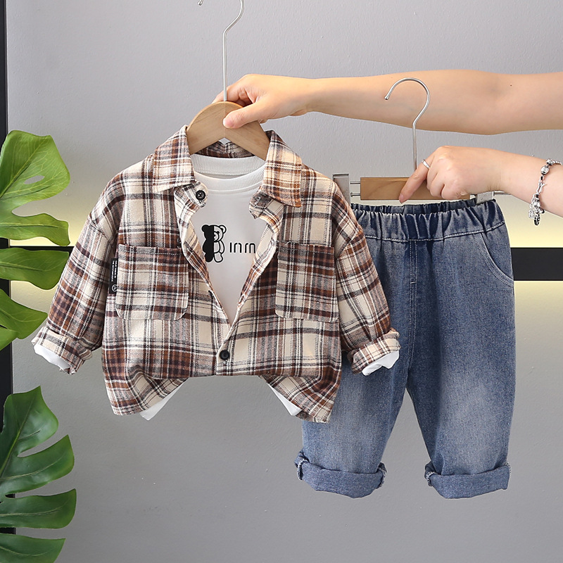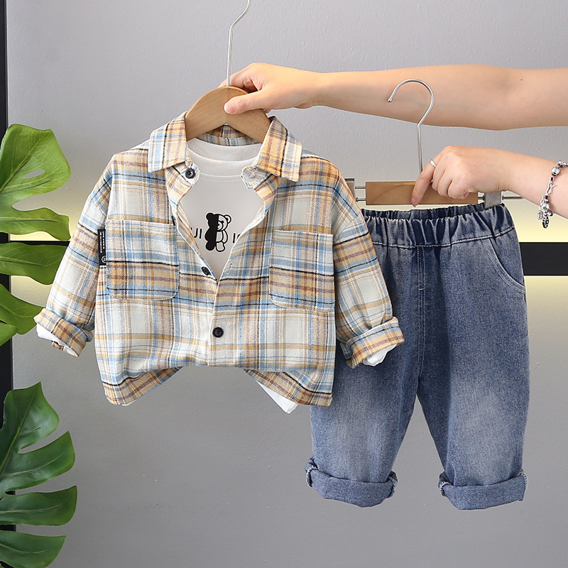 한국 가을 남아 긴팔 양복, 아동 패션, 아기 스트리트 체크무늬 긴팔 3피스 트렌디 세트스토어 가기