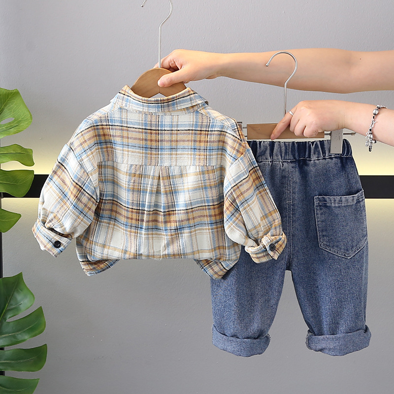 한국 가을 남아 긴팔 양복, 아동 패션, 아기 스트리트 체크무늬 긴팔 3피스 트렌디 세트