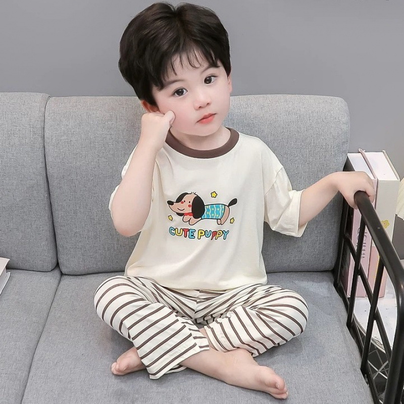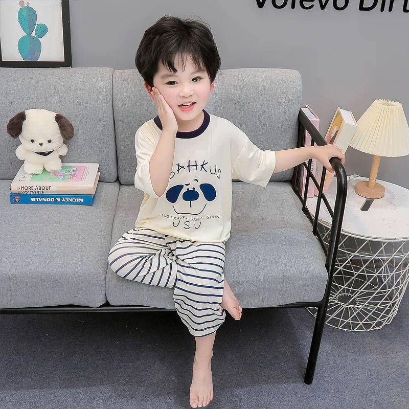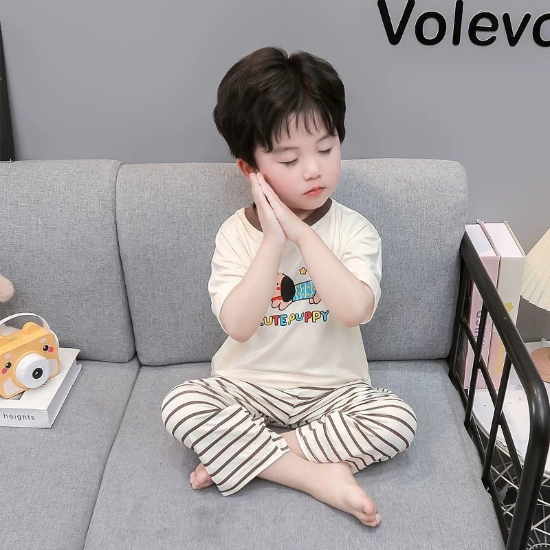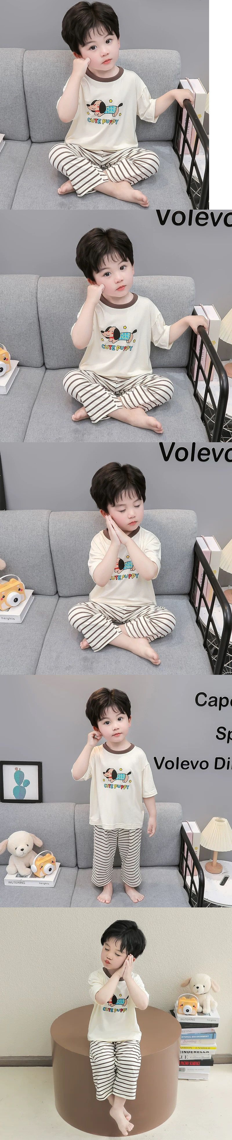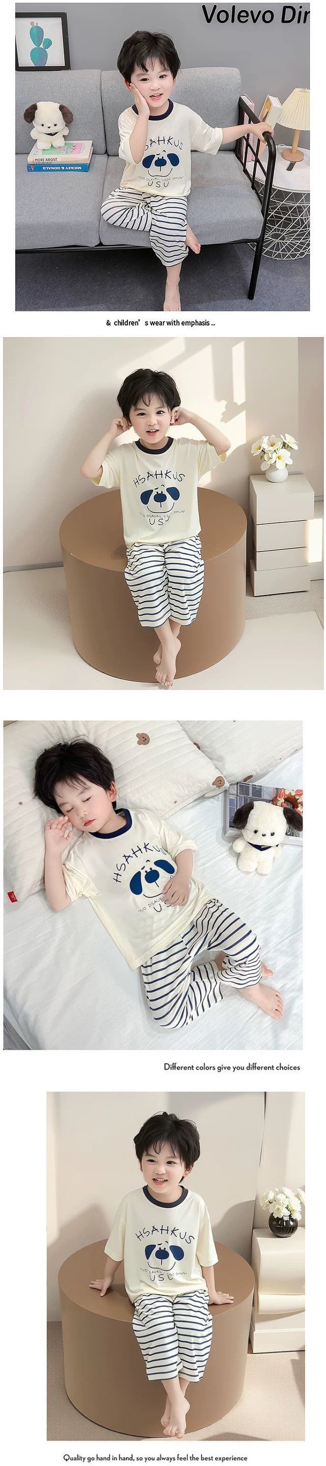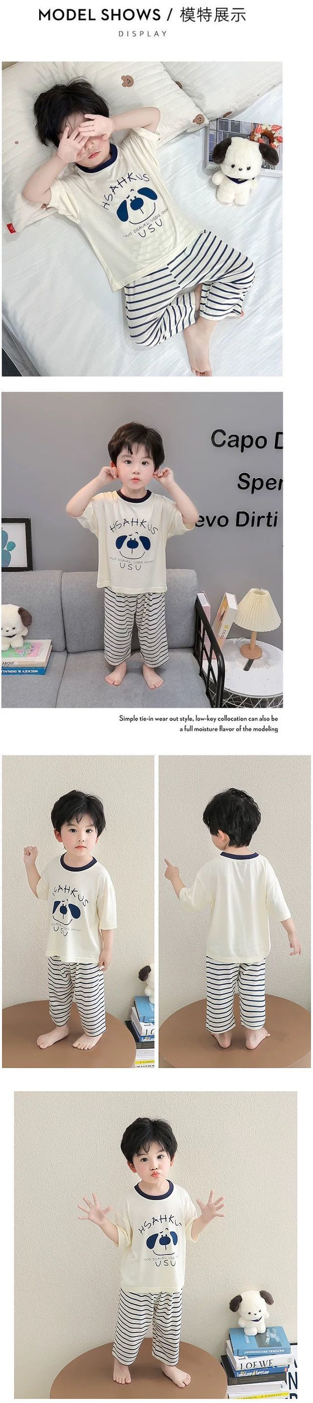 소년 잠옷 여름 얇은 소년 에어컨 옷 아기 만화 줄무늬 바지 정장 어린이 가정 의류 새로운 스타일스토어 가기