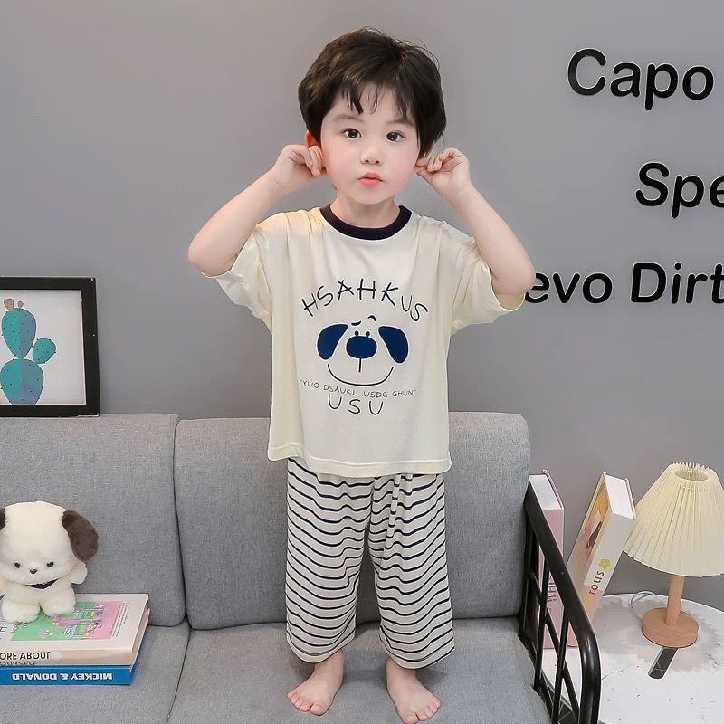 소년 잠옷 여름 얇은 소년 에어컨 옷 아기 만화 줄무늬 바지 정장 어린이 가정 의류 새로운 스타일