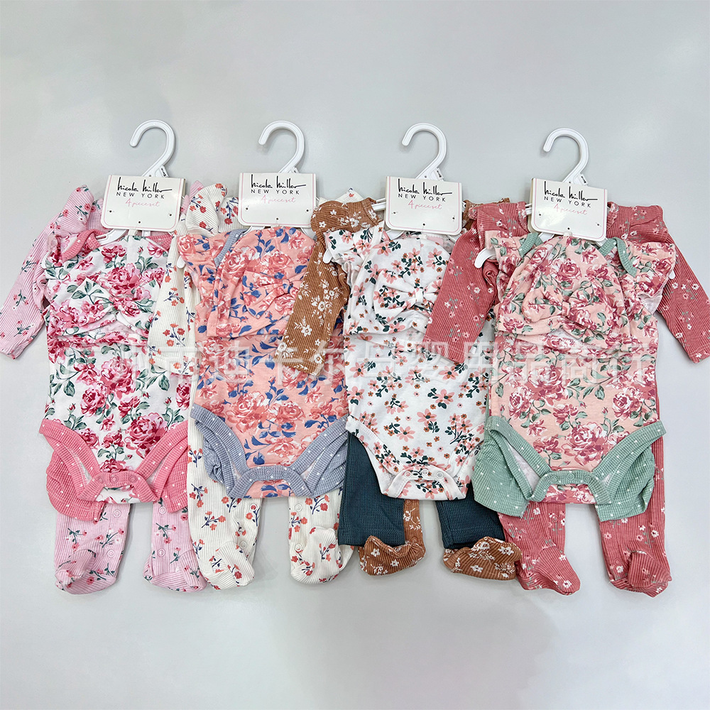 유럽과 미국의 아기 꽃무늬 원피스 롱 크롤링 보우 모자 4피스 스페인 스타일스토어 가기