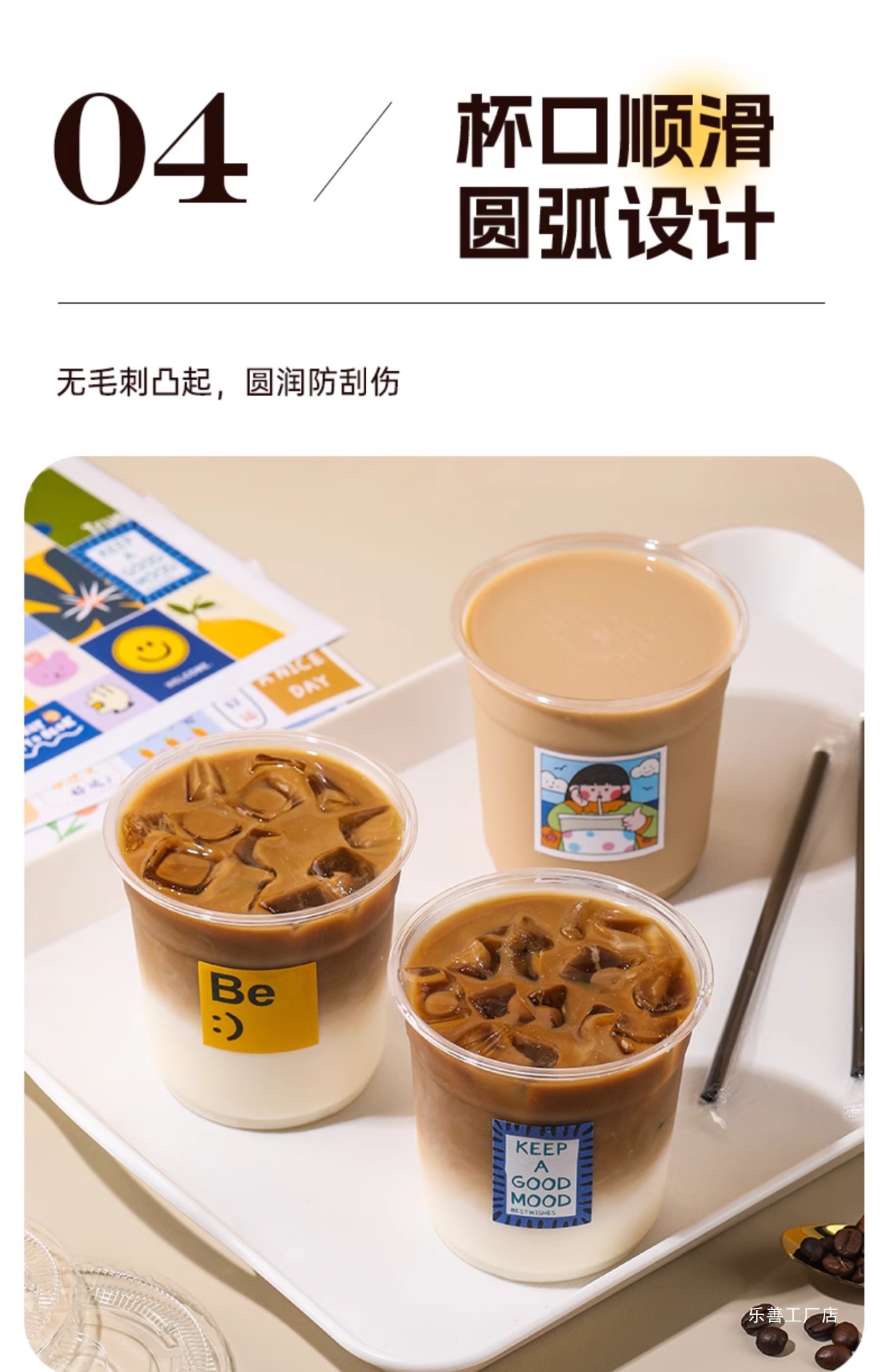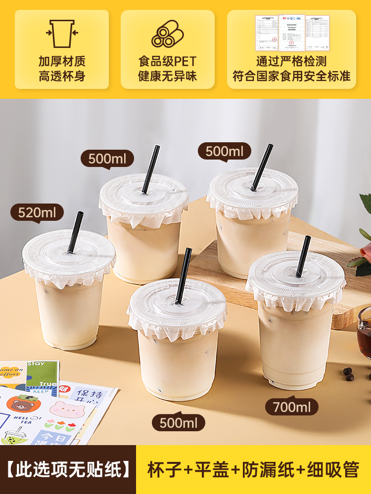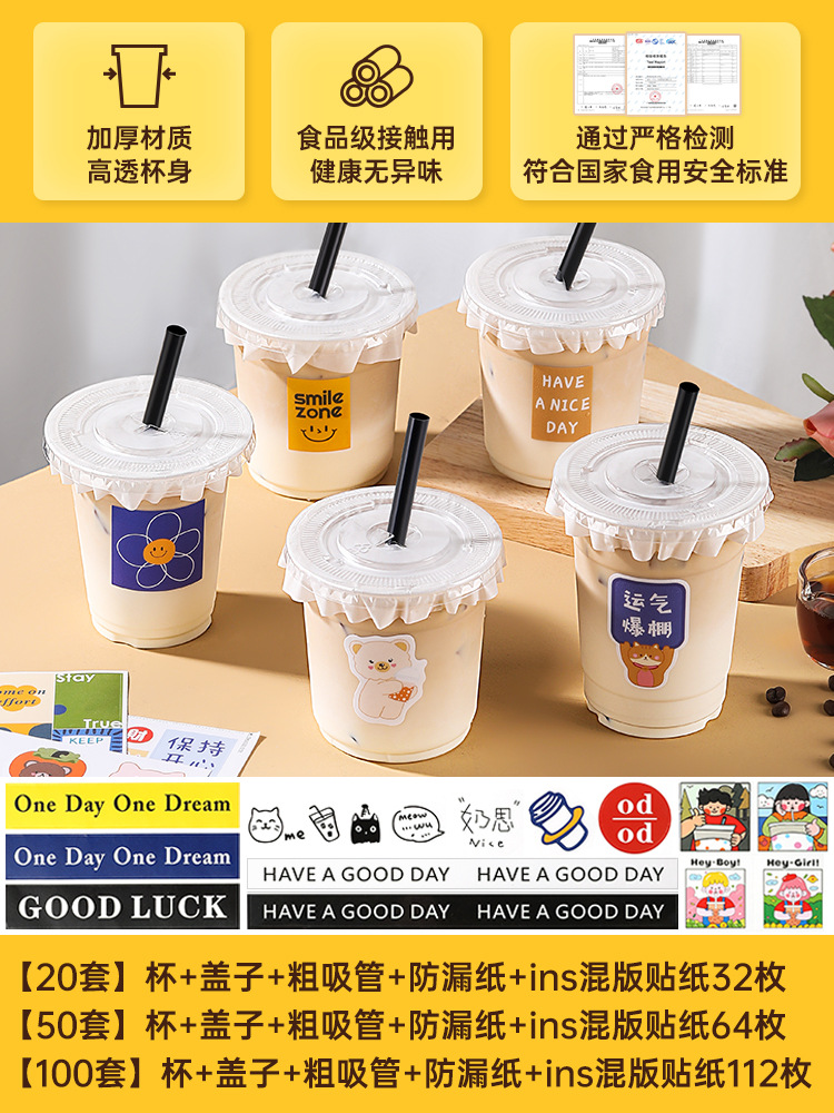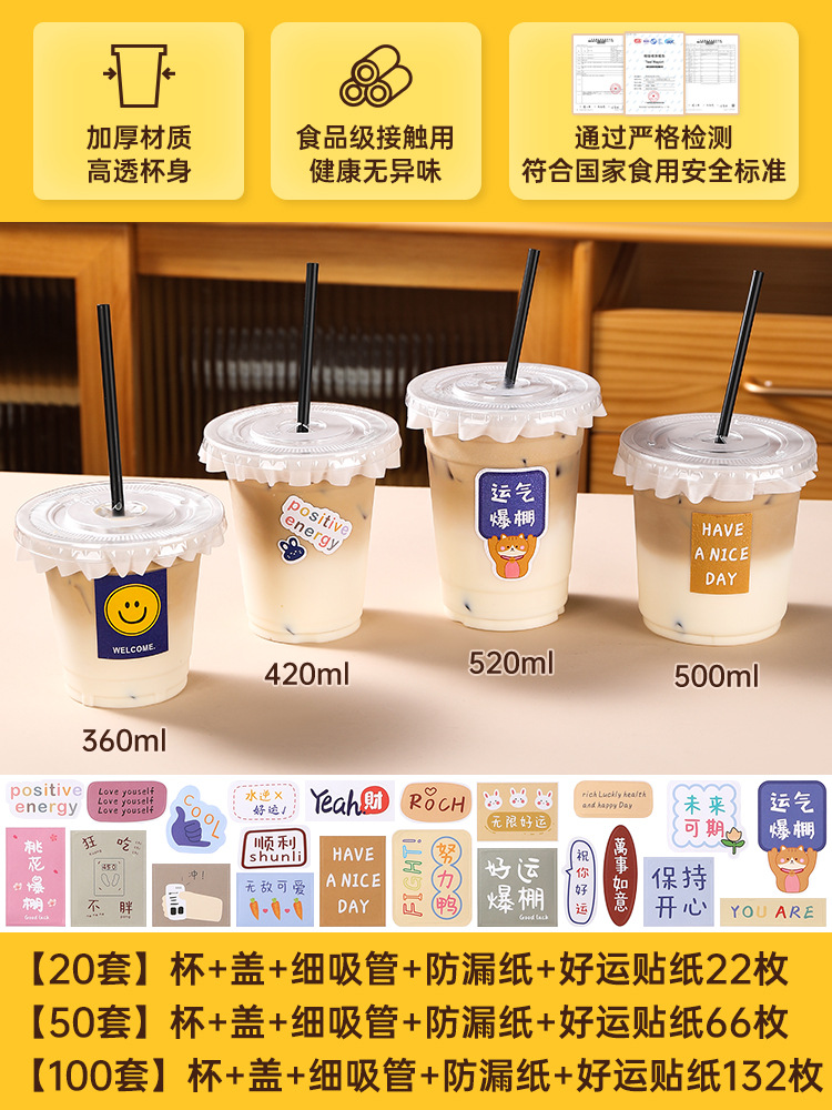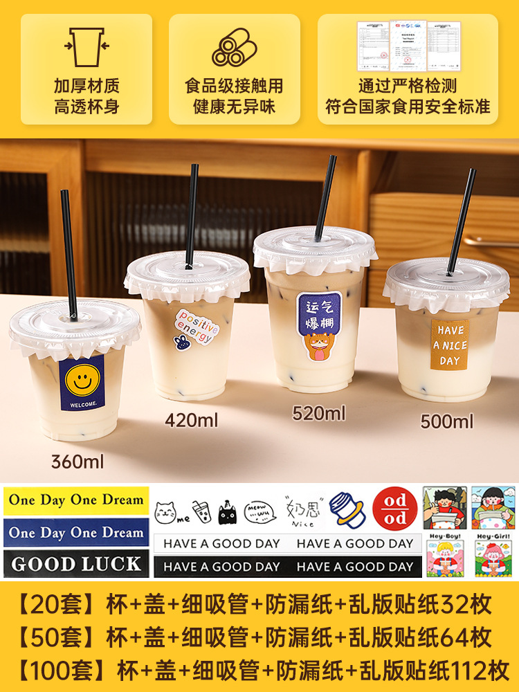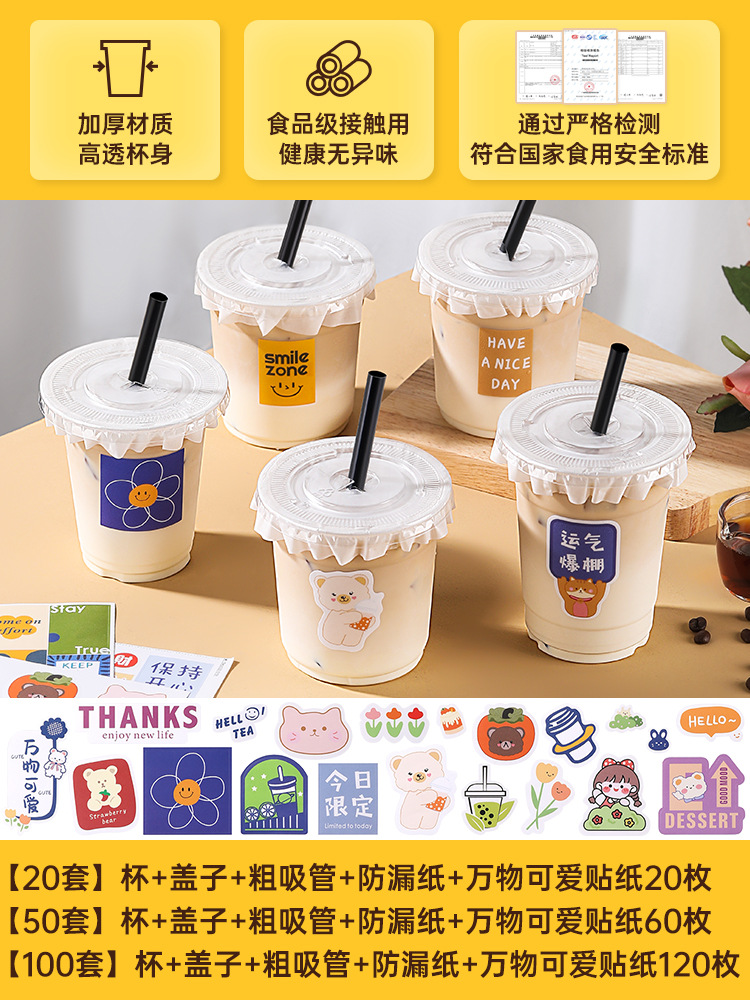 • 귀여운 스티커컵+뚜껑+얇은 빨대+누수방지지-100개-520ml