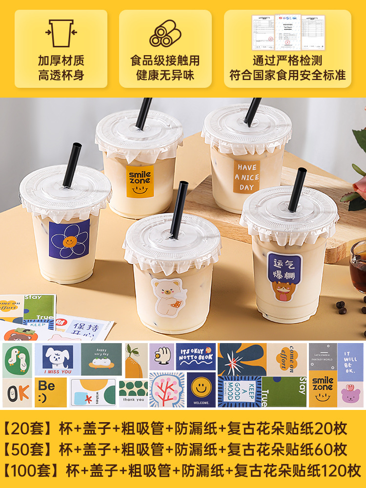 • 레트로 스티커 컵 + 뚜껑 + 진주 빨대 + 누수 방지 종이 - 50개 - 500ml