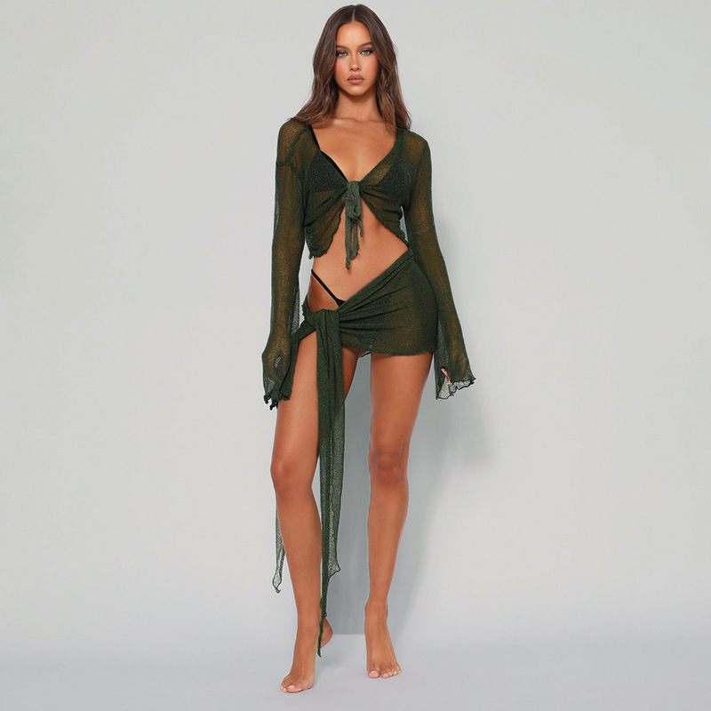 유럽과 미국 의류 2025 새로운 여름 스타일 약간 반투명 스트랩 메쉬 긴팔 가슴 탑 캐주얼 스커트 정장 도매