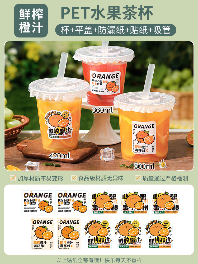 • 갓 짜낸 오렌지 주스 특수형 컵 + 뚜껑 + 두꺼운 빨대 + 누수 방지 종이 - 10개 - 500ml