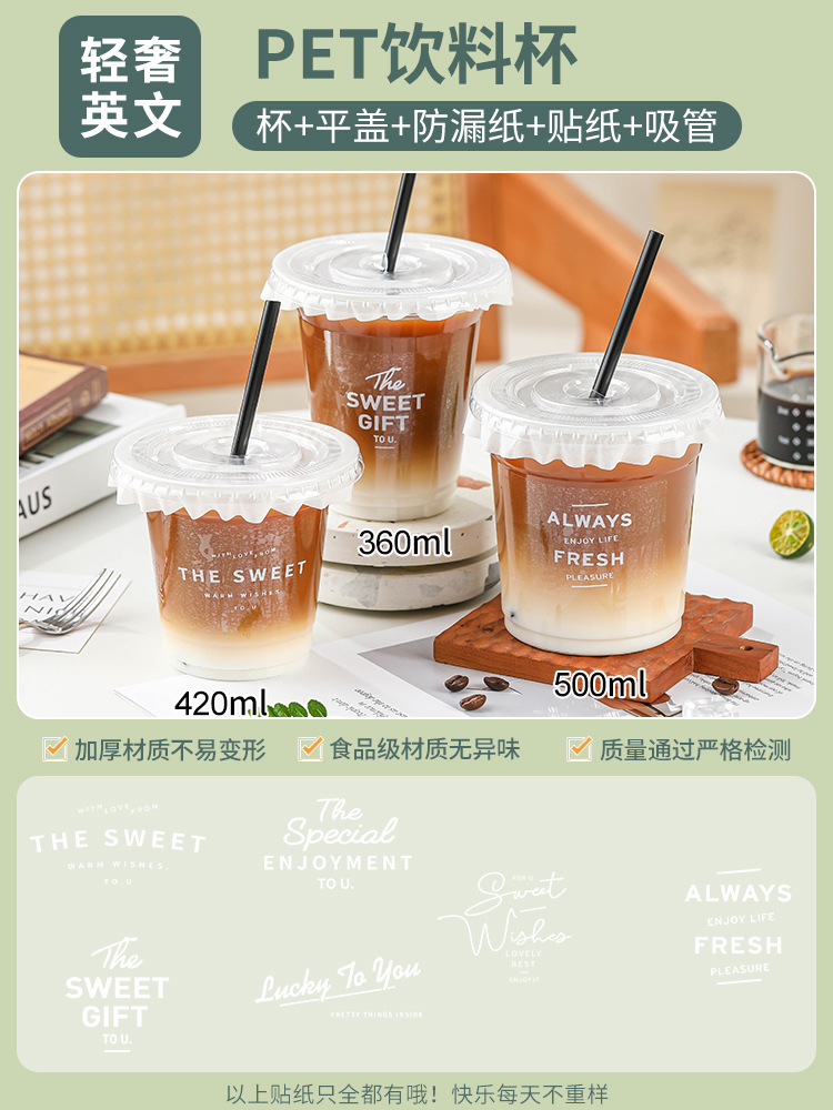 • 라이트 럭셔리 잉글리시 스티커 컵 + 뚜껑 + 얇은 빨대 + 누수 방지 종이 - 50개 - 420ml