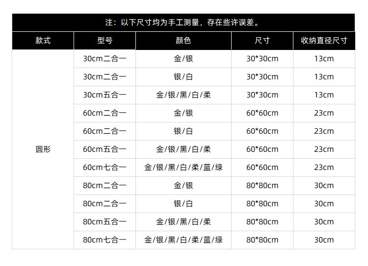 • 90*120CM(휴대용) 골드, 실버, 화이트, 소프트 및 블랙 5-in-1