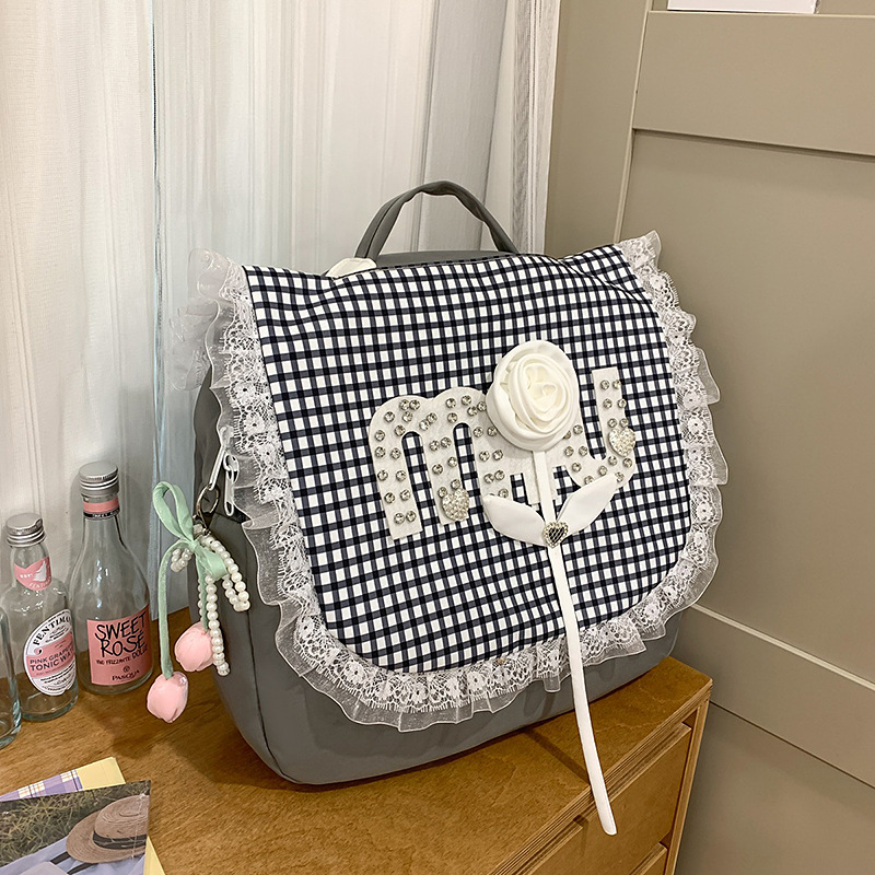 귀여운 만화 소녀 작은 배낭 학생 가방 격자 무늬 배낭 레이스 장식 여름 도파민 여성 핸드백