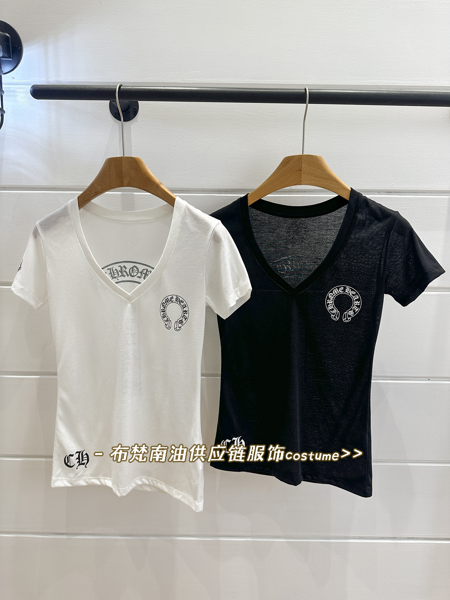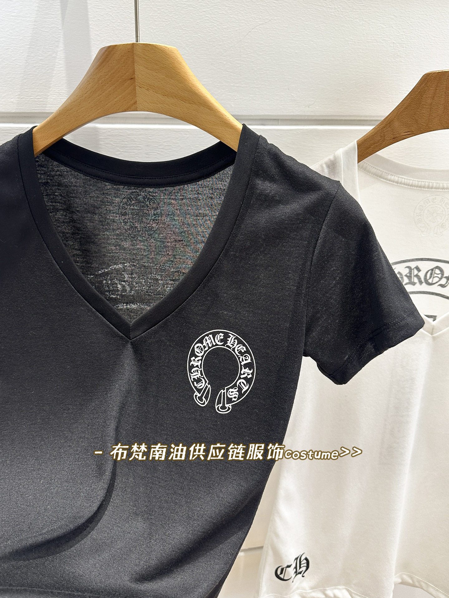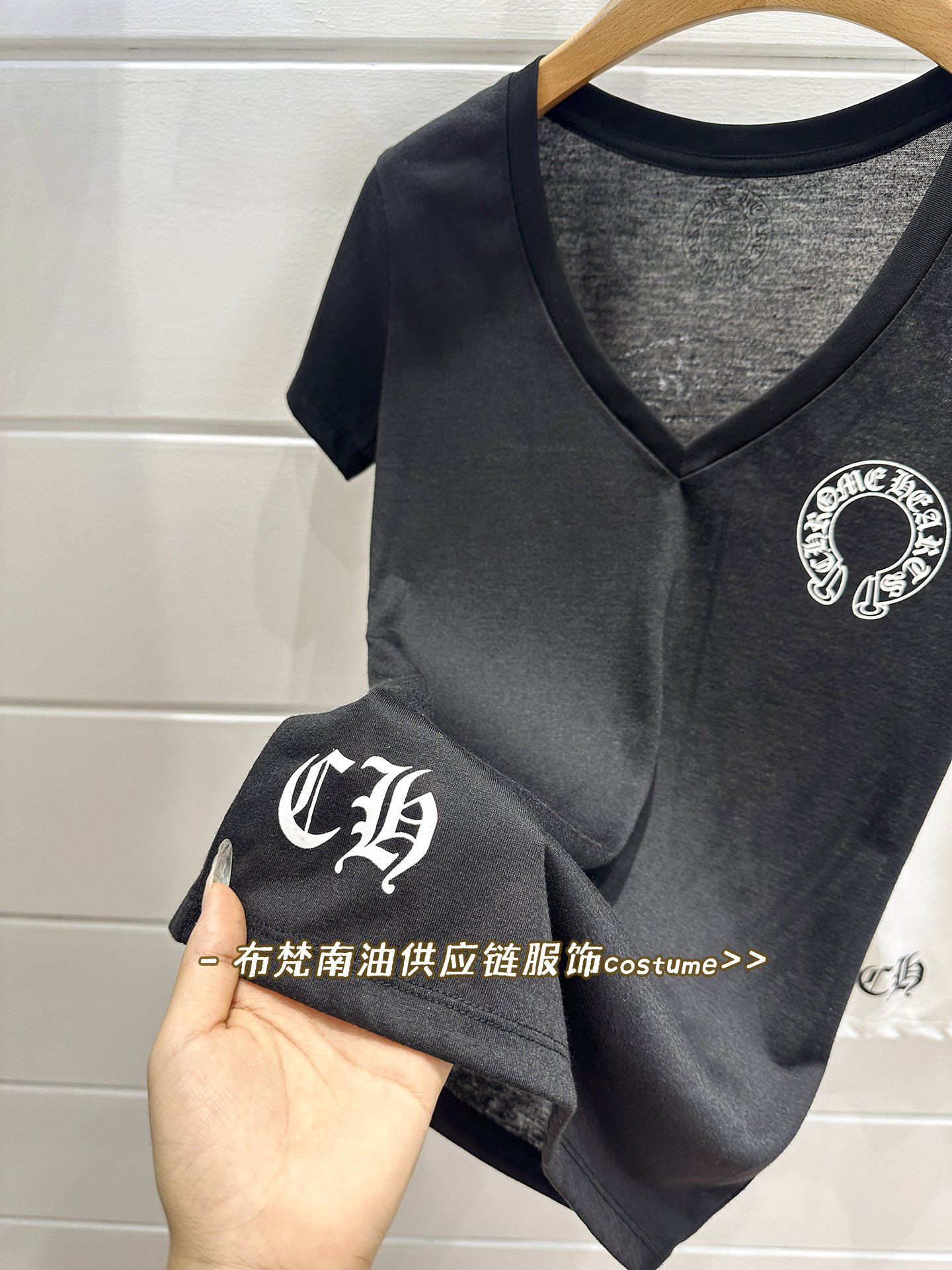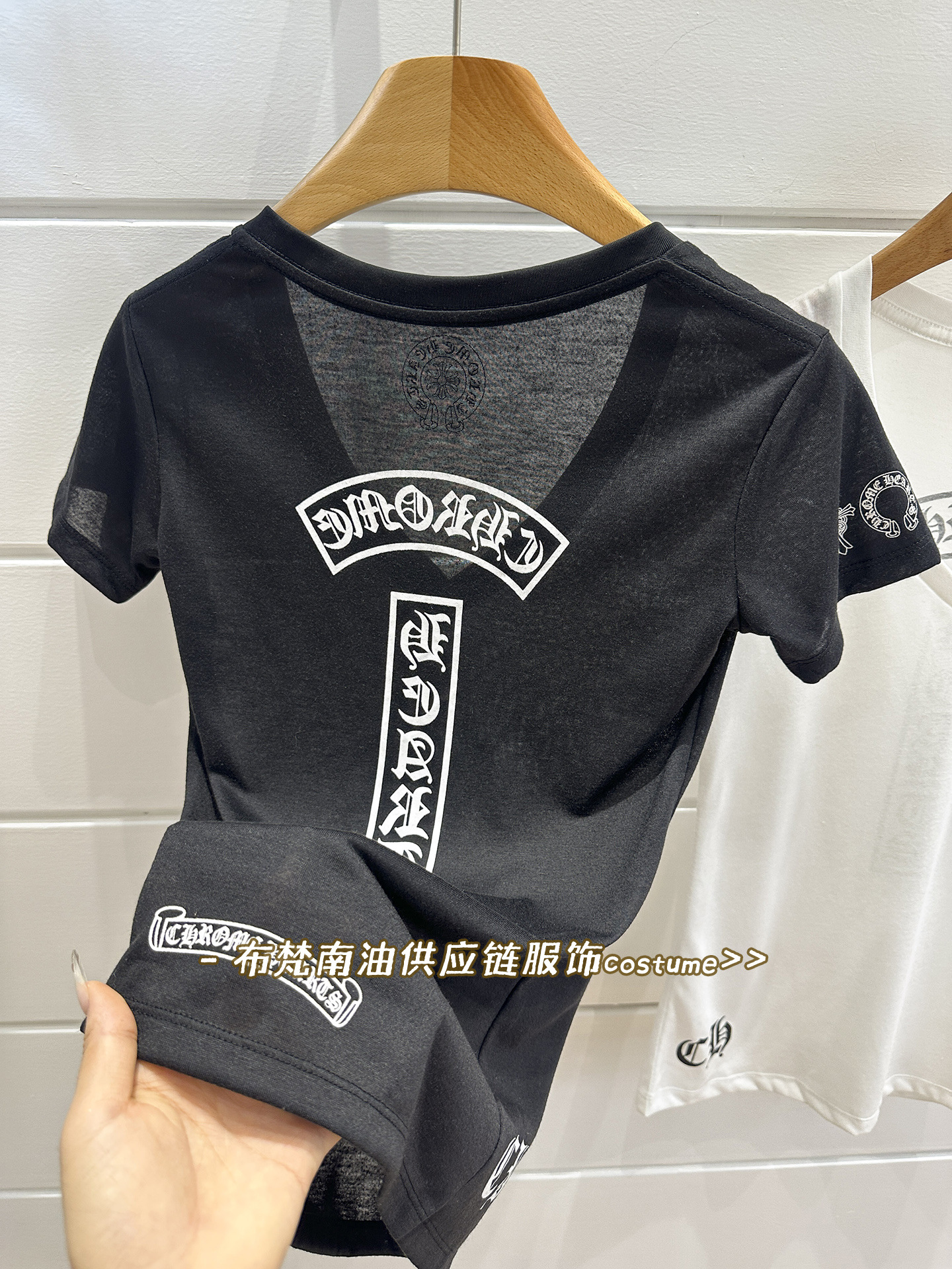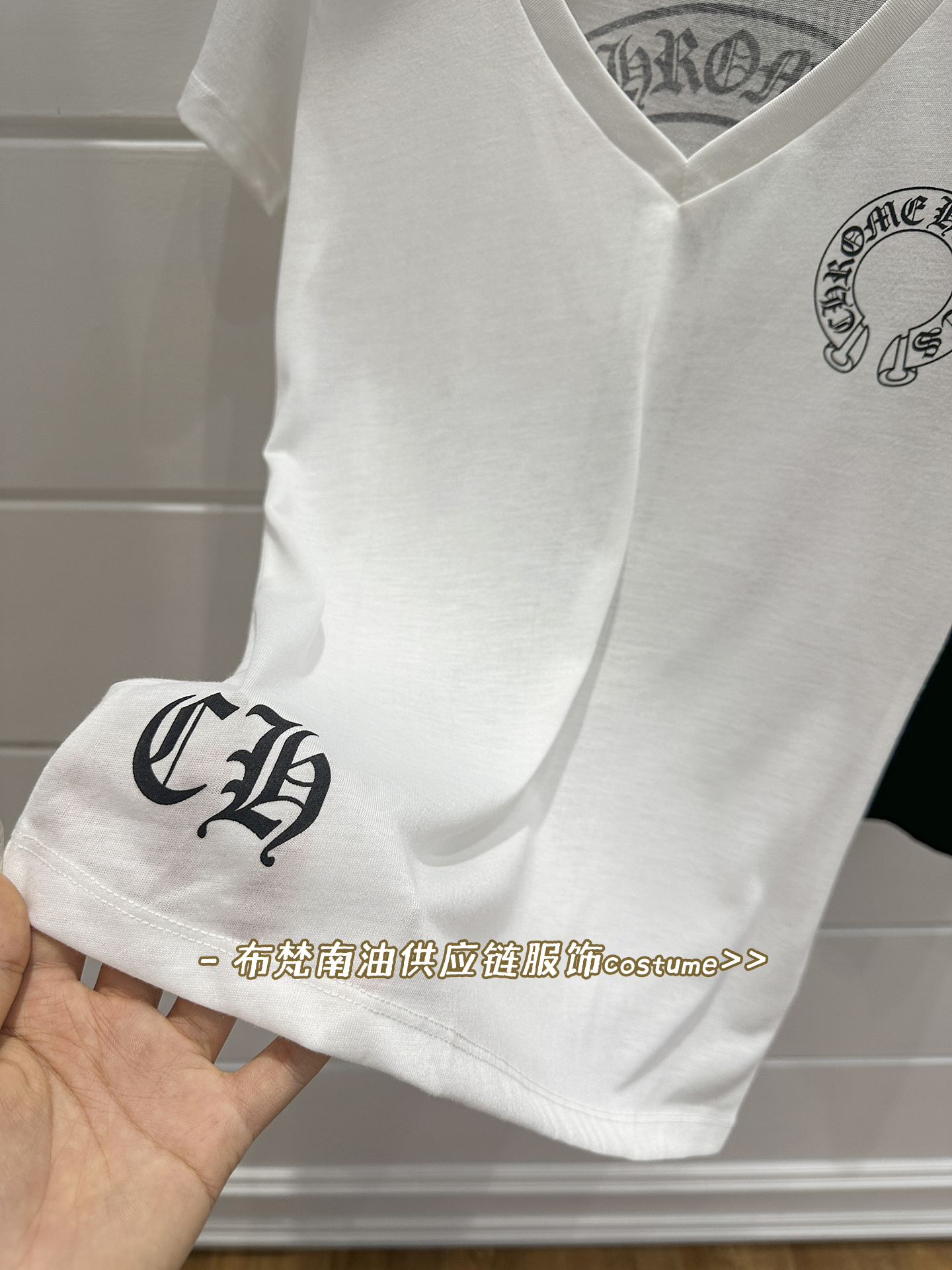 Shenzhen Nanyou Correct Edition CH 산스크리트 크로스 프린트 V 넥 반팔 티셔츠 여성용 25 여름 신작 슬림 탑스토어 가기