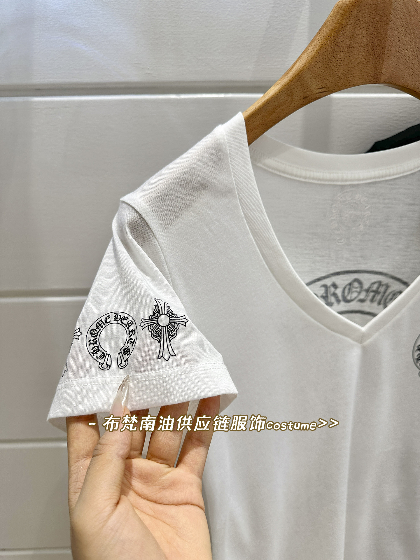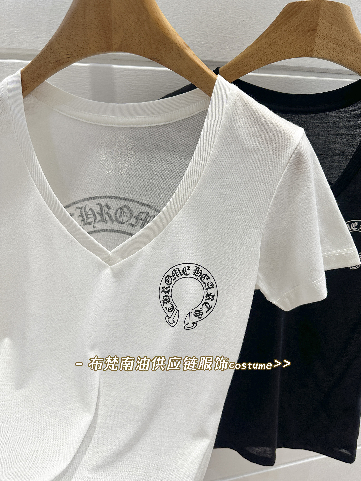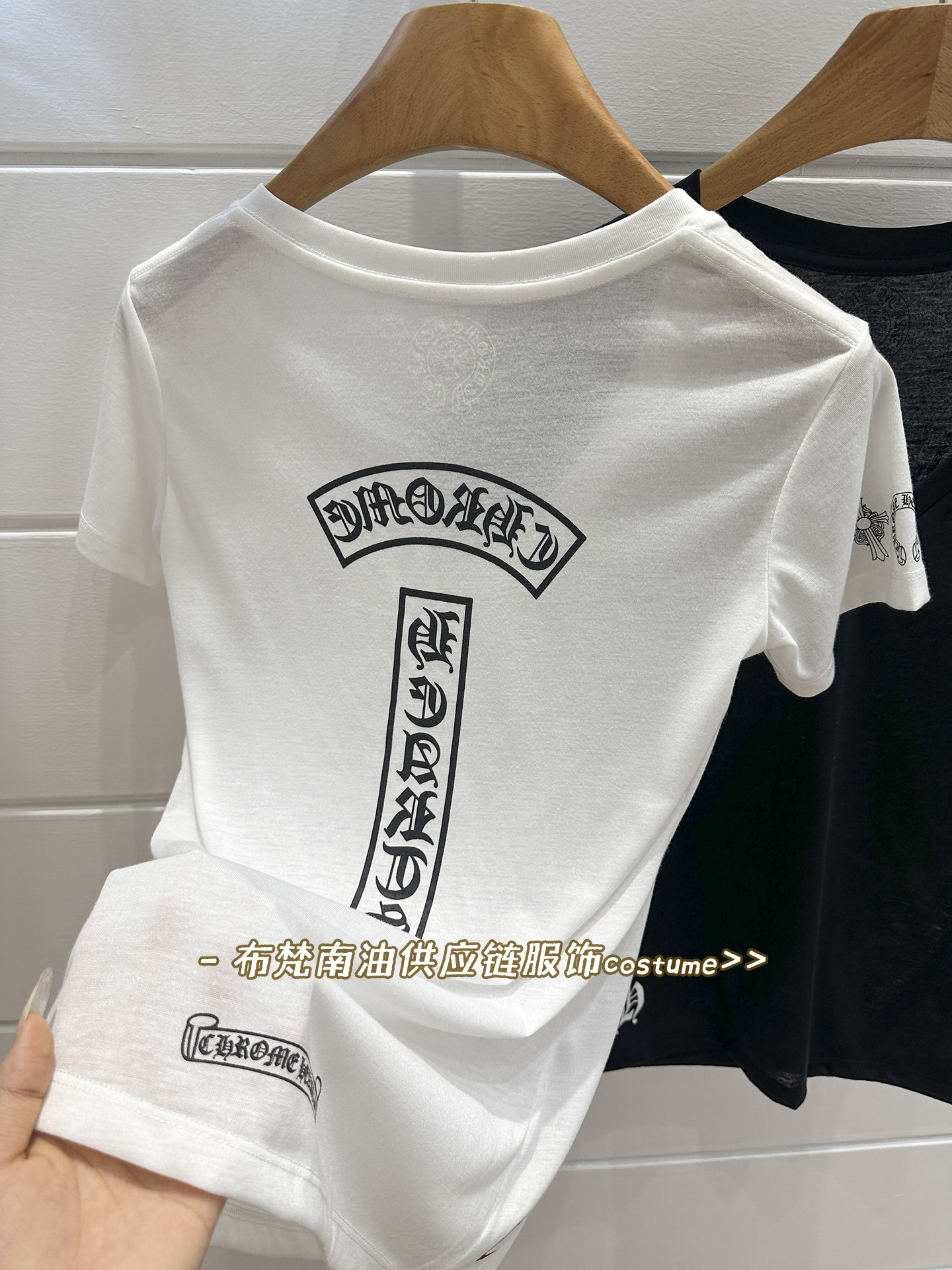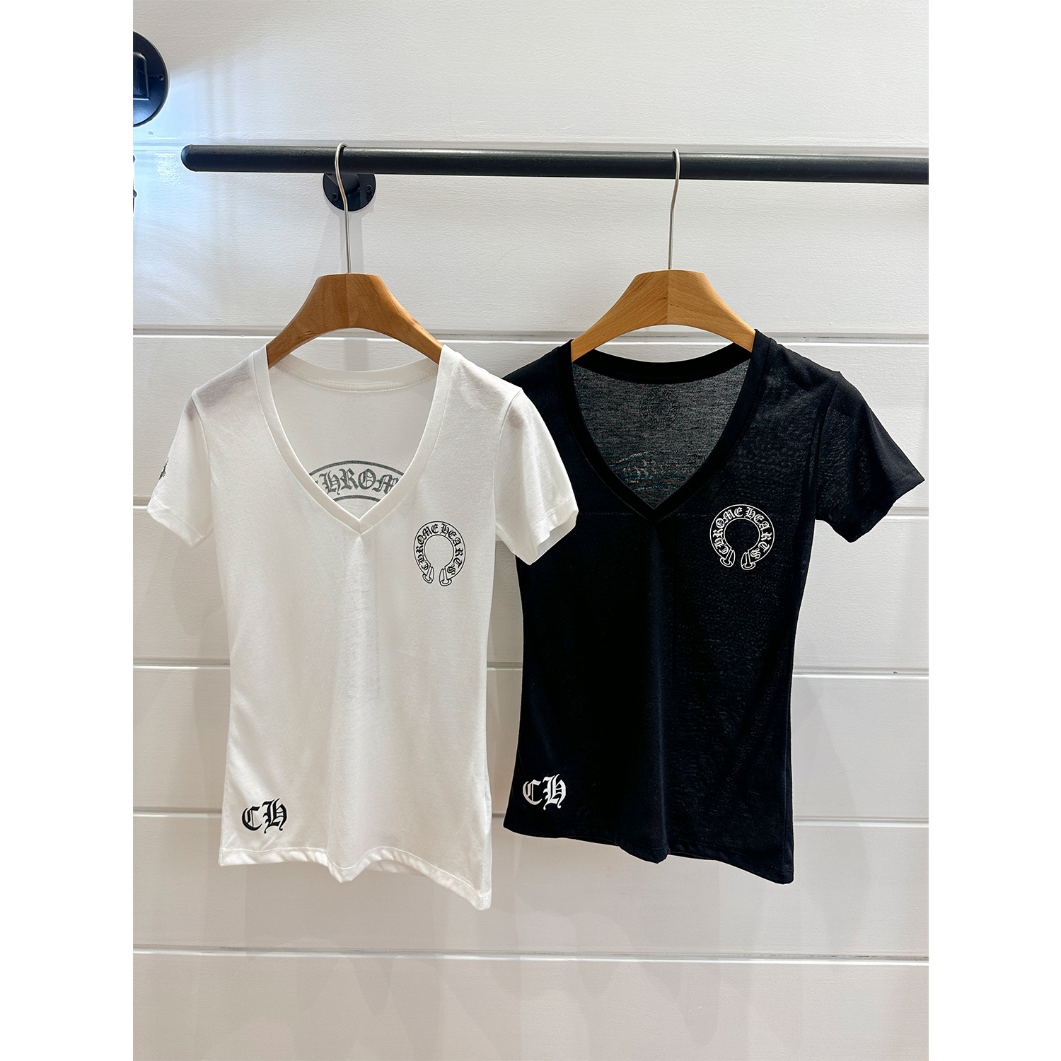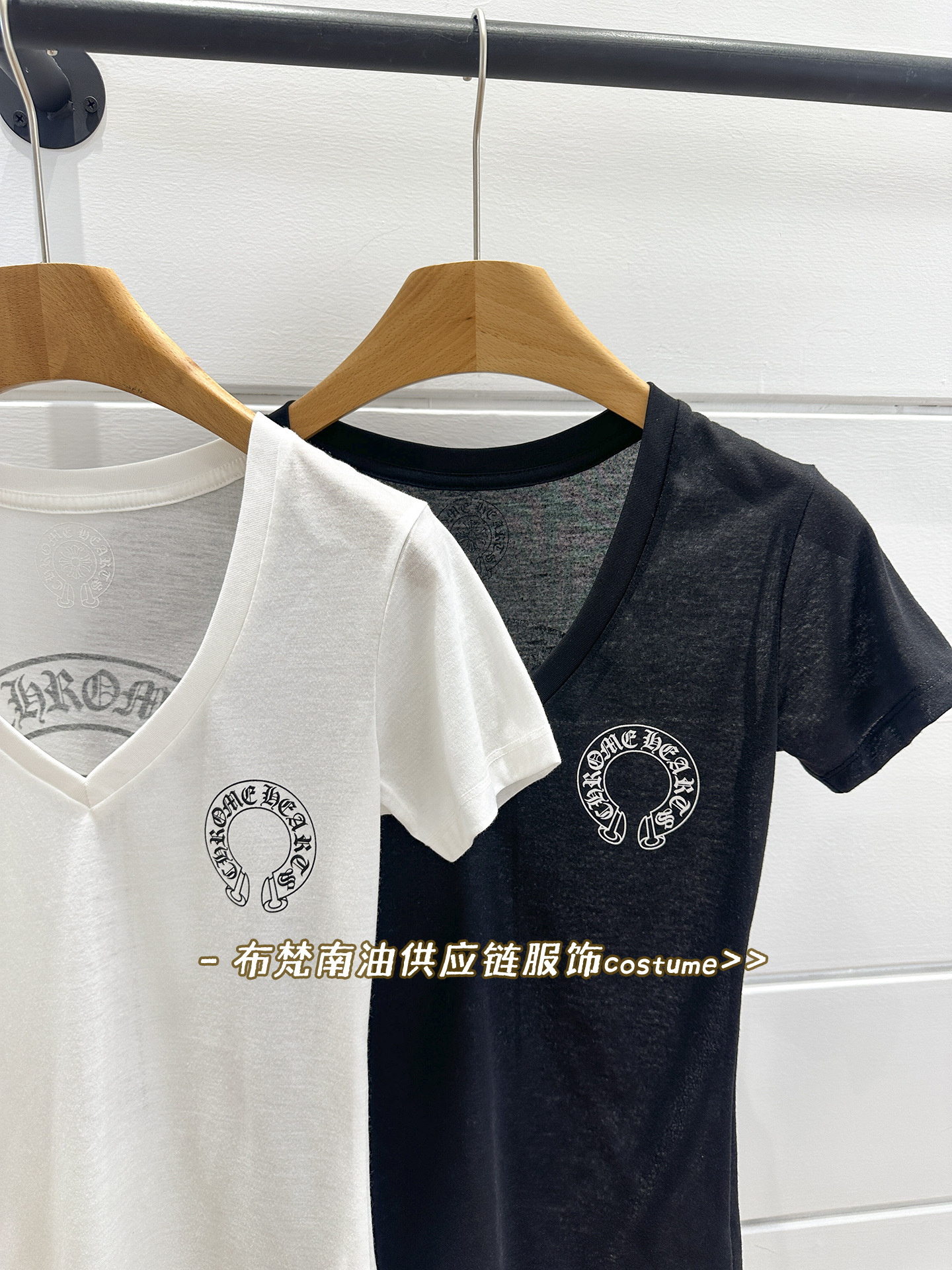 Shenzhen Nanyou Correct Edition CH 산스크리트 크로스 프린트 V 넥 반팔 티셔츠 여성용 25 여름 신작 슬림 탑스토어 가기