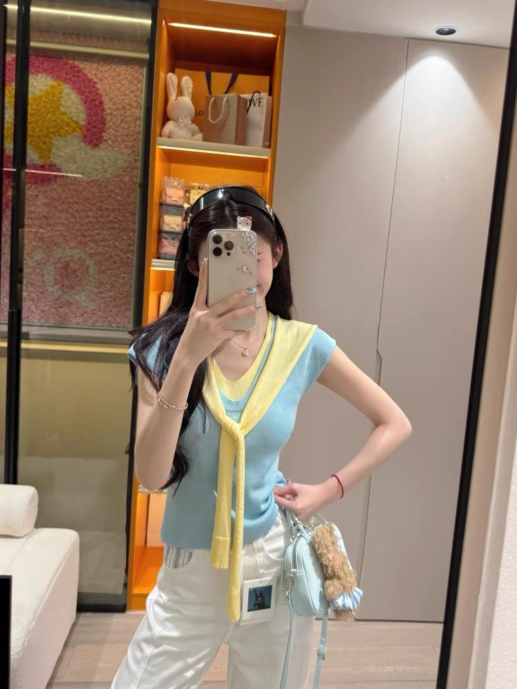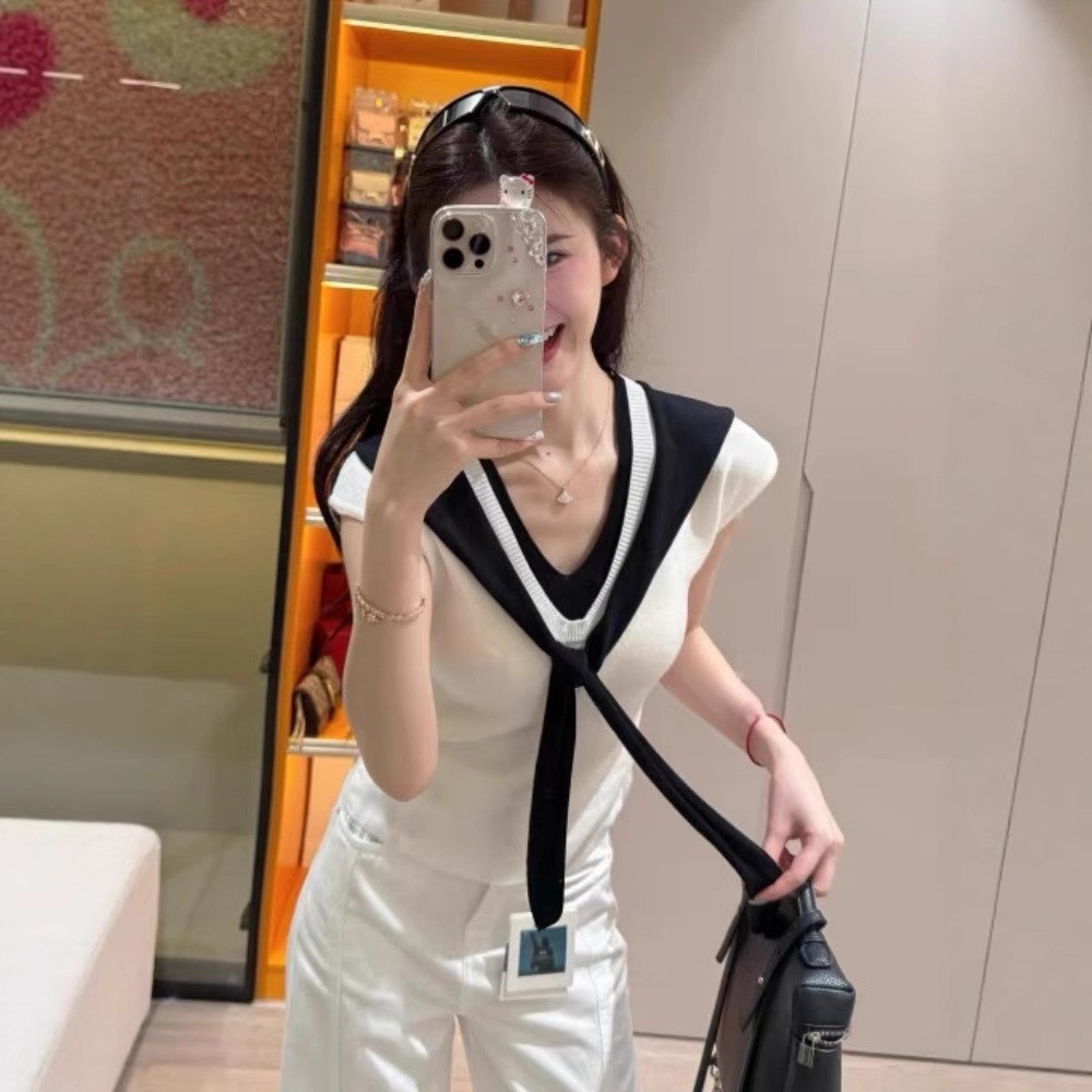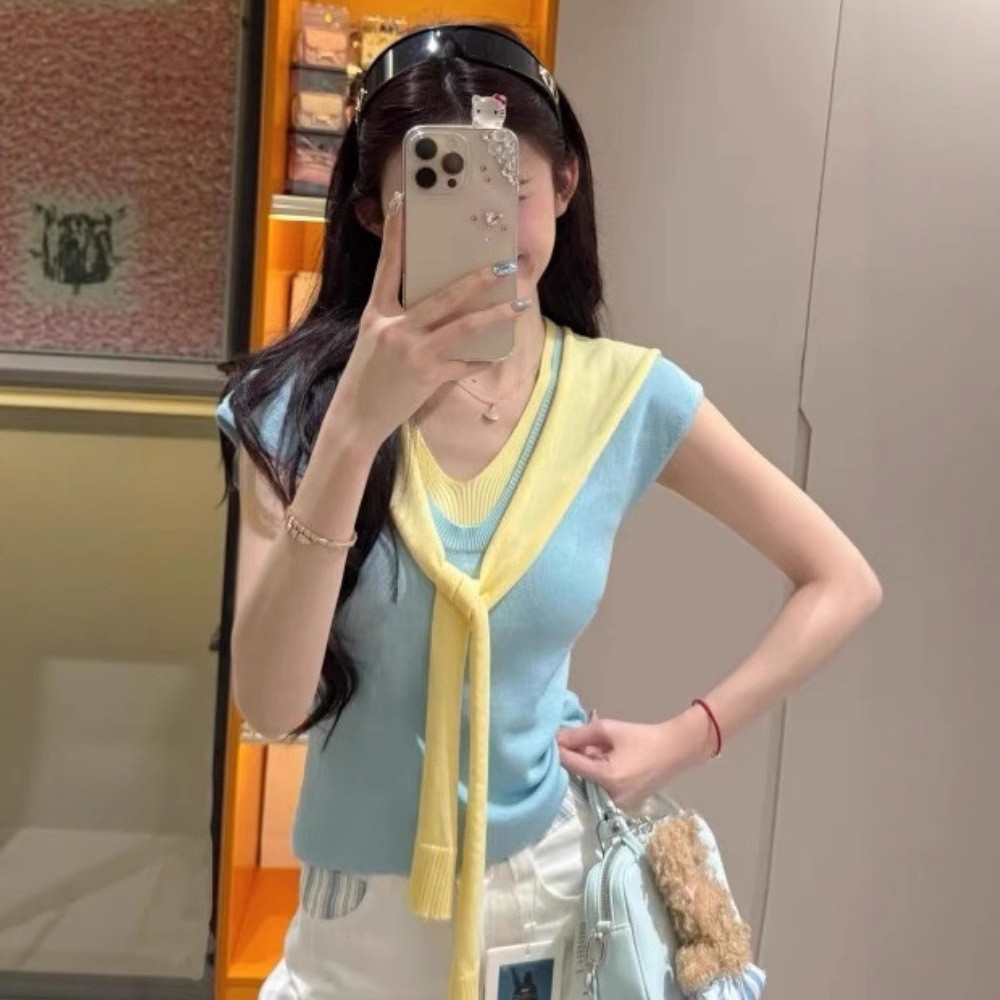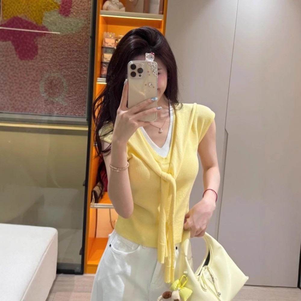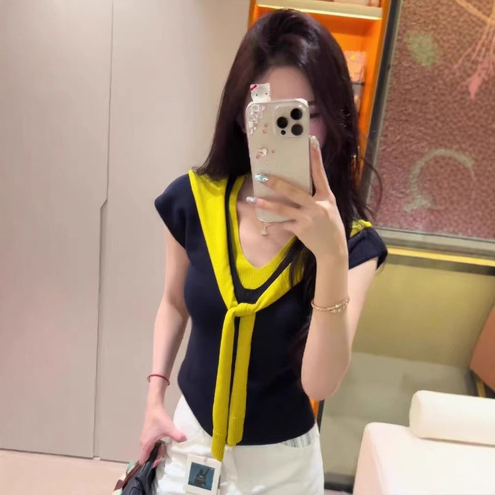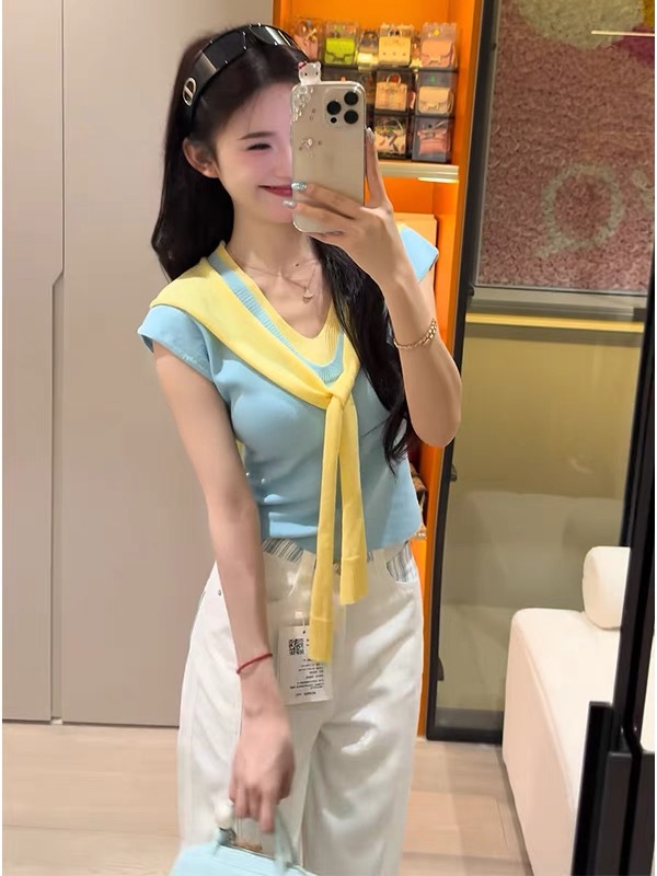 여성용 한국식 레이스 숄 니트 반팔 티셔츠 여름 2025 새로운 도파민 슬림핏 작은 플라잉 슬리브 쇼트 탑스토어 가기