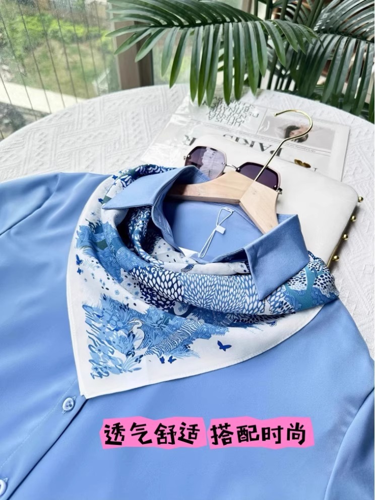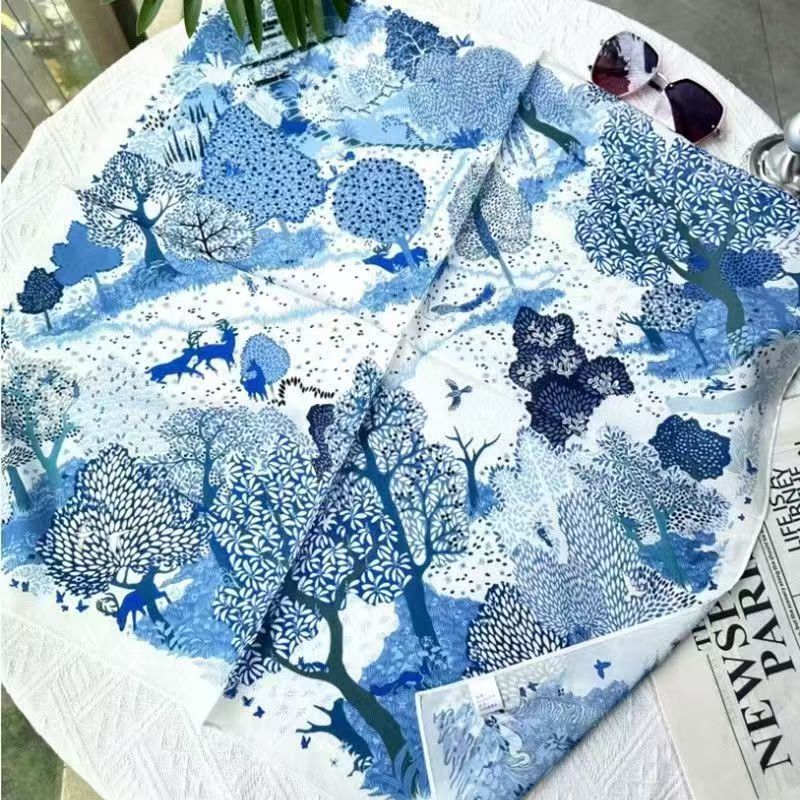 100% 뽕나무 실크 블루 포레스트 실크 크레페 드 신 스카프 봄과 여름 여성 봄, 가을 하이 엔드 복고풍 실크 스카프