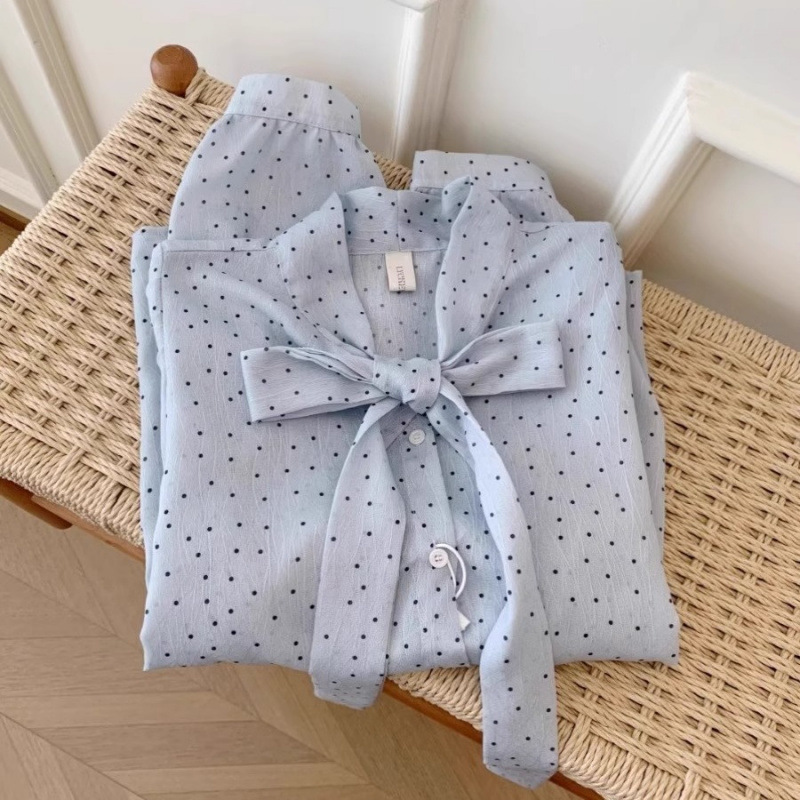 프렌치 스타일의 가볍고 성숙한 여성용 보우 블루 폴카 도트 쉬폰 셔츠, 초가을, 작은 기질, 루즈한 긴팔 탑스토어 가기