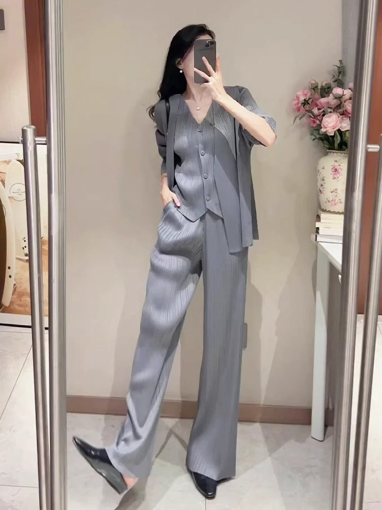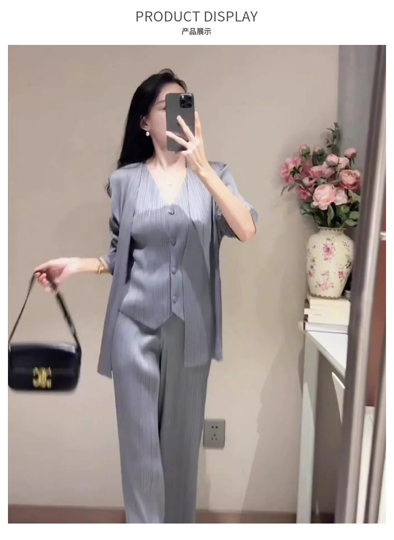 미야케 2025 봄 신작 슈트 슬림 캐주얼 팬츠 여성 다용도 주름 솔리드 컬러 조끼 3 피스 세트
